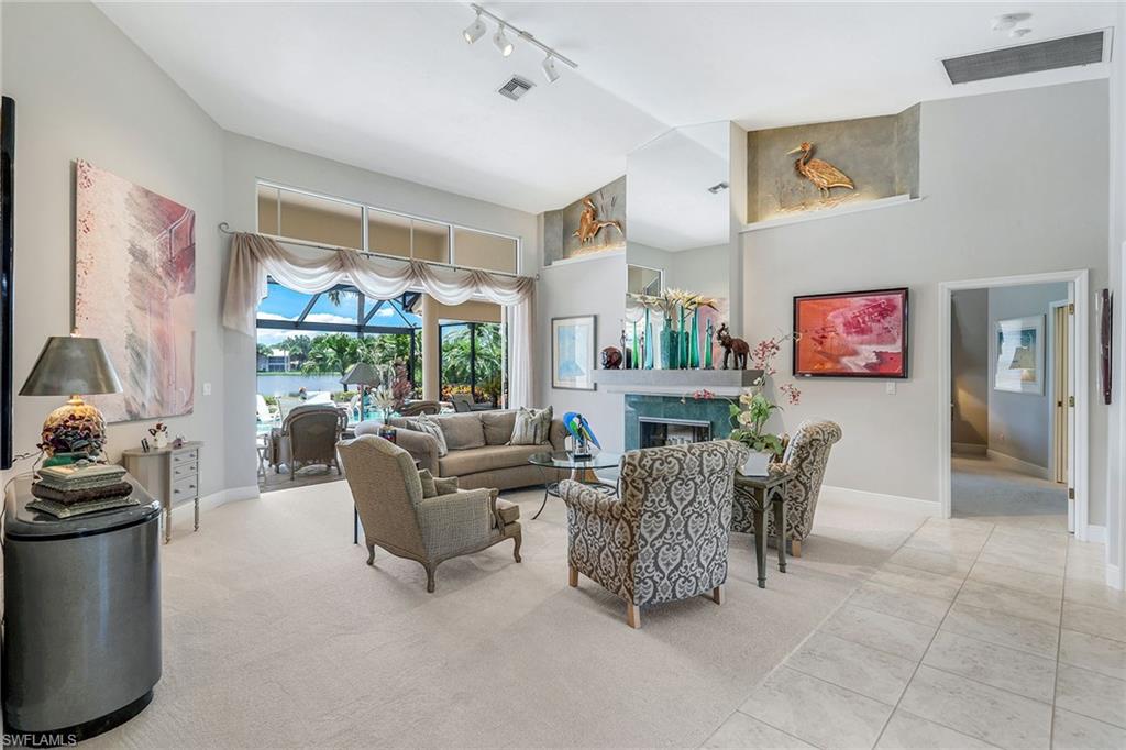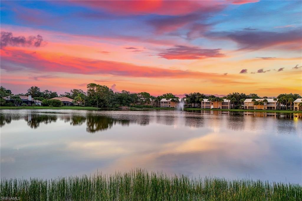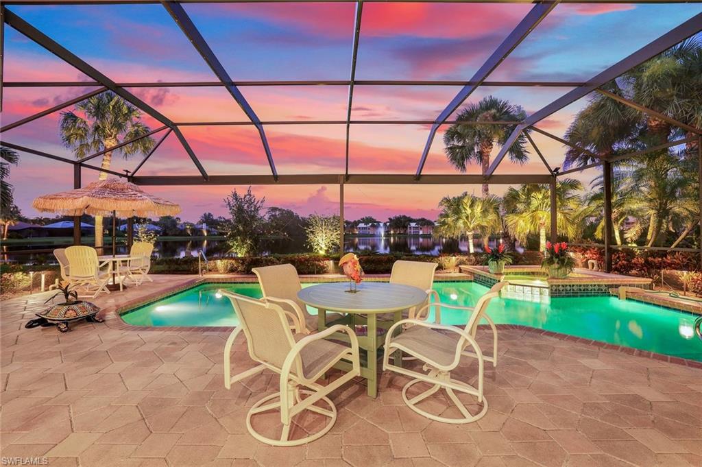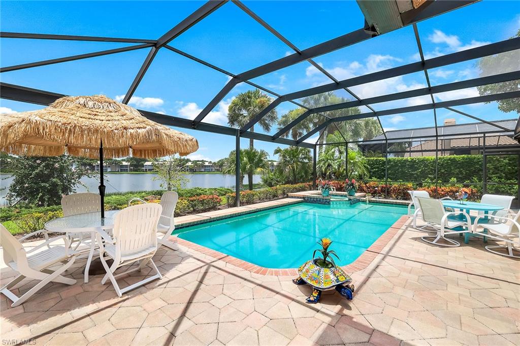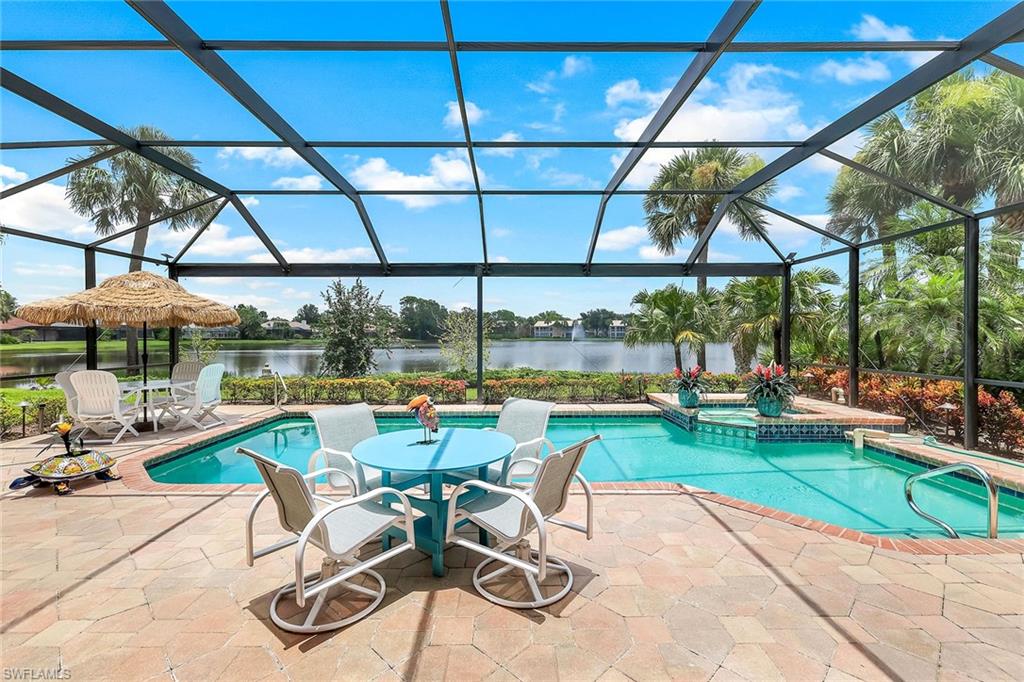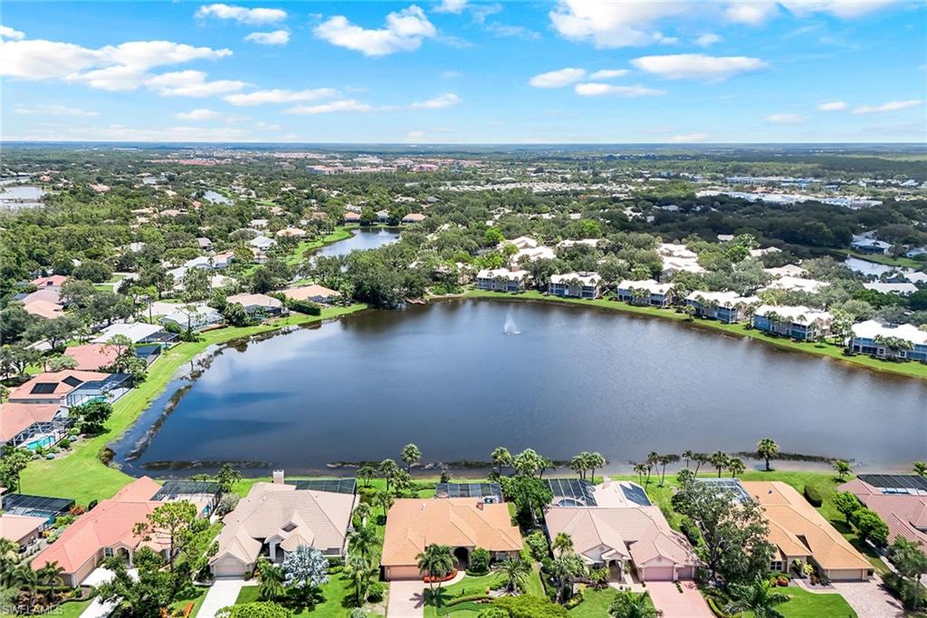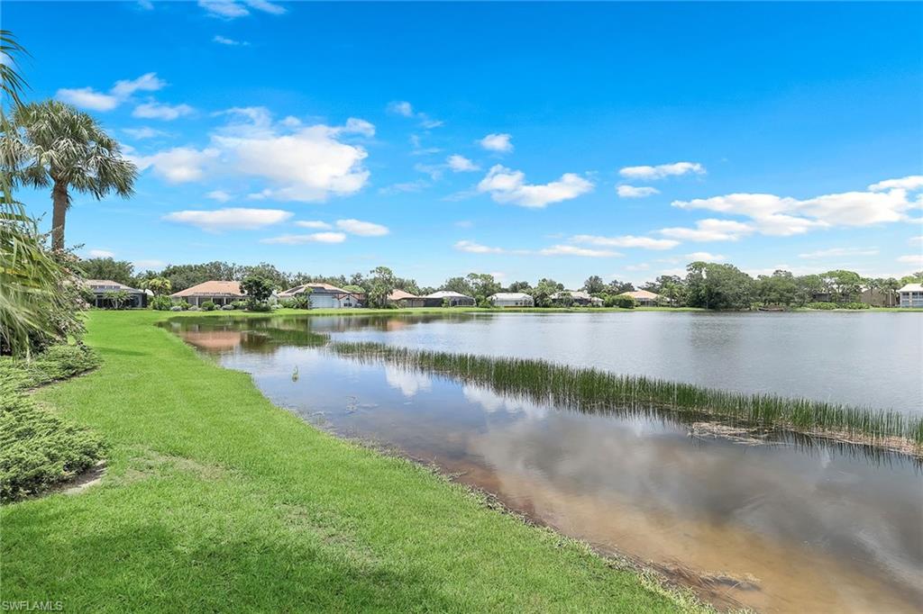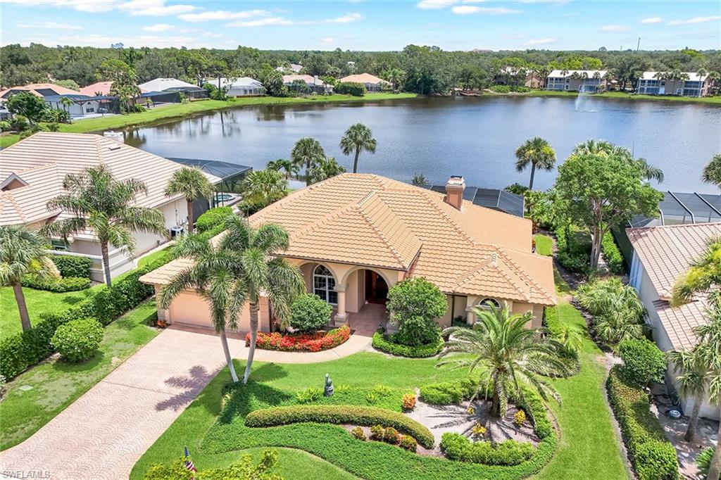 Welcome to this serene lakeside retreat in the heart of Pelican Landing, where tranquil water views serve as the ideal backdrop for refined Southwest Florida living. Known for the iconic pelican statue that greets visitors at front, this beautifully maintained residence features three bedrooms plus a den, two full baths, two half baths and a side-load two-car garage with additional storage. Thoughtfully designed with expansive ceilings and a split floor plan, the layout provides privacy and openness. A formal living room and a separate family room each offer relaxing views of the shimmering lake beyond. A wood-burning fireplace between the living room and the primary suite adds warmth and character. The gourmet kitchen includes one-piece granite countertops, a central island and a wet bar—ideal for everyday use and entertaining alike. Modern updates include replacement of all single-hung windows with impact-resistant glass (2024), a new air-conditioning system (June 2025), water heater (2023), screen enclosure (2017) and roof (2017). The primary and guest baths feature updated cabinetry, and the primary suite has been enhanced with on-trend elements. Outdoor living is elevated with an expansive screened lanai featuring a large pool, ample covered space and sweeping, unobstructed views of the lake, offering beauty and privacy. Residents of Pelican Landing enjoy access to an array of premier amenities, including a 34-acre private beach park accessible by boat shuttle, tennis and pickleball centers, a kayaking park, sailing center, community fitness center, and scenic walking and biking trails. Agents see offer instructions in remarks