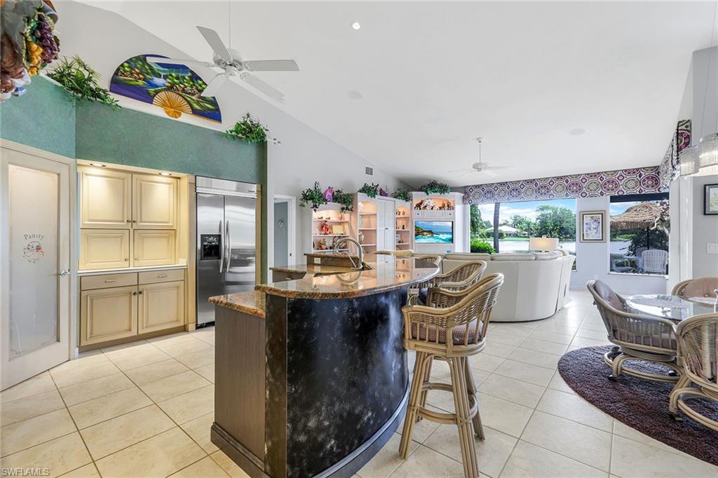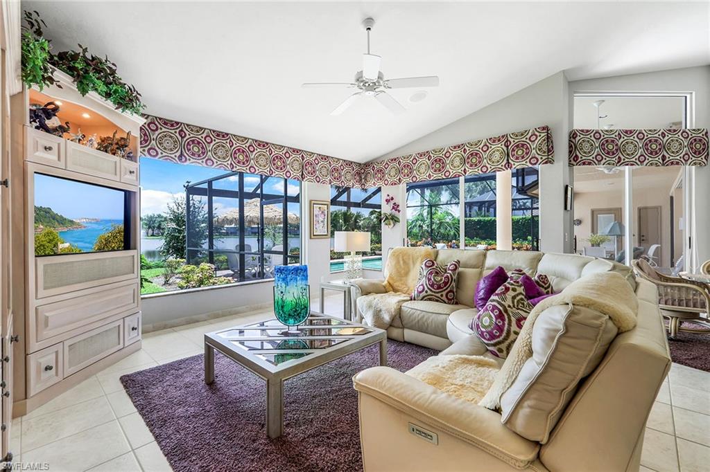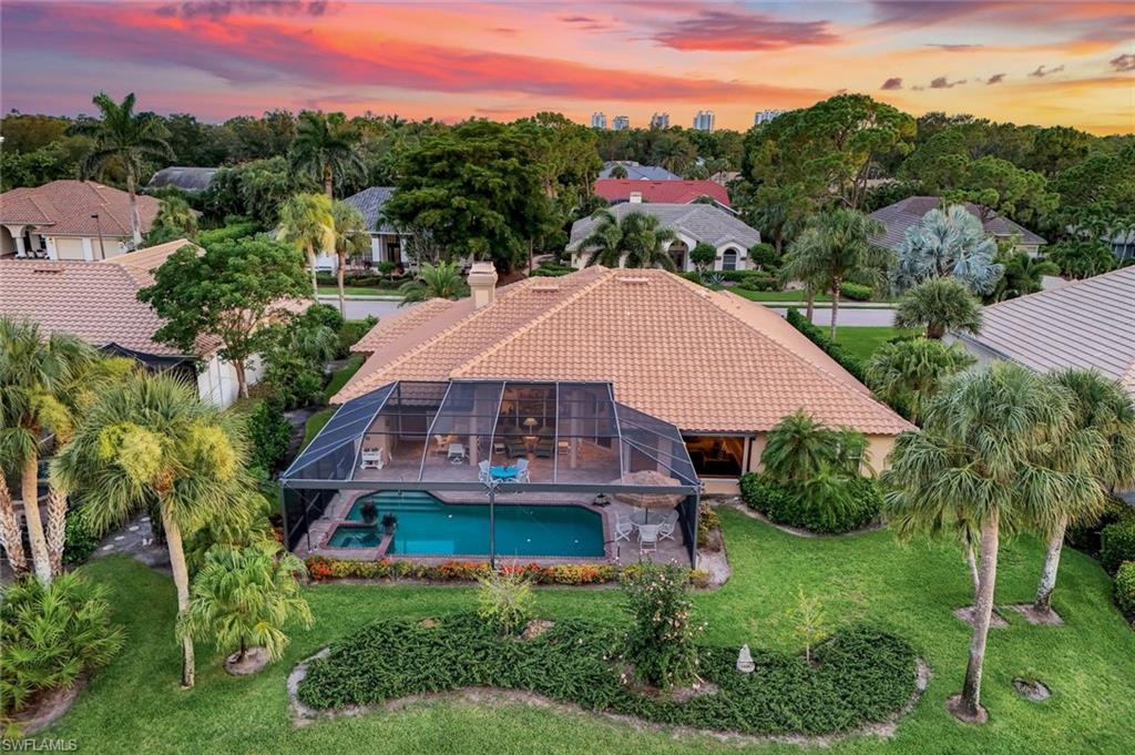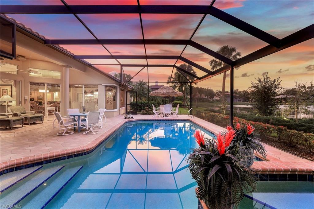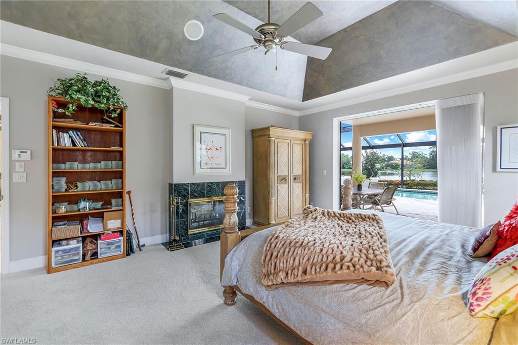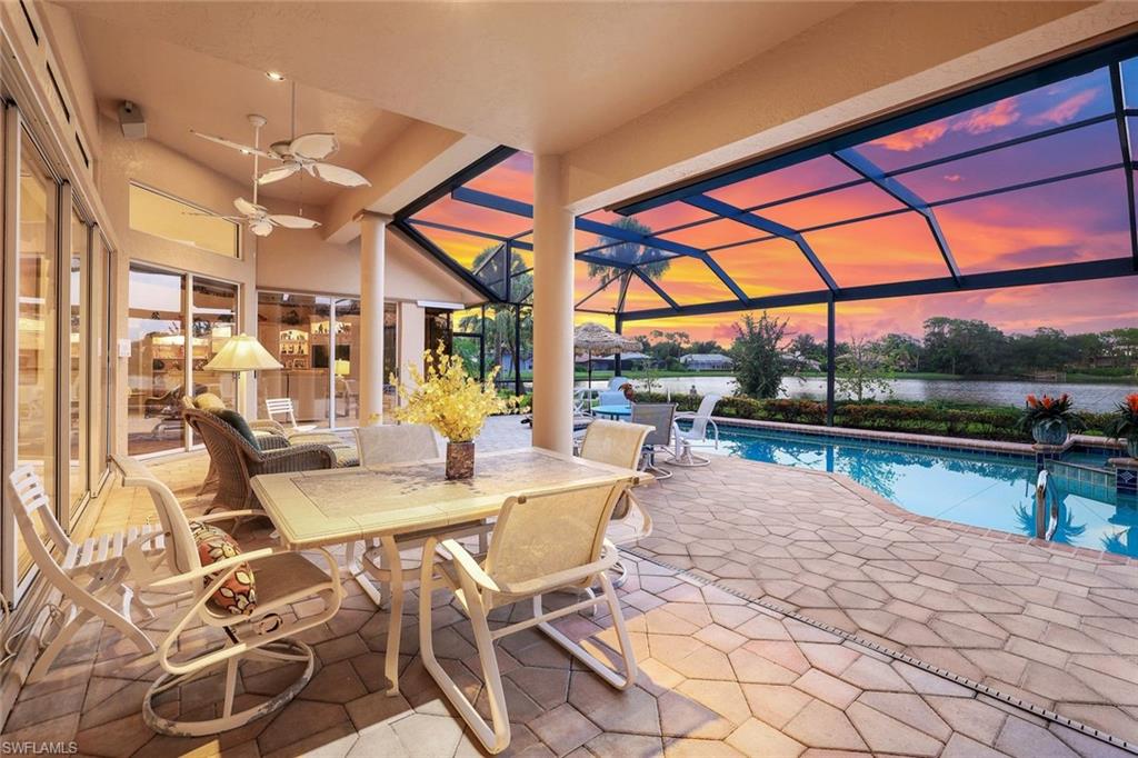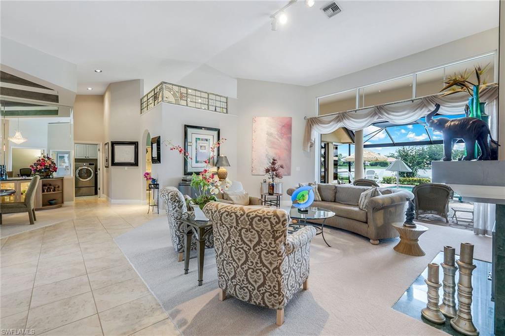 Welcome to this serene lakeside retreat in the heart of Pelican Landing, where tranquil water views serve as the ideal backdrop for refined Southwest Florida living. Known for the iconic pelican statue that greets visitors at front, this beautifully maintained residence features three bedrooms plus a den, two full baths, two half baths and a side-load two-car garage with additional storage. Thoughtfully designed with expansive ceilings and a split floor plan, the layout provides privacy and openness. A formal living room and a separate family room each offer relaxing views of the shimmering lake beyond. A wood-burning fireplace between the living room and the primary suite adds warmth and character. The gourmet kitchen includes one-piece granite countertops, a central island and a wet bar—ideal for everyday use and entertaining alike. Modern updates include replacement of all single-hung windows with impact-resistant glass (2024), a new air-conditioning system (June 2025), water heater (2023), screen enclosure (2017) and roof (2017). The primary and guest baths feature updated cabinetry, and the primary suite has been enhanced with on-trend elements. Outdoor living is elevated with an expansive screened lanai featuring a large pool, ample covered space and sweeping, unobstructed views of the lake, offering beauty and privacy. Residents of Pelican Landing enjoy access to an array of premier amenities, including a 34-acre private beach park accessible by boat shuttle, tennis and pickleball centers, a kayaking park, sailing center, community fitness center, and scenic walking and biking trails. Agents see offer instructions in remarks
