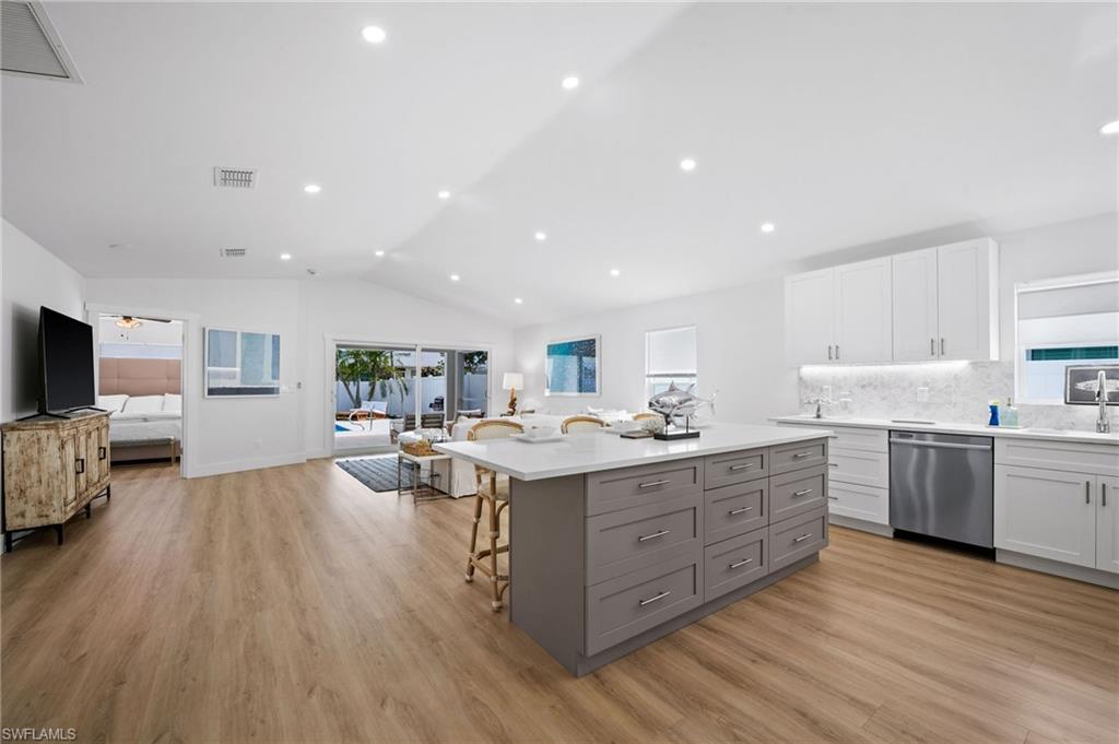 The quintessential 3-bed, 2-bath home in Naples Park. Recently updated throughout and offered completely turnkey the home features an open concept floor plan with vaulted ceilings, split-bedrooms, and luxury vinyl floors. The chef inspired kitchen has quartz countertops, stainless steel appliances and a large island with breakfast bar seating. The backyard area is perfect for entertaining featuring an oversized pool with Southern exposure and plenty of green space and mature palms. The two-car garage has also been upgraded with epoxy floors, brand new washer/dryer and plenty of room for extra storage. Naples Park is centrally located with walkability or just a short bike ride to the best of Naples including, Vanderbilt Beach, Delnor Wiggins State Park, and the many boutique shopping and dining options of Mercato and the Pavilion. 10 minute drive to Waterside, 15 minute drive to 5th Avenue and the Naples Pier.