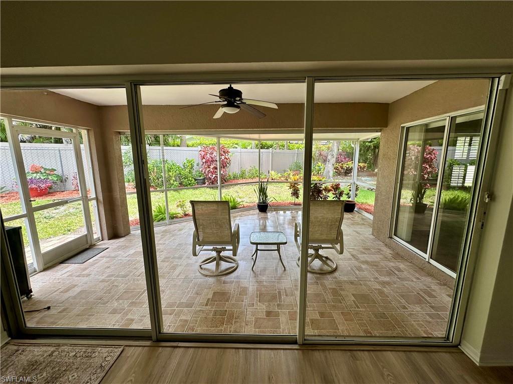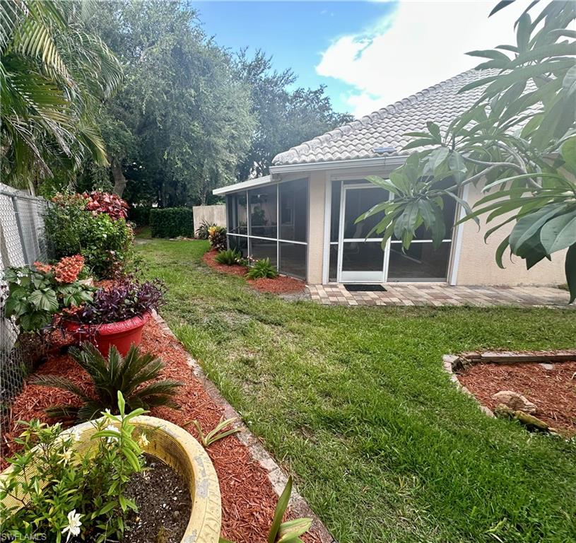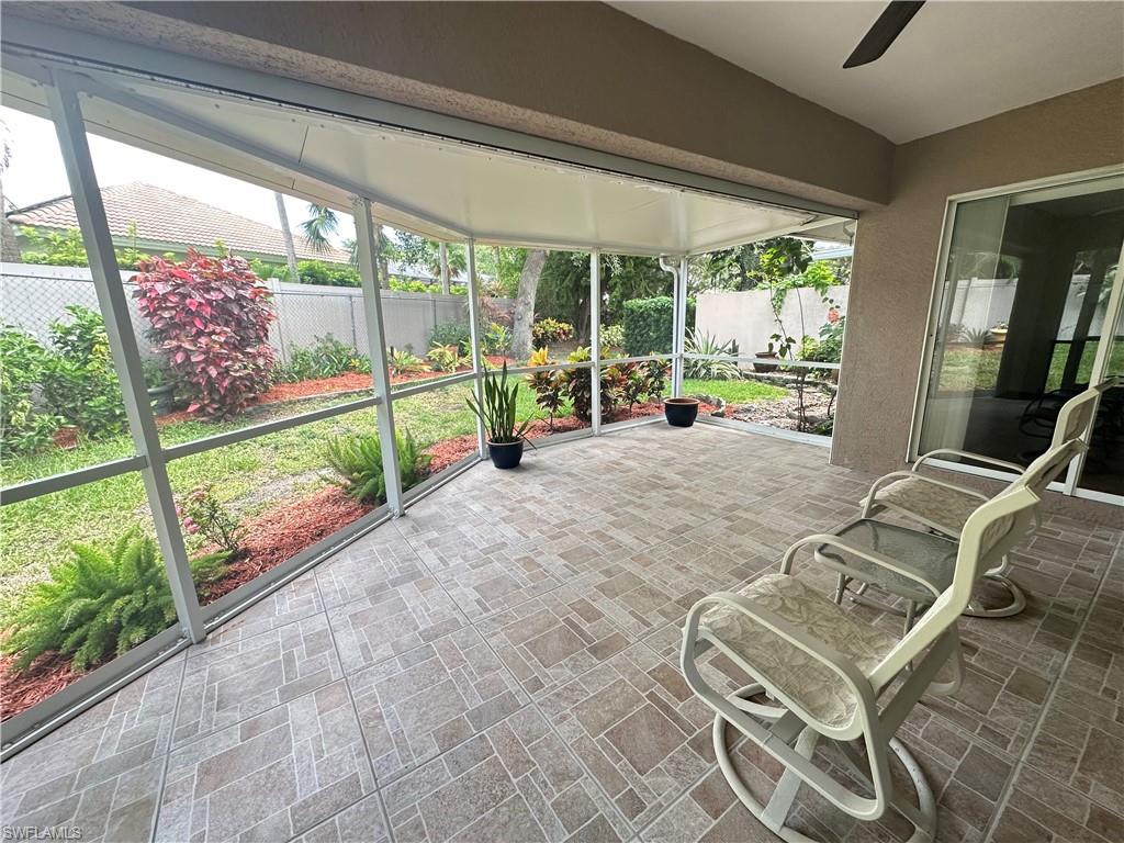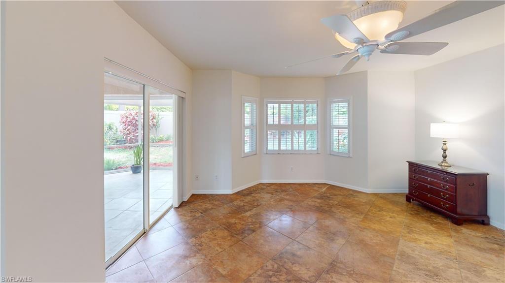 This 3 bedroom, 2 bath attached villa with 2-car garage is ready for a new owner! Enjoy a peaceful and private back yard, tucked in to the corner of the community with a long brick paver driveway. This home has been maintained beautifully! The tile roof was replaced in 2019, HVAC system replaced in 2021, water heater replaced 2024, and the entire house has Storm Smart hurricane screens and plantation shutters throughout. Located in Flood Zone X, flood insurance is NOT required! The huge extended lanai is completely covered, creating a wonderful outdoor space that keeps your furniture dry! The master bathroom has been beautifully redesigned and updated with a walk-in shower featuring gorgeous tile work and no need for a glass enclosure! Bay windows and vaulted ceilings in the great room create a vast, open concept. A beautiful built-in Murphy bed in the guest bedroom is included, and all of the flooring is either laminate or tile...no carpet! World Tennis Club is a gated community centrally located in North Naples and features 2 community pools, poolside cafe'/bar, 14 tennis courts and 4 pickleball courts with fully staffed pro shop, bocce, basketball play area, saunas and a wonderful social calendar of events.