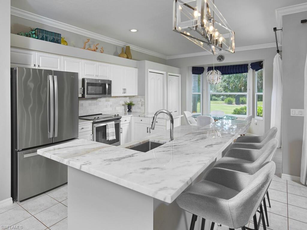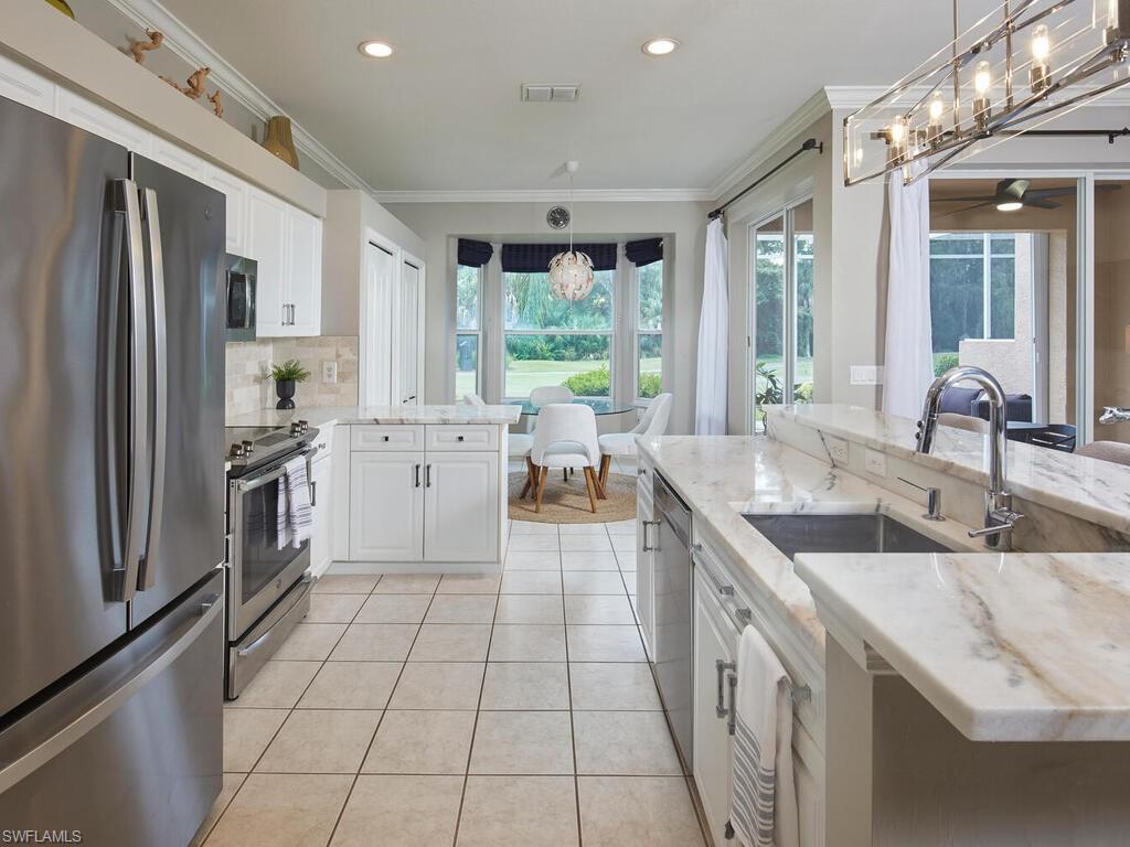 Welcome to your slice of North Naples! This pristine 2-bed, 2-bath villa in Heritage Greens is truly move-in ready. Enjoy bright, natural light all day with desirable SOUTHERN EXPOSURE and an open-concept living area. The rear lanai overlooks the 3rd tee of Arrowhead Golf Course—an 18-hole, par-72 Gordon G. Lewis–designed course consistently rated among the best public courses in Naples. The peaceful backdrop includes a natural preserve with no construction or road noise. RECENT MODERN UPDATES: Kitchen, guest bath, and bedroom flooring; quartz countertops; stainless steel appliances; stainless sink and faucet; updated lighting, fans, and stylish feature walls. Storage is abundant with a double pantry, hallway closet, and attic access above the oversized 1-car garage. HOA fees include roof maintenance and landscaping. Located in Flood Zone X—no flood insurance required. Community amenities include a workout facility, clubhouse, large resort-style pool and hot tub, tennis, pickleball, playground, and scenic sidewalks lined with mature trees. The community pool is only steps away. Flexible rental policy allows up to 12 leases per year with a 30-day minimum. Conveniently located near Logan Landings and Founder’s Square and under 9 miles to Naples’ gorgeous Gulf beaches. (Current property taxes are non-homestead; homestead status will offer significantly lower taxes.)