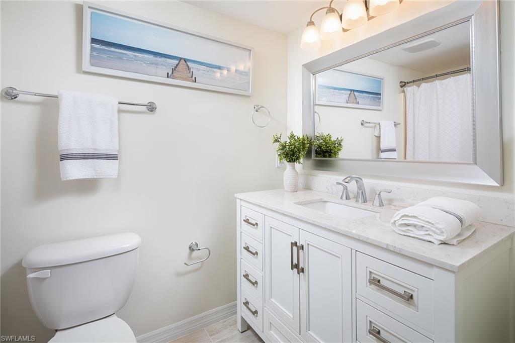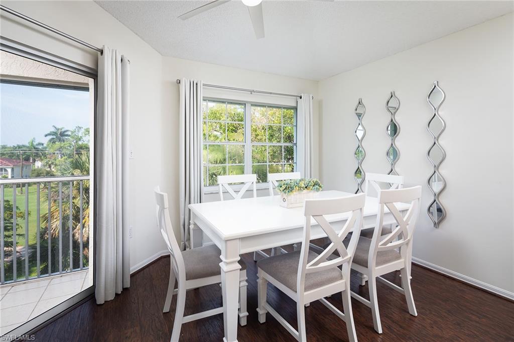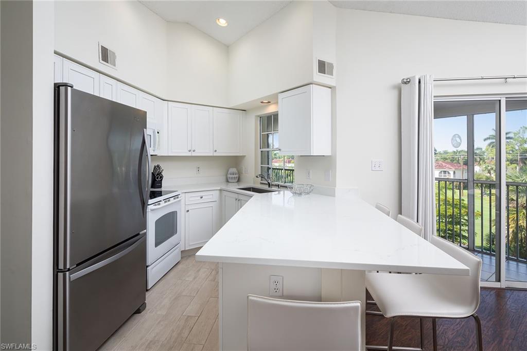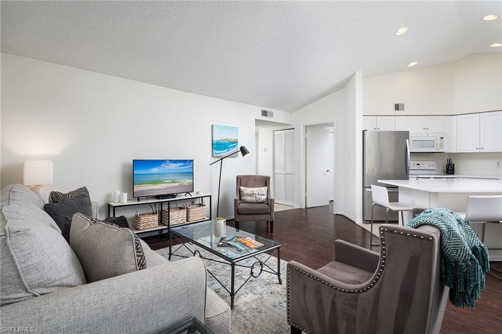 Unbeatable cul-de-sac location! This top-floor penthouse boasts spectacular sunset and golf course views, perfectly framed by vaulted ceilings that create a light, bright, and airy atmosphere. Recently updated with a crisp white kitchen, modern primary bath, and stylish flooring throughout, this home blends comfort with coastal sophistication. Enjoy a roomy screened lanai with a convenient kitchen pass-through and extra storage. The building exterior was freshly painted in 2020 and is located in the desirable X flood zone. The quiet, well-maintained community offers unbeatable convenience—just minutes to Clam Pass Beach, upscale shopping and dining at Waterside Shops, and everyday favorites like Starbucks and Target. Seasonal rentals are already secured for 2026 and can be transferred to the new owner. Optional membership is available at nearby Quail Run Golf Club, making this home ideal for both golfers and beach lovers.