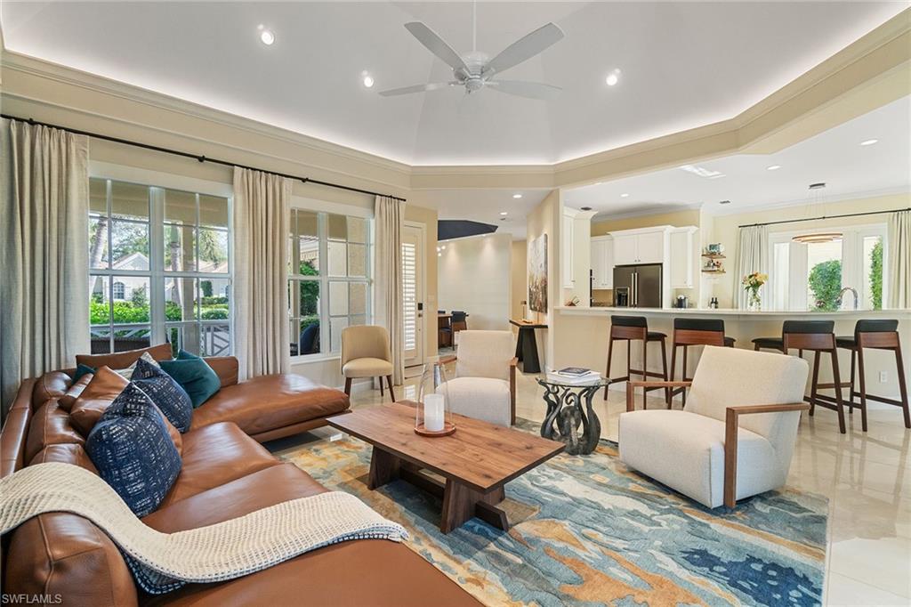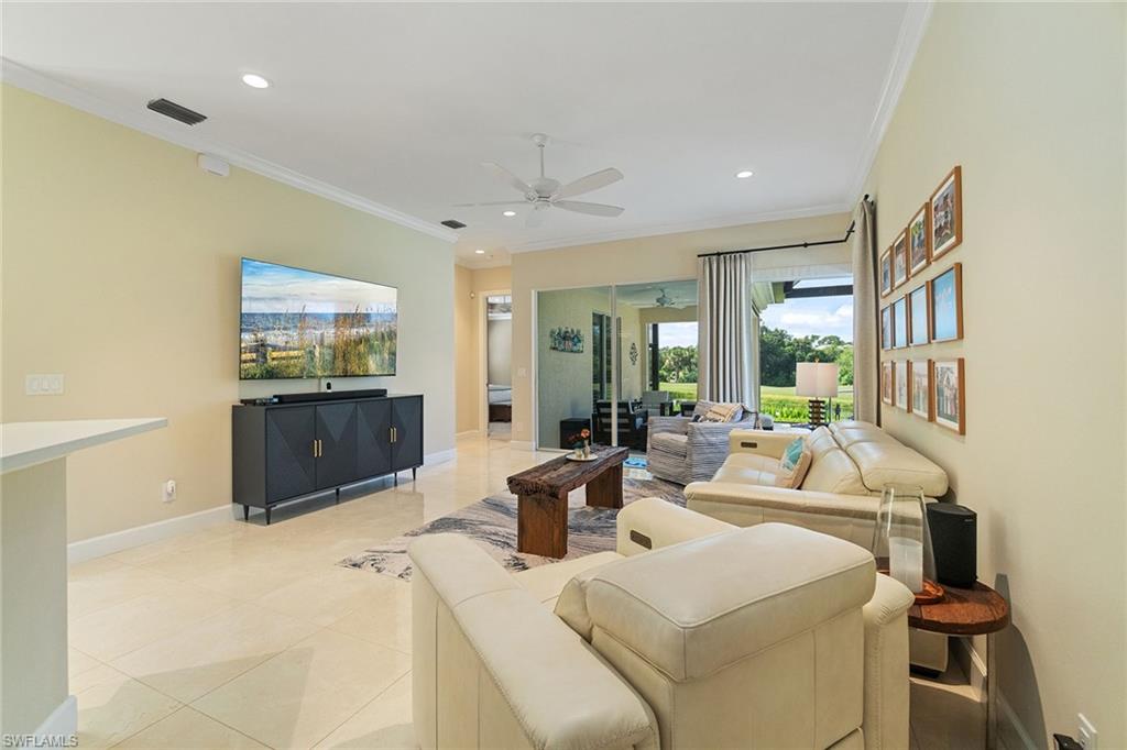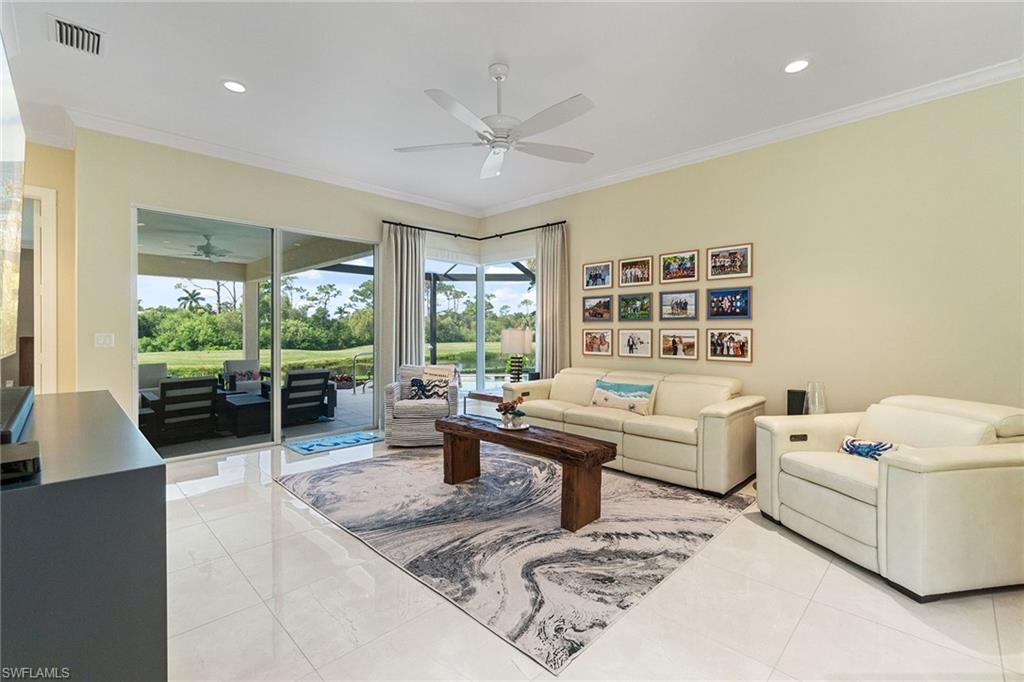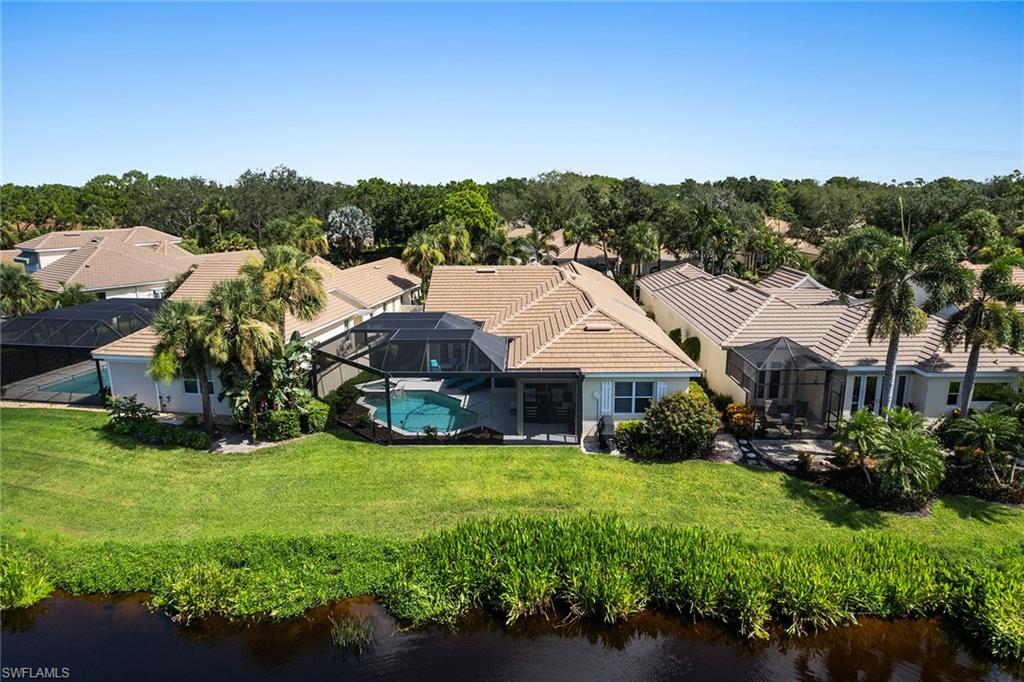 Built around the breathtaking golf course and water views, this beautifully updated residence, tucked away on a quiet cul-de-sac, reflects meticulous attention to detail at every turn. Inside, volume ceilings, plantation shutters, recessed LED lighting, and lighted tray ceilings create an open, refined ambiance. Gleaming tile floors extend throughout the main living areas, while plush new carpet adds comfort in the bedrooms, all enhanced by custom California Closets. In the kitchen, granite and quartz countertops pair with soft-close cabinetry and premium KitchenAid appliances. The primary suite is equally impressive, offering dual walk-in closets with built-ins, quartz-topped vanities, and a luxurious heated toilet seat. Storm protection includes impact-rated glass doors and hurricane screens on the lanai and primary suite. A picture-frame screen enclosure (2023) on the lanai maximizes the panoramic view of lush fairways, a glistening pond, and no rooftops in sight. Southern exposure fills the space with light, while a private courtyard off the kitchen offers a charming space to unwind. Additional highlights include a 2021 roof, 2023 air-conditioning unit, 2021 water heater, two-car garage with epoxy flooring, and an extra refrigerator. Enjoy exclusive access to Pelican Landing’s world-class amenities, including a private 34-acre Gulf beach island, 12 Har-Tru tennis courts, pickleball, fitness center, kayaking, sailing, fishing piers and more. Whether you're seeking a year-round residence or a serene seasonal escape, this property offers the ultimate blend of luxury, privacy and resort-style living, all framed by a view you'll never tire of.