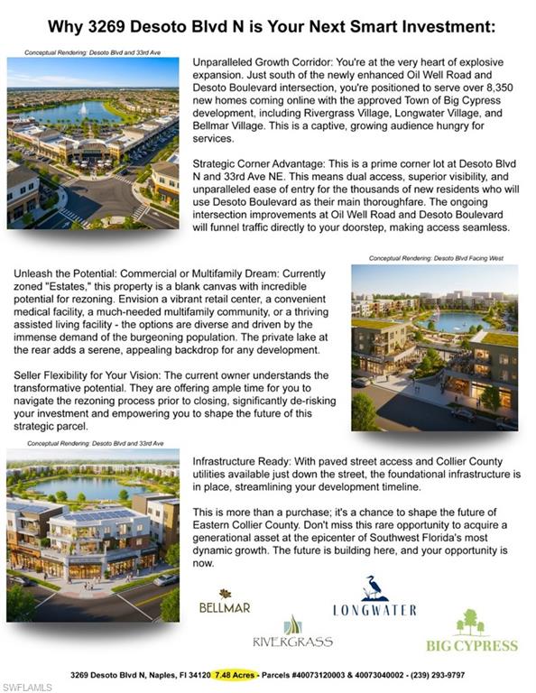 Discover an unparalleled Development Site at Desoto Blvd N and Oil Well Road, the strategic heart of Collier County's Booming New villages (Skysail, Rivergrass, Longwater, Bellmar, Big Cypress). This Expansive 7.48-acre Corner parcel boasts 1,157 linear feet of combined Road Frontage. Ideal for Commercial or Affordable Housing. The site features a Private Lake and benefits from Collier County Utilities nearby. Currently zoned Estates District, it permits diverse uses including: 3 Lakefront Single-Family Homes; Family Care, Assisted Living, & Nursing Homes; Churches, Civic/Cultural, & Educational Facilities; Fraternal Lodges, Private Clubs, Group Care, & Model Home Sales.