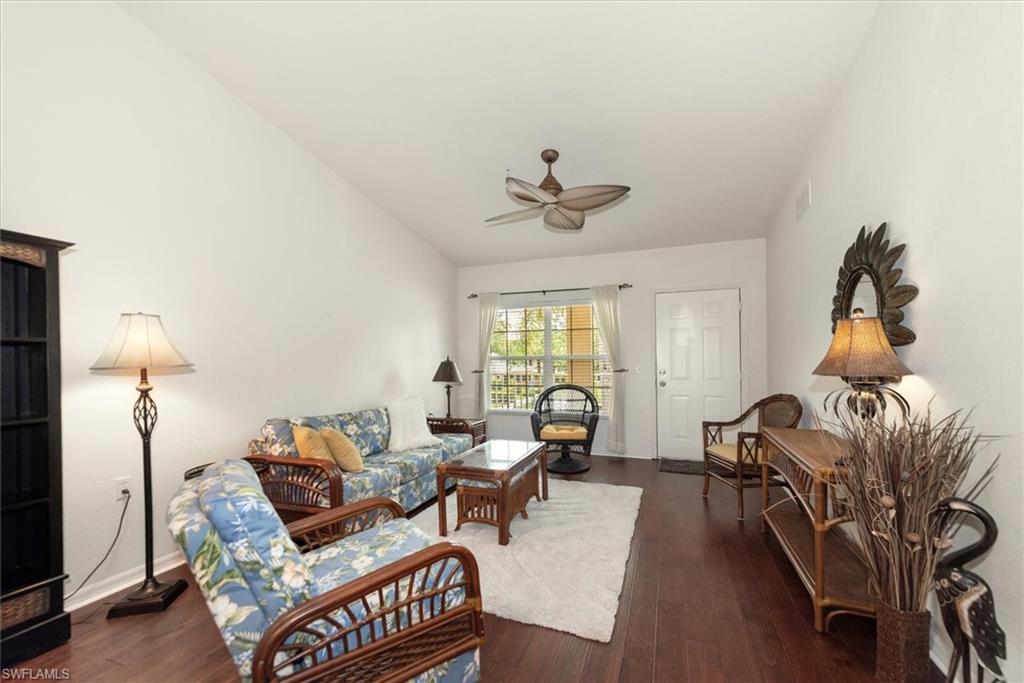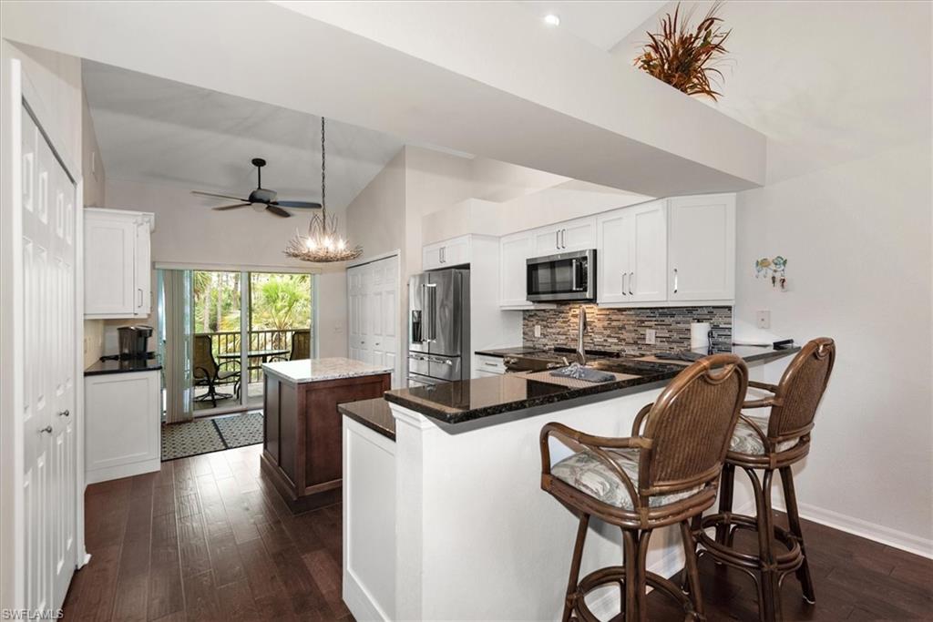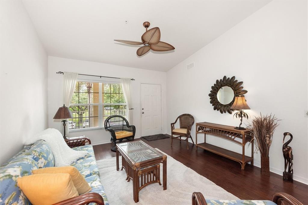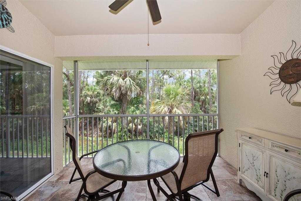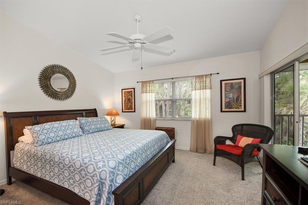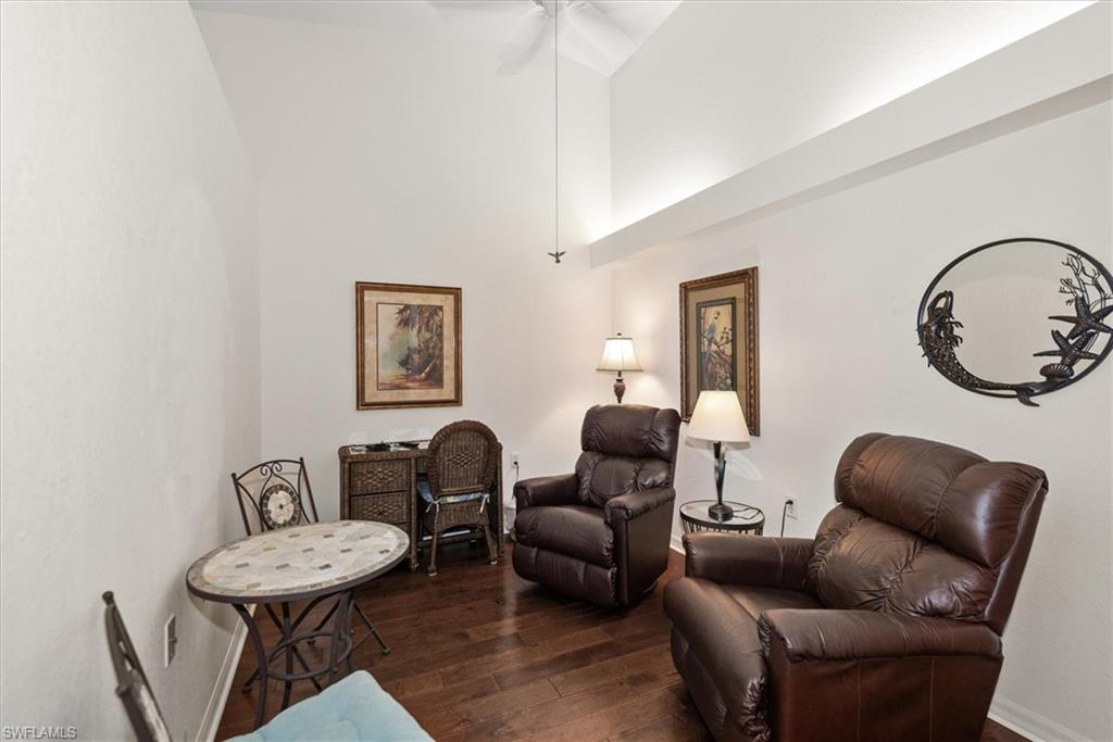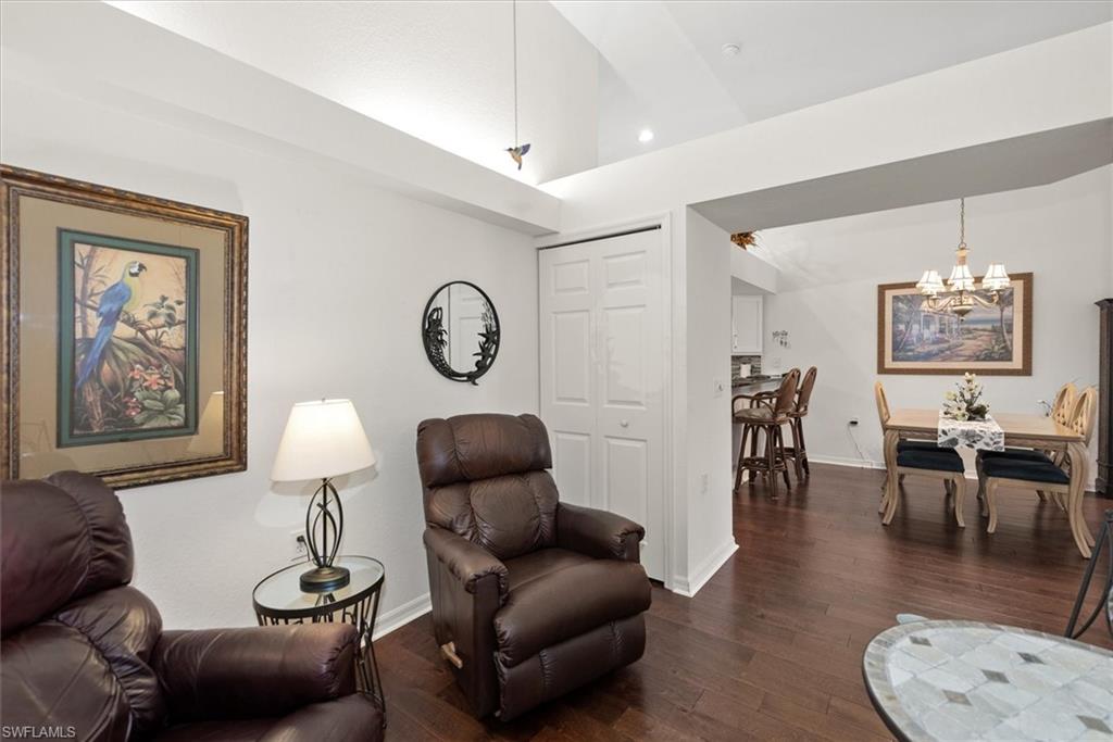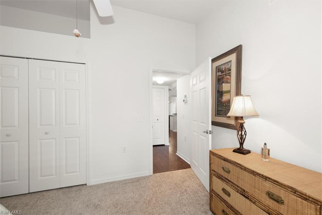 Beautifully updated TURNKEY unit features 2 bed + Den + 2 bath + Carport with tranquil preserve views! The property has been lightly lived in by a seasonal resident. The unit lives large with great room living/dining; kitchen with lots of cabinets, island and breakfast area; large living/dining and screened lanai that is accessible from the kitchen and primary suite. You will love the open kitchen with top of the line KitchenAid stainless appliances including a convection oven and "5 door" refrigerator. Also Granite countertops and contrasting quartz island top, and glass tile backsplash. The Den has a closet and could easily be converted to a 3rd bed. The condo features cathedral ceilings, creating an open & spacious atmosphere that enhances the overall aesthetic. Interior colors are neutral and the main living areas has hardwood floors. Bedrooms recarpeted in 2019. 2nd floor unit means no noisy neighbors above. BRAND NEW ROOF (2025). Enjoy the abundance of wildlife and wading birds from the SE facing screened lanai. Laundry with full sized appliances in the unit and hurricane shutter storage is also in the laundry closet. All windows and doors are protective coated with an Armour Shield, to minimize any damage and help with electric bills. Community pool & cabana is a stone's throw away. Residents are also permitted access to enjoy the full amenities at the Villages of Bonita, the adjoining community. The Condo building did NOT have any flooding and Flood insurance is NOT required. Gated front entrance. Bermuda Park is centrally located to local shops, dining and nearby to the sparkling shores of the Gulf of Mexico with access to Lover’s Key State Park, Barefoot Beach, Bonita Beach Park, Fort Myers and Naples beaches.