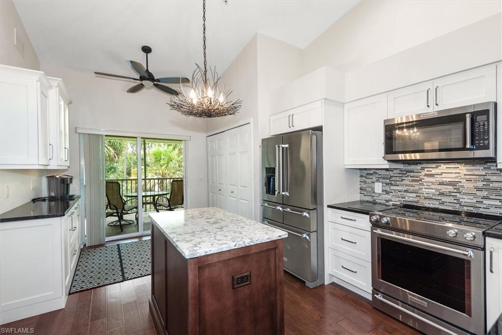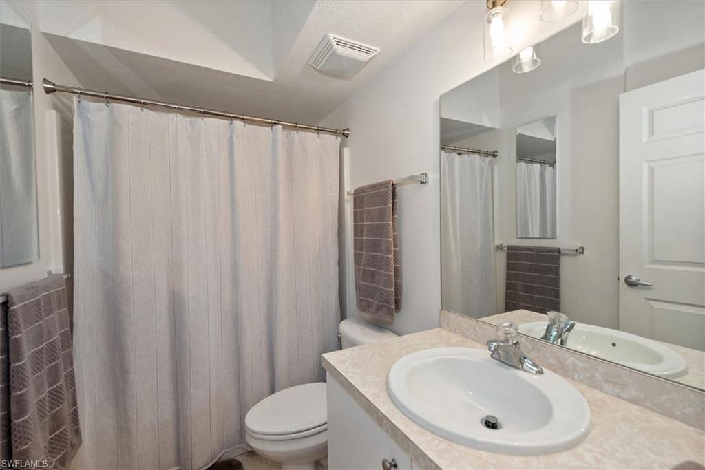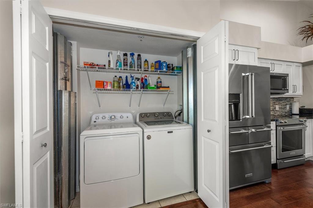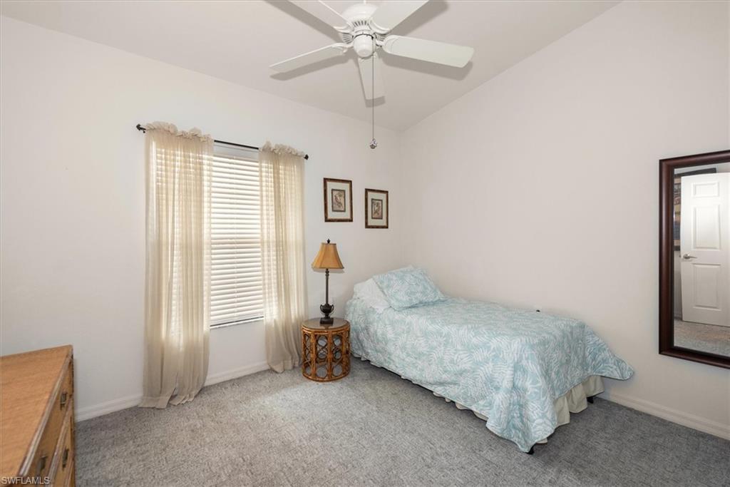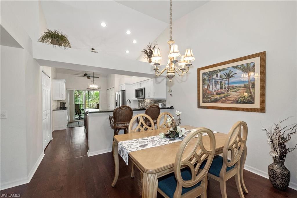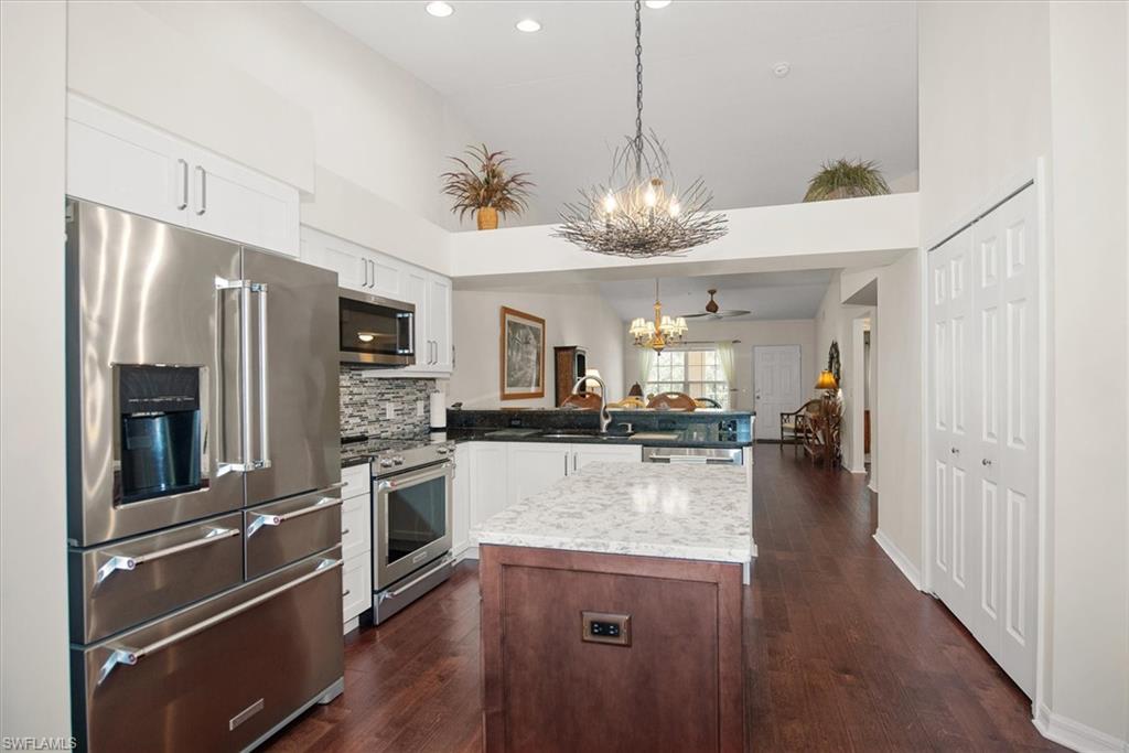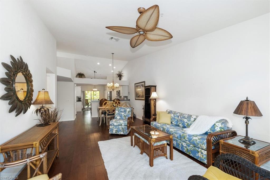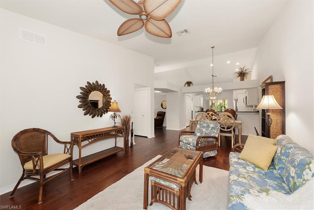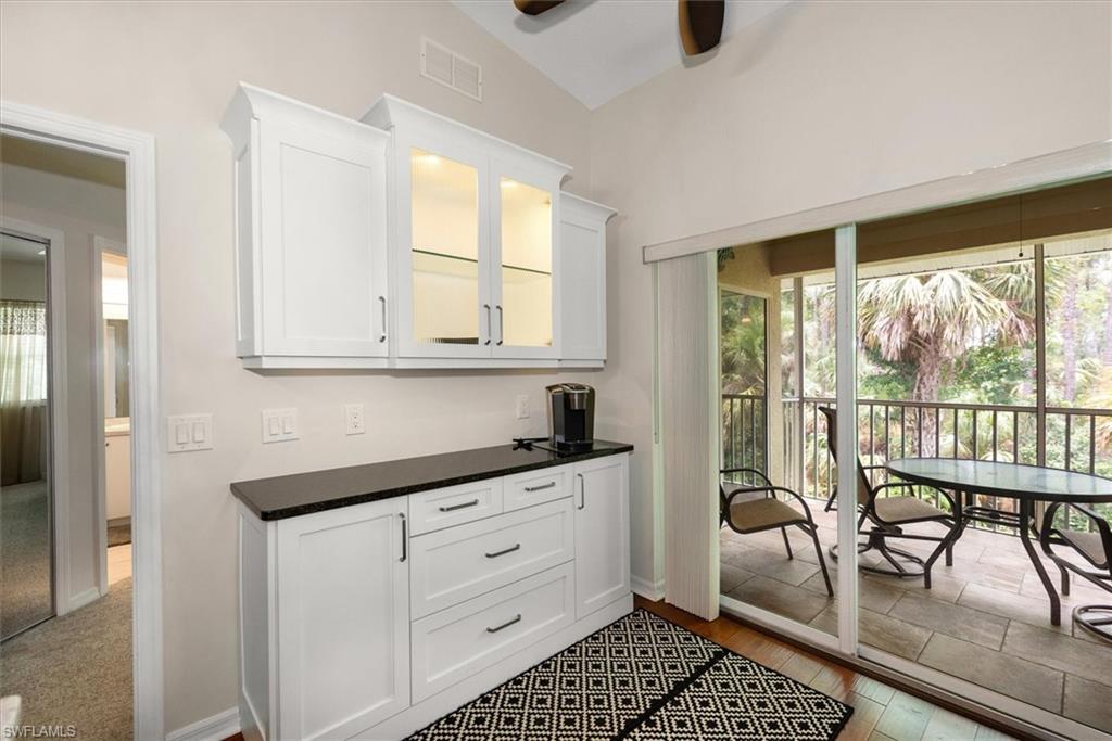 Beautifully updated TURNKEY unit features 2 bed + Den + 2 bath + Carport with tranquil preserve views! The property has been lightly lived in by a seasonal resident. The unit lives large with great room living/dining; kitchen with lots of cabinets, island and breakfast area; large living/dining and screened lanai that is accessible from the kitchen and primary suite. You will love the open kitchen with top of the line KitchenAid stainless appliances including a convection oven and "5 door" refrigerator. Also Granite countertops and contrasting quartz island top, and glass tile backsplash. The Den has a closet and could easily be converted to a 3rd bed. The condo features cathedral ceilings, creating an open & spacious atmosphere that enhances the overall aesthetic. Interior colors are neutral and the main living areas has hardwood floors. Bedrooms recarpeted in 2019. 2nd floor unit means no noisy neighbors above. BRAND NEW ROOF (2025). Enjoy the abundance of wildlife and wading birds from the SE facing screened lanai. Laundry with full sized appliances in the unit and hurricane shutter storage is also in the laundry closet. All windows and doors are protective coated with an Armour Shield, to minimize any damage and help with electric bills. Community pool & cabana is a stone's throw away. Residents are also permitted access to enjoy the full amenities at the Villages of Bonita, the adjoining community. The Condo building did NOT have any flooding and Flood insurance is NOT required. Gated front entrance. Bermuda Park is centrally located to local shops, dining and nearby to the sparkling shores of the Gulf of Mexico with access to Lover’s Key State Park, Barefoot Beach, Bonita Beach Park, Fort Myers and Naples beaches.