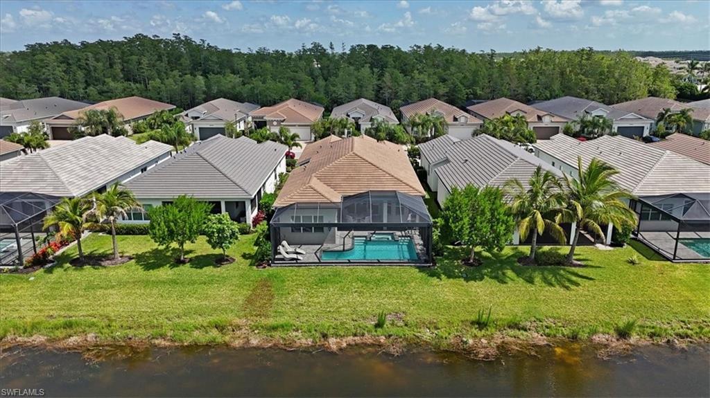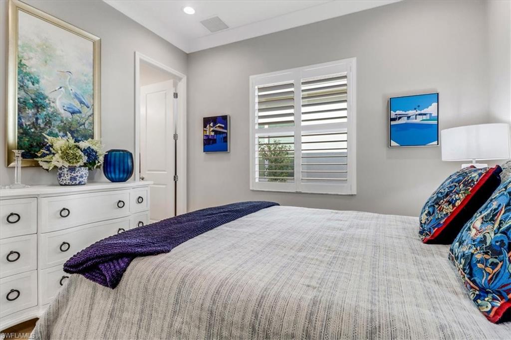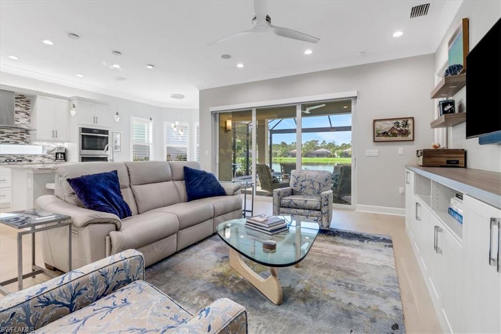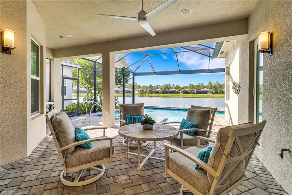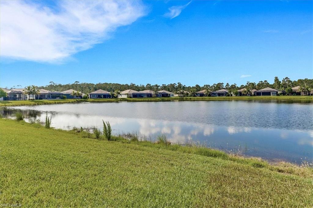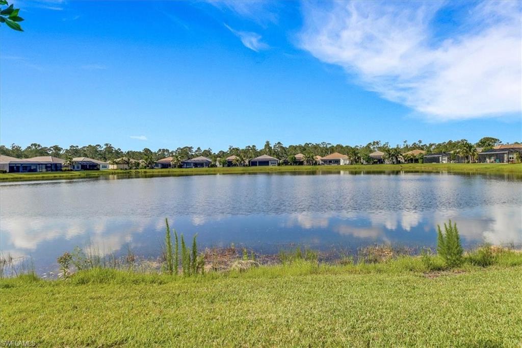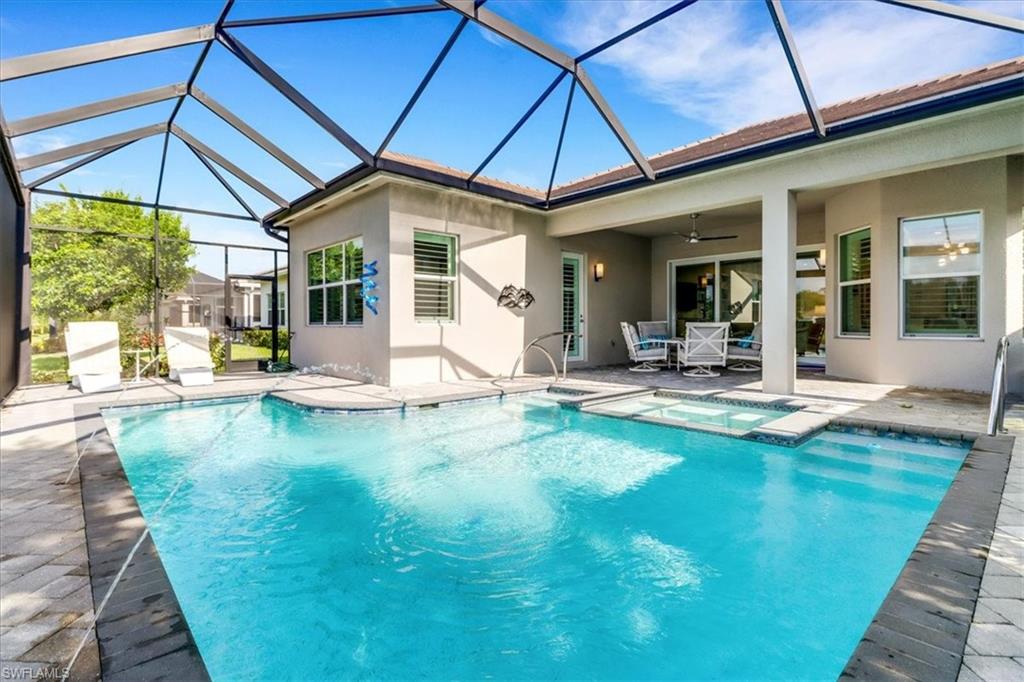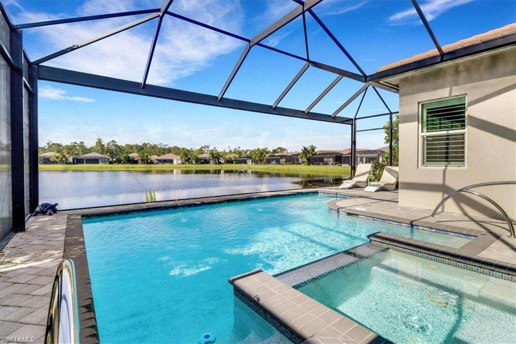This impeccably maintained Portofino model offers the perfect blend of luxury and comfort, set on a serene lakefront lot with desirable southern exposure. Inside, you’ll find elegant crown molding, rich wood flooring, plantation shutters, decorative light fixtures, and ceiling fans throughout. The upgraded laundry area includes a premium washer and dryer, plus a utility sink for added convenience. Enjoy thoughtful touches like custom closets, built-in storage solutions, and a luxurious jetted tub in the primary suite. The home is equipped with impact-resistant windows and a stunning pool and spa framed by picture window screening for unobstructed views. The garage is finished with a sleek epoxy floor and custom storage cabinetry. Located in Valencia Bonita—Southwest Florida’s premier active adult community—residents have access to a 45,000-square-foot clubhouse, the acclaimed Oasis restaurant, a full-service spa and salon, multiple resort-style pools, tennis and pickleball courts, bocce, a state-of-the-art fitness center with classes, over 40 social clubs, card rooms, and a vibrant social hall hosting live entertainment and events. Tucked just off Bonita Beach Road, Valencia Bonita offers the perfect mix of peace, luxury, and an active lifestyle.