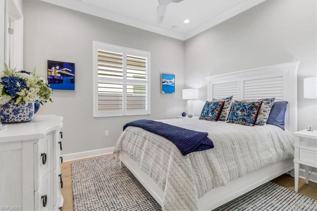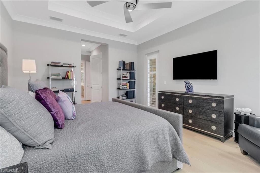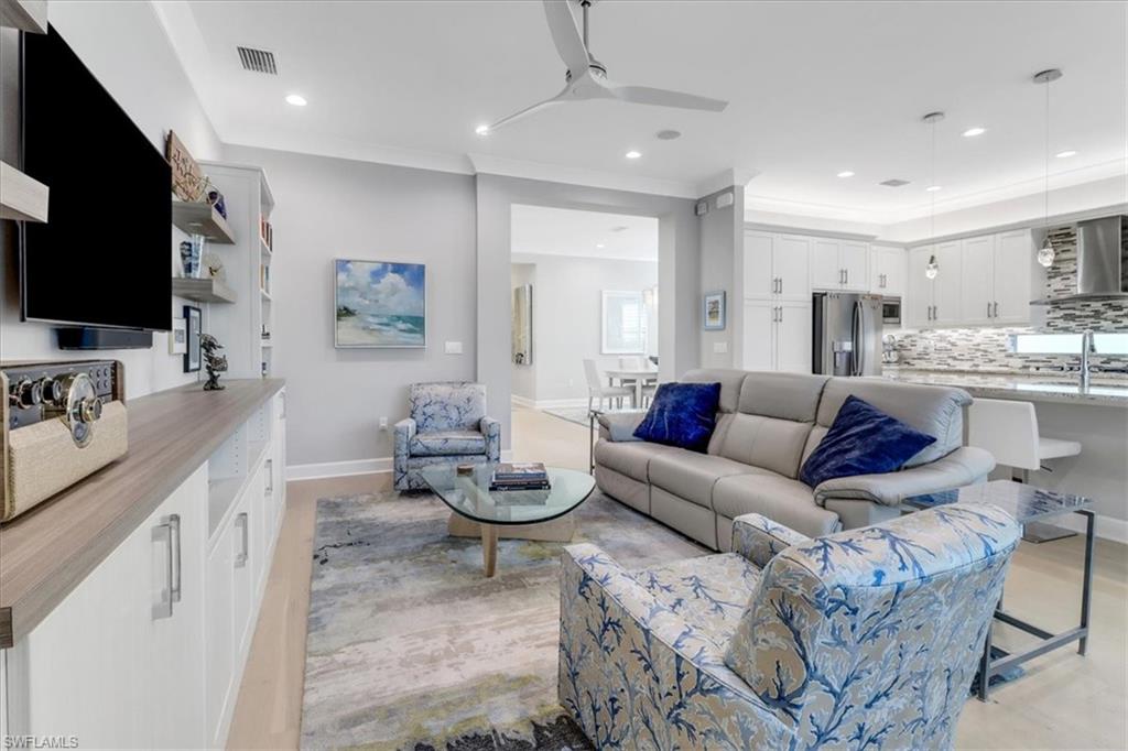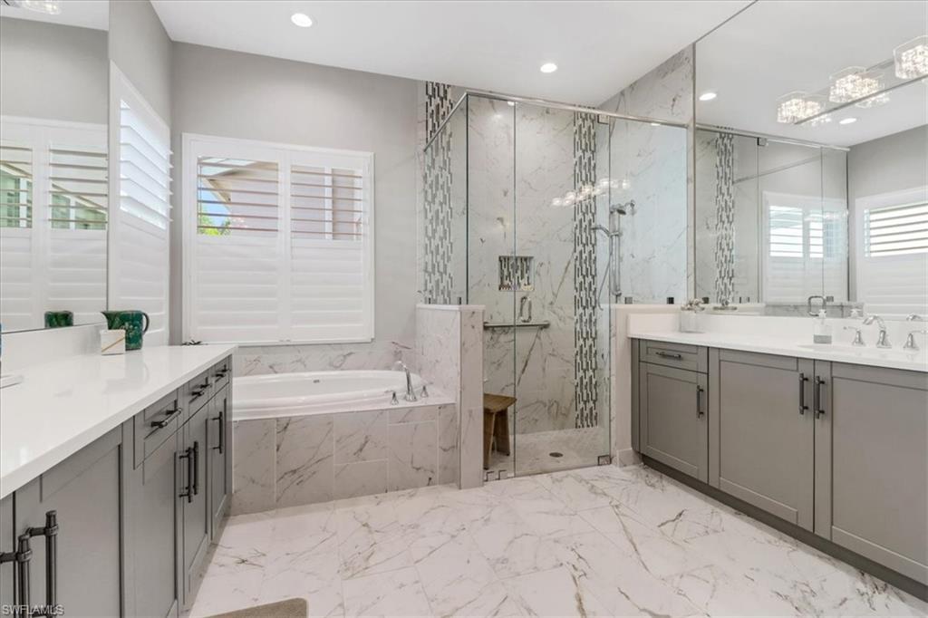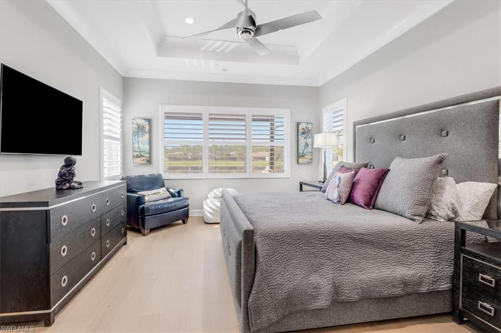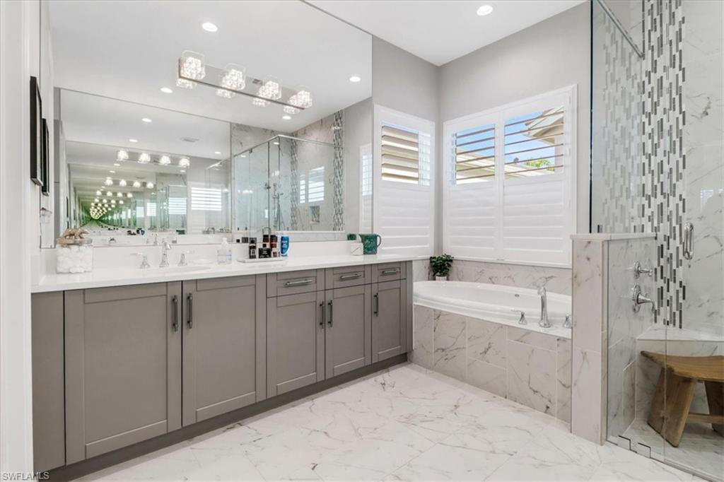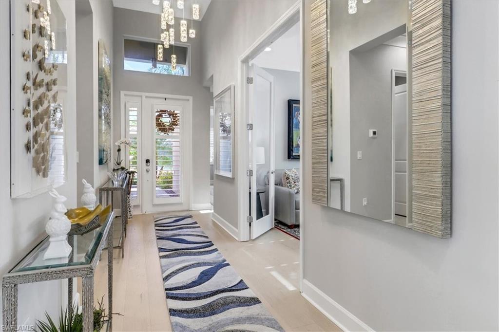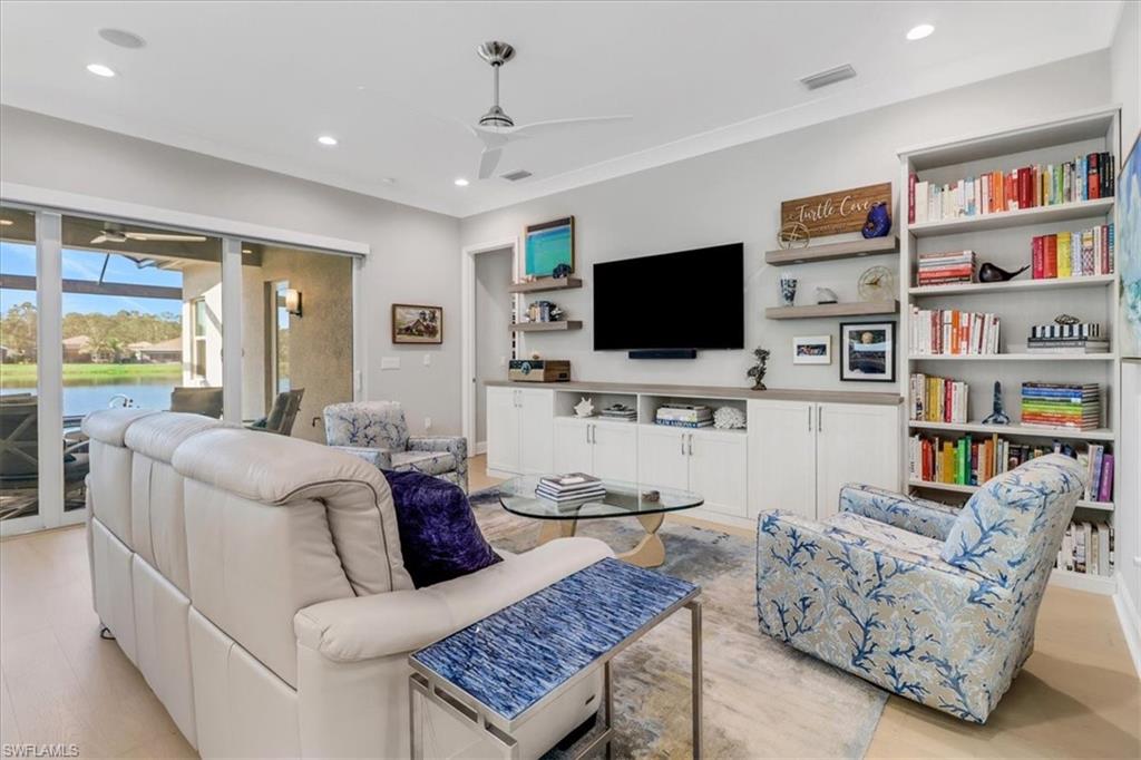 This impeccably maintained Portofino model offers the perfect blend of luxury and comfort, set on a serene lakefront lot with desirable southern exposure. Inside, you’ll find elegant crown molding, rich wood flooring, plantation shutters, decorative light fixtures, and ceiling fans throughout. The upgraded laundry area includes a premium washer and dryer, plus a utility sink for added convenience. Enjoy thoughtful touches like custom closets, built-in storage solutions, and a luxurious jetted tub in the primary suite. The home is equipped with impact-resistant windows and a stunning pool and spa framed by picture window screening for unobstructed views. The garage is finished with a sleek epoxy floor and custom storage cabinetry. Located in Valencia Bonita—Southwest Florida’s premier active adult community—residents have access to a 45,000-square-foot clubhouse, the acclaimed Oasis restaurant, a full-service spa and salon, multiple resort-style pools, tennis and pickleball courts, bocce, a state-of-the-art fitness center with classes, over 40 social clubs, card rooms, and a vibrant social hall hosting live entertainment and events. Tucked just off Bonita Beach Road, Valencia Bonita offers the perfect mix of peace, luxury, and an active lifestyle.