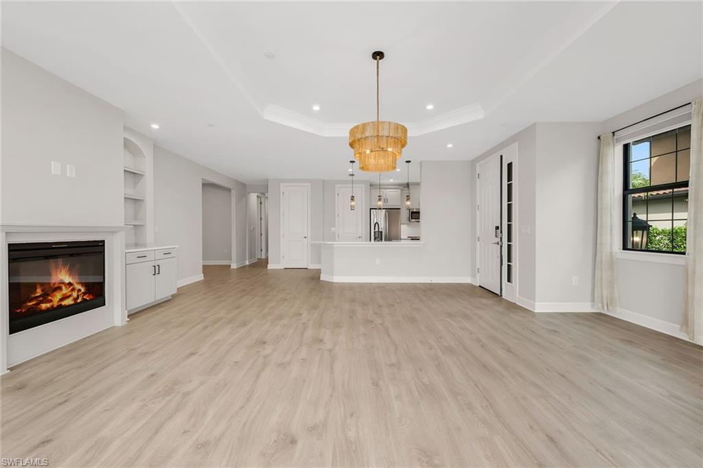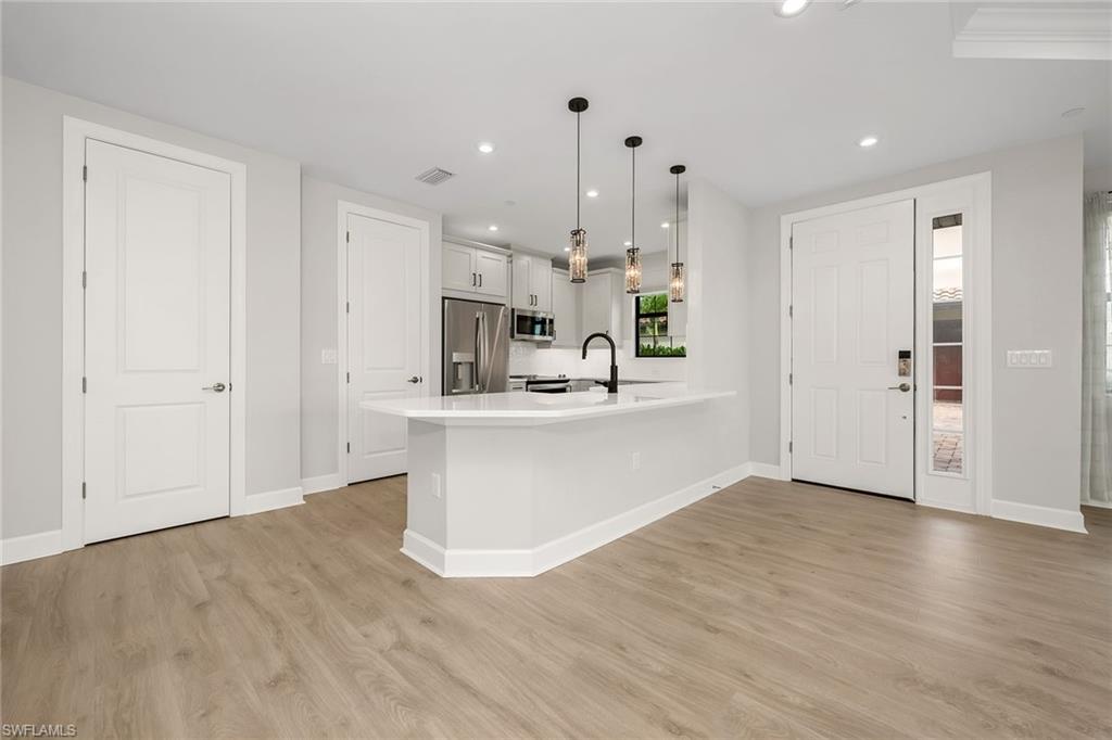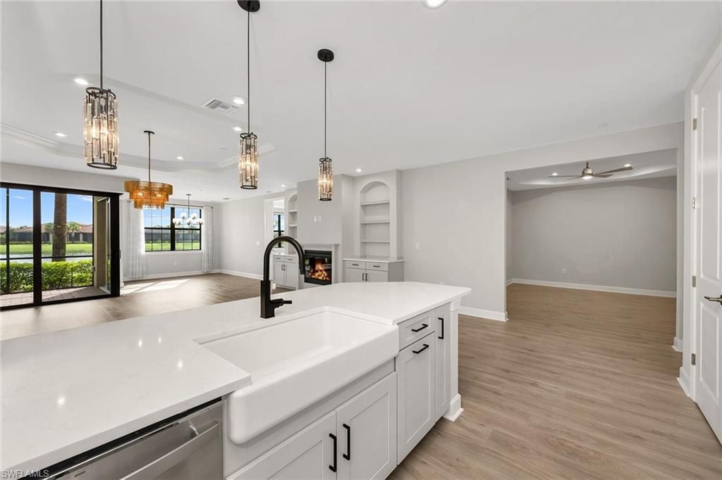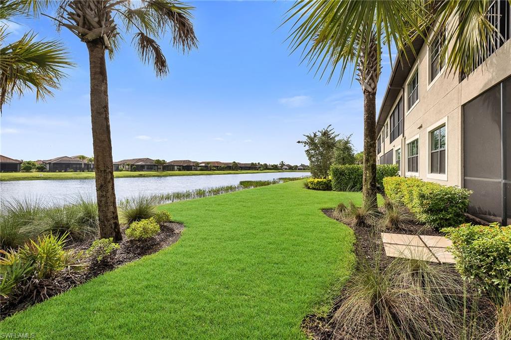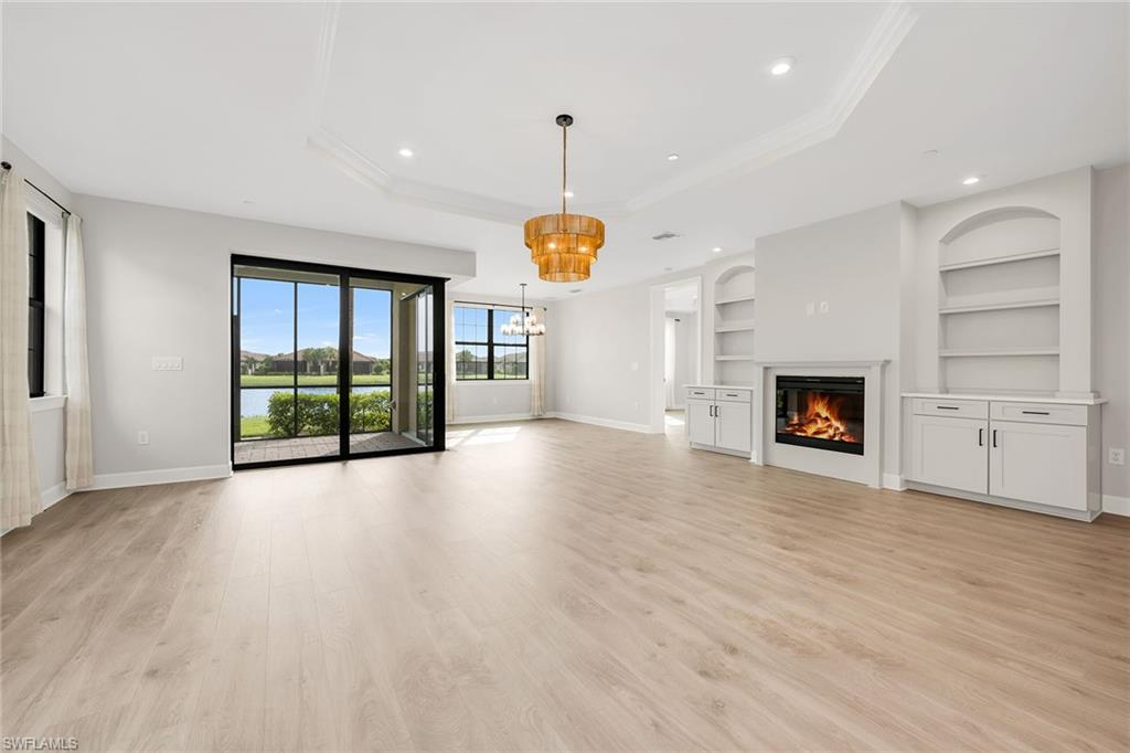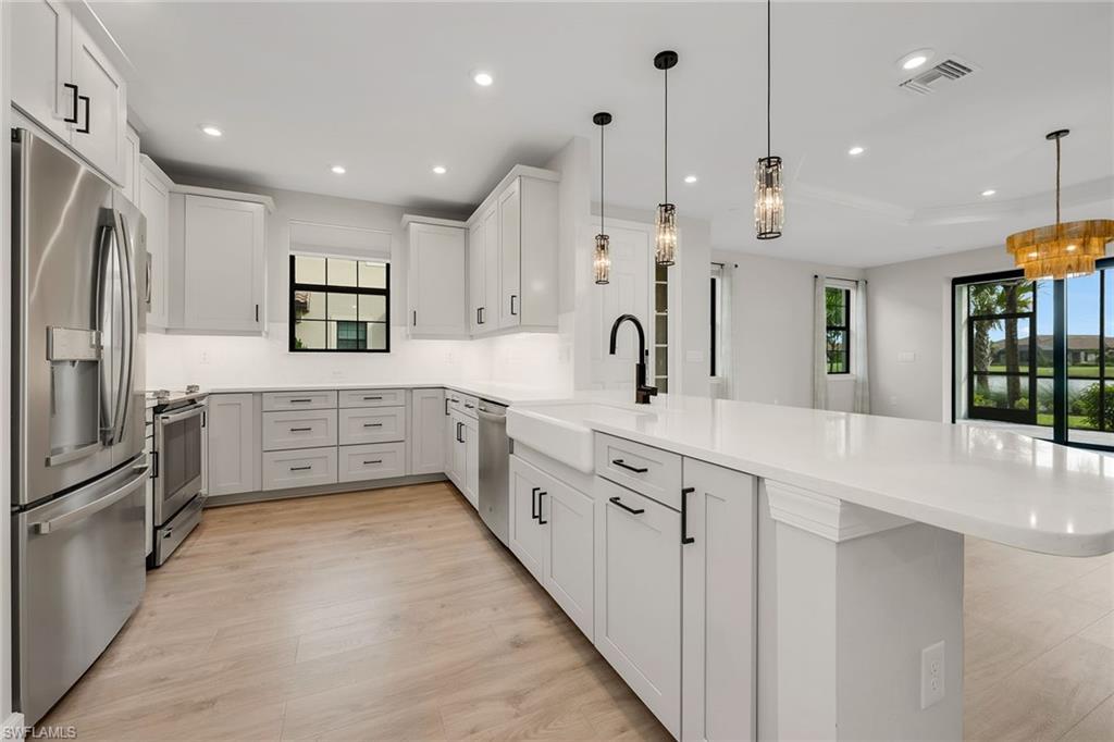 Live the resort lifestyle in this beautifully upgraded end-unit Marano model, offering abundant natural light and serene, private lake views in the sought-after Esplanade by the Islands. Built in 2022 with many thoughtful custom upgrades, this ground-floor carriage home features two spacious bedrooms plus a den and two and a half baths, all designed for elegant comfort. The open-concept layout is enhanced by luxury plank flooring in the main living areas, crown molding, and recessed lighting. The gourmet kitchen is a standout with premium stainless steel appliances, 42-inch level 5 upper cabinetry with soft-close doors, quartz countertops, upgraded backsplash, custom rollouts, and a striking white farmhouse sink. A large island with bar seating and pendant lighting connects seamlessly to the living room, which features a cozy fireplace, custom built-in cabinetry, and floating shelves. Zero-corner sliders fully retract to the screened lanai, ideally framing breathtaking wide water views and creating a seamless indoor-outdoor living experience. The owner’s suite is a luxurious retreat with a tray ceiling, beautiful lake views, and an elegant en-suite bath featuring dual quartz vanities with a makeup counter, a frameless walk-in shower with bench, and a spacious walk-in closet with built-in shelving. The second guest bedroom offers a private patio and an en-suite bath with a shower/tub combo, while a convenient powder bath is off the hallway. The den, complete with a modern ceiling fan, provides versatile space for a home office or study. The laundry area includes overhead cabinetry and a GE washer and dryer. Additional features include impact-resistant doors and windows for storm protection and peace of mind, as well as a private one-car garage for added storage and convenience. Residents of Esplanade by the Islands enjoy unparalleled resort-style amenities including a resort-style pool with towel service, lap pool, Bahama Bar & Grill, spa and salon, tennis and pickleball courts, fitness center, satellite community pool, outdoor barbecue area, fire pit, dog park and a soon-to-open culinary center. Just minutes from Marco Island’s beaches and shopping, dining and arts of downtown Naples, this home combines custom finishes, modern comfort and vibrant lifestyle in one exceptional package.