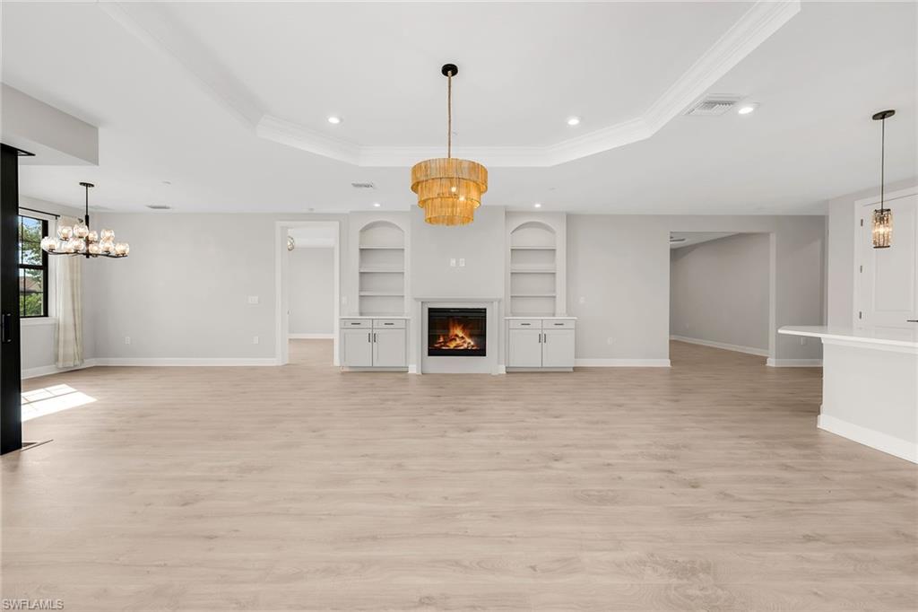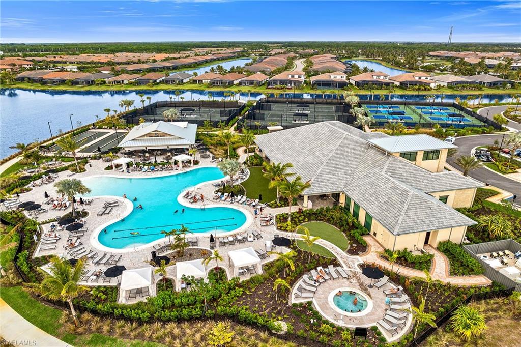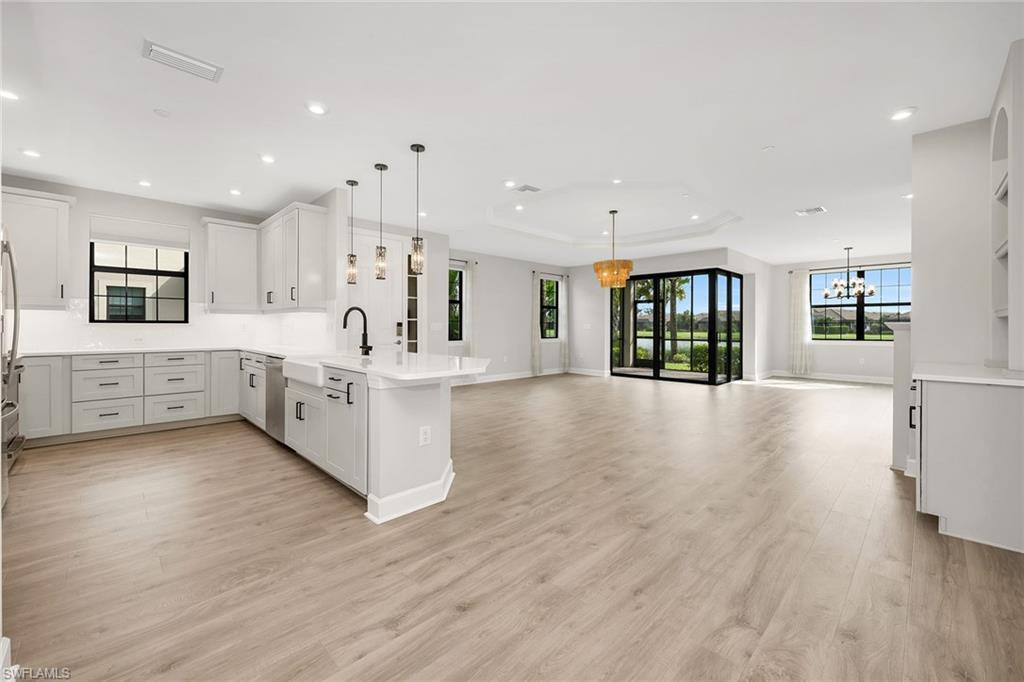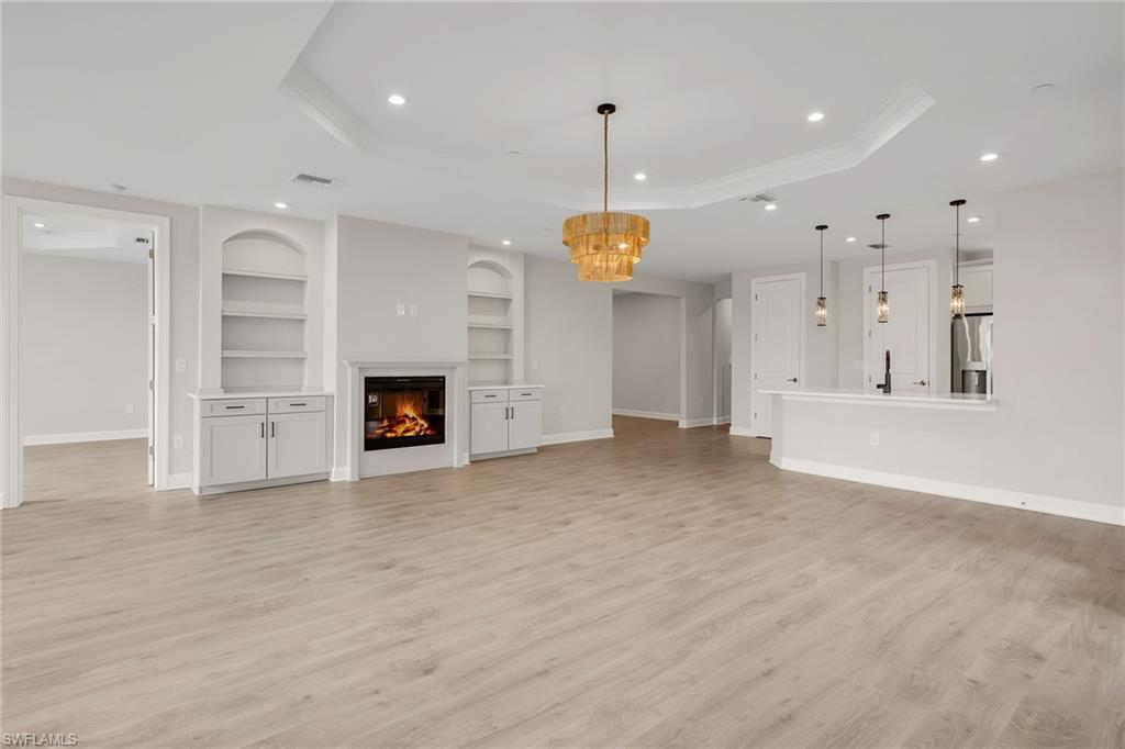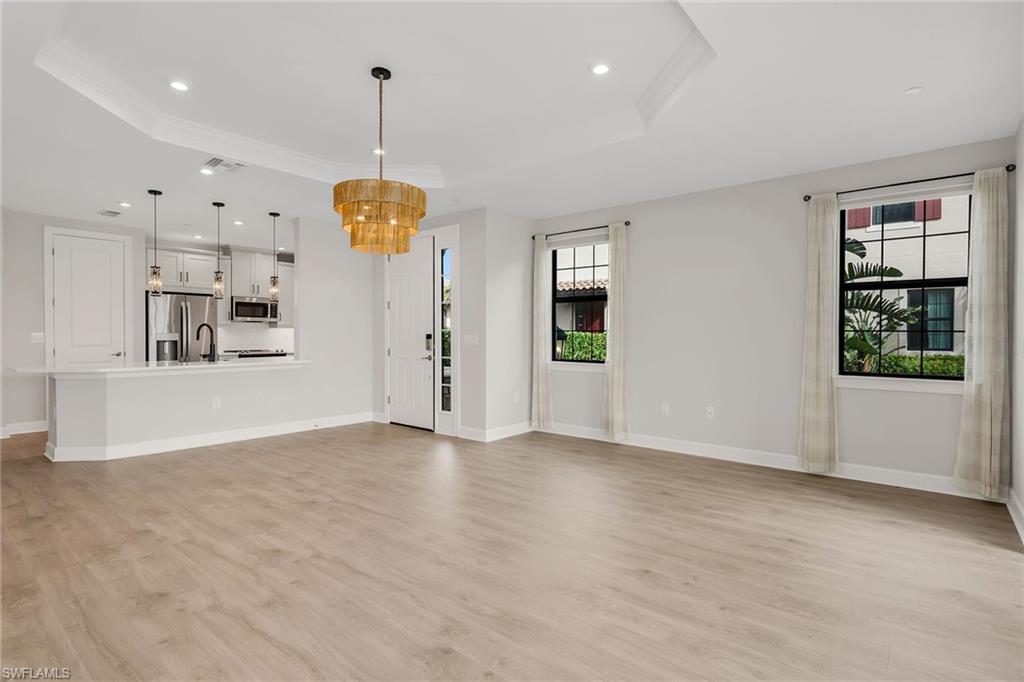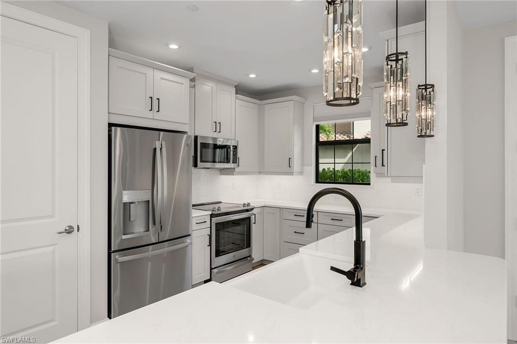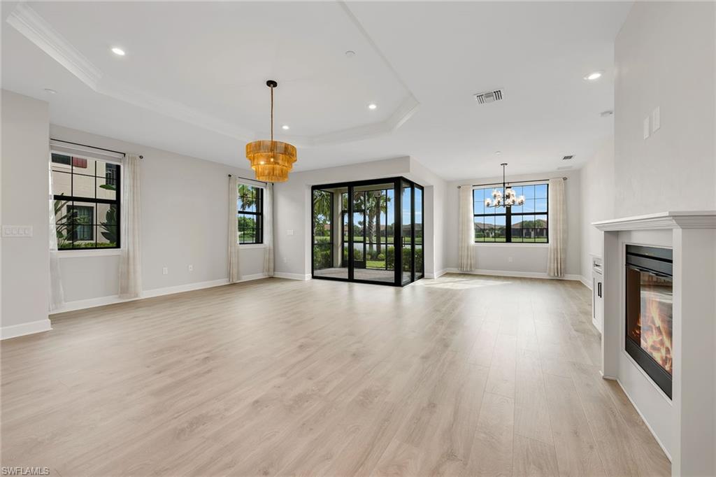 Live the resort lifestyle in this beautifully upgraded end-unit Marano model, offering abundant natural light and serene, private lake views in the sought-after Esplanade by the Islands. Built in 2022 with many thoughtful custom upgrades, this ground-floor carriage home features two spacious bedrooms plus a den and two and a half baths, all designed for elegant comfort. The open-concept layout is enhanced by luxury plank flooring in the main living areas, crown molding, and recessed lighting. The gourmet kitchen is a standout with premium stainless steel appliances, 42-inch level 5 upper cabinetry with soft-close doors, quartz countertops, upgraded backsplash, custom rollouts, and a striking white farmhouse sink. A large island with bar seating and pendant lighting connects seamlessly to the living room, which features a cozy fireplace, custom built-in cabinetry, and floating shelves. Zero-corner sliders fully retract to the screened lanai, ideally framing breathtaking wide water views and creating a seamless indoor-outdoor living experience. The owner’s suite is a luxurious retreat with a tray ceiling, beautiful lake views, and an elegant en-suite bath featuring dual quartz vanities with a makeup counter, a frameless walk-in shower with bench, and a spacious walk-in closet with built-in shelving. The second guest bedroom offers a private patio and an en-suite bath with a shower/tub combo, while a convenient powder bath is off the hallway. The den, complete with a modern ceiling fan, provides versatile space for a home office or study. The laundry area includes overhead cabinetry and a GE washer and dryer. Additional features include impact-resistant doors and windows for storm protection and peace of mind, as well as a private one-car garage for added storage and convenience. Residents of Esplanade by the Islands enjoy unparalleled resort-style amenities including a resort-style pool with towel service, lap pool, Bahama Bar & Grill, spa and salon, tennis and pickleball courts, fitness center, satellite community pool, outdoor barbecue area, fire pit, dog park and a soon-to-open culinary center. Just minutes from Marco Island’s beaches and shopping, dining and arts of downtown Naples, this home combines custom finishes, modern comfort and vibrant lifestyle in one exceptional package.