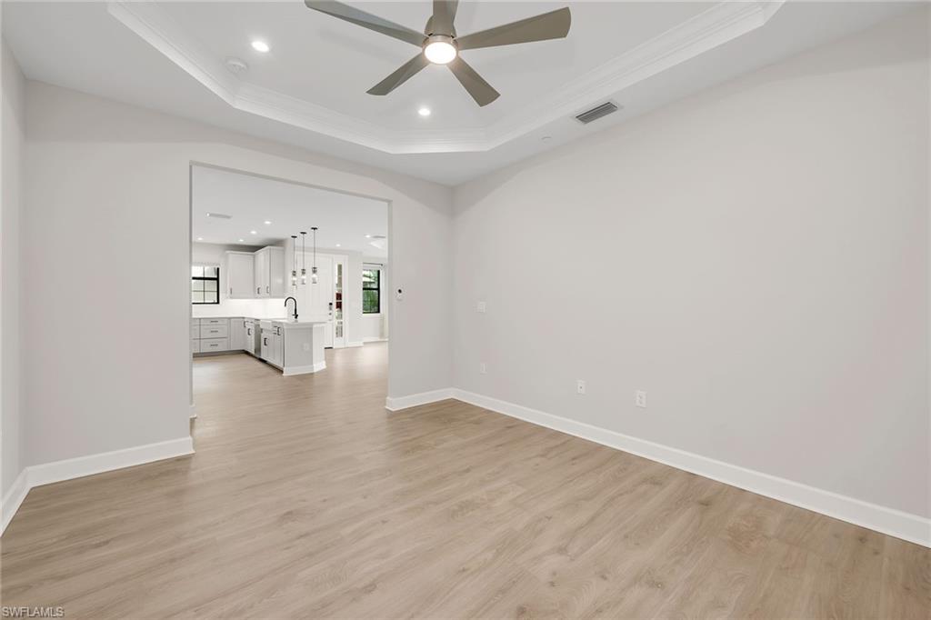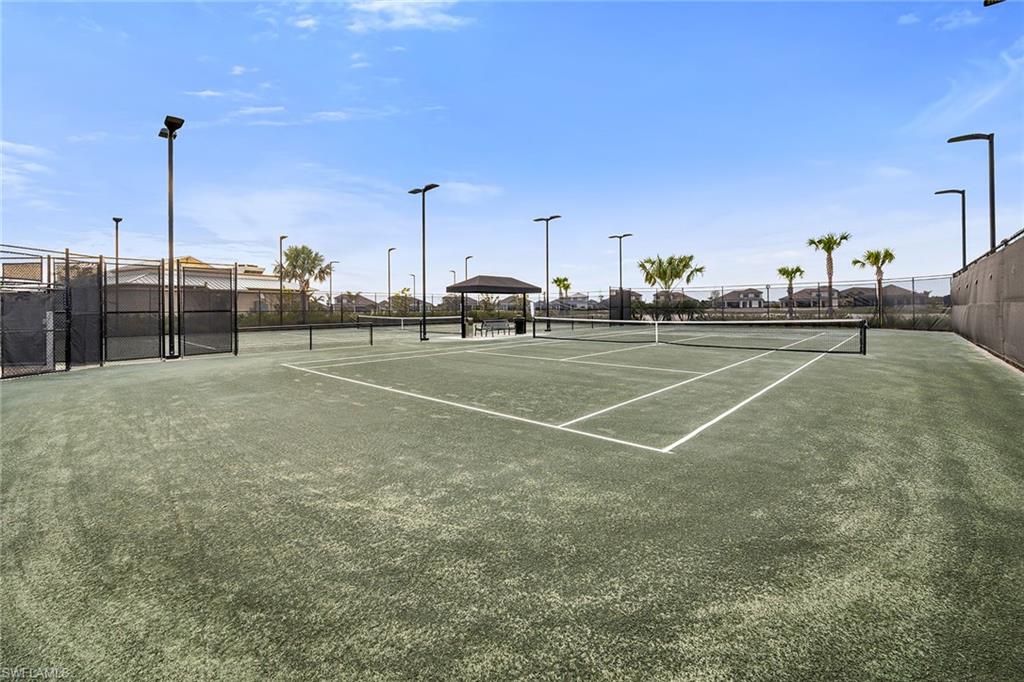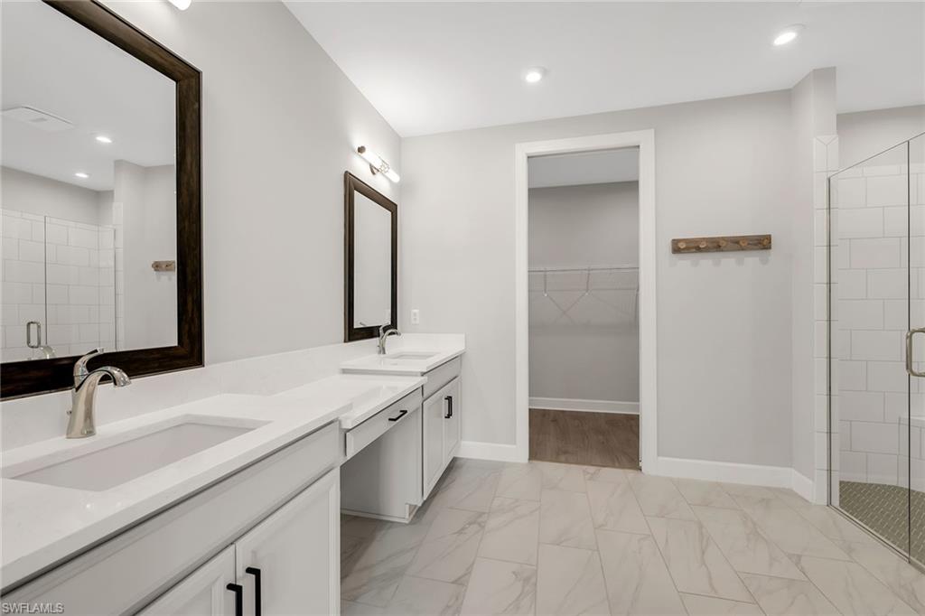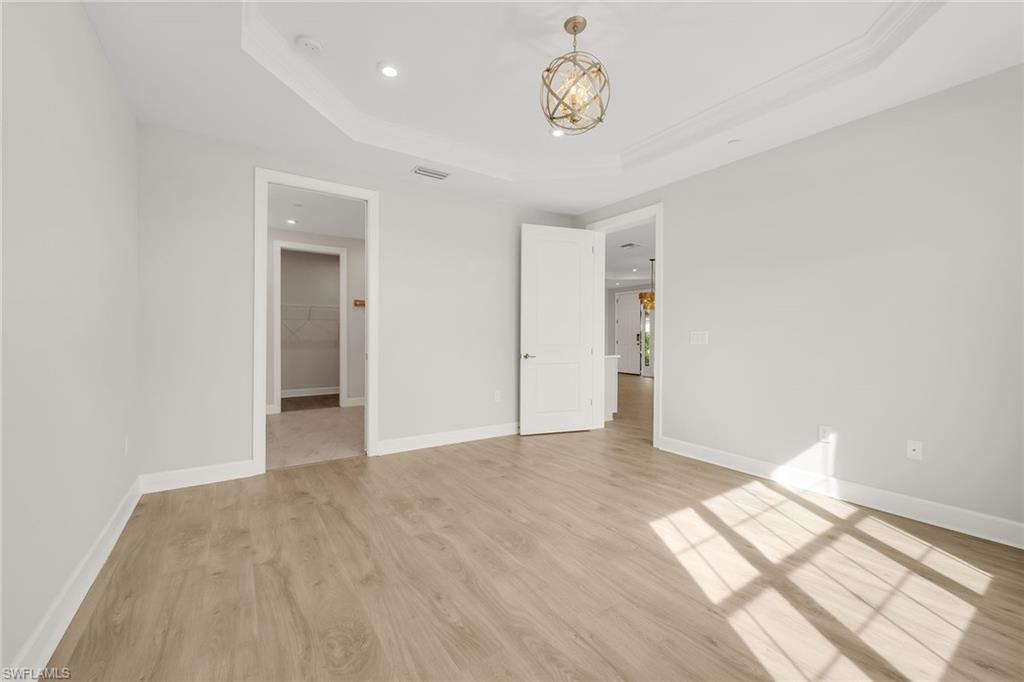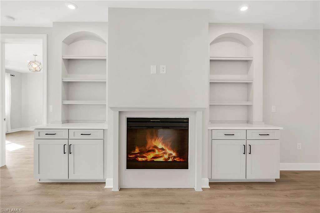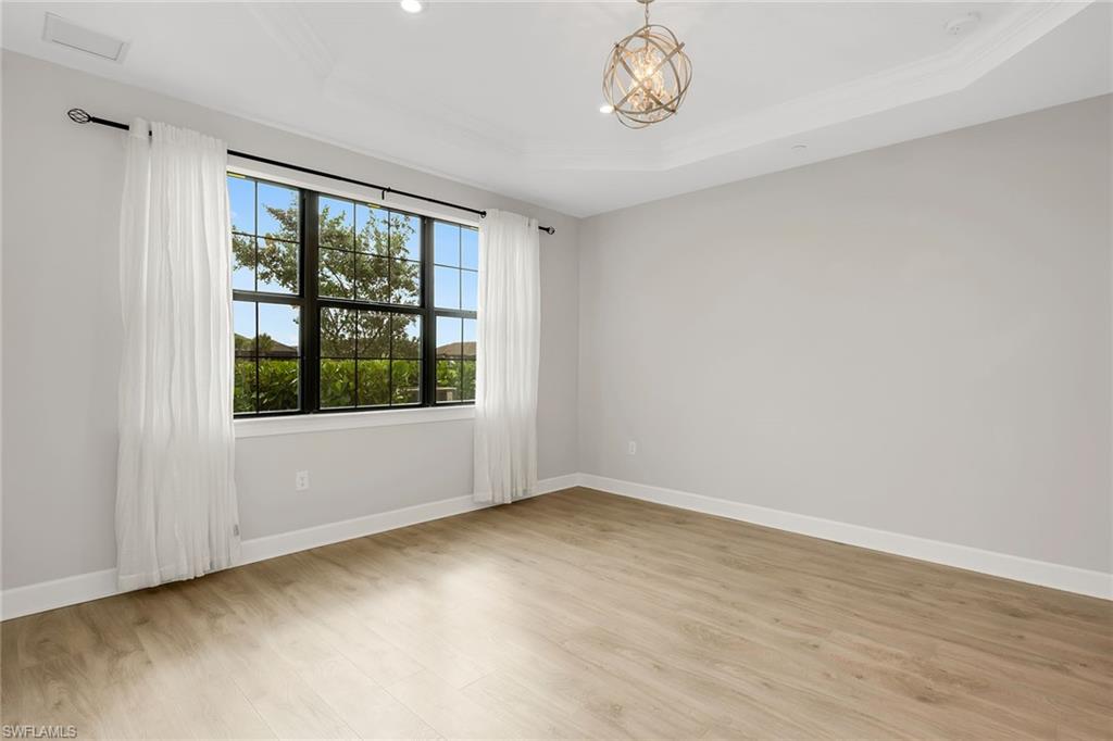 Live the resort lifestyle in this beautifully upgraded end-unit Marano model, offering abundant natural light and serene, private lake views in the sought-after Esplanade by the Islands. Built in 2022 with many thoughtful custom upgrades, this ground-floor carriage home features two spacious bedrooms plus a den and two and a half baths, all designed for elegant comfort. The open-concept layout is enhanced by luxury plank flooring in the main living areas, crown molding, and recessed lighting. The gourmet kitchen is a standout with premium stainless steel appliances, 42-inch level 5 upper cabinetry with soft-close doors, quartz countertops, upgraded backsplash, custom rollouts, and a striking white farmhouse sink. A large island with bar seating and pendant lighting connects seamlessly to the living room, which features a cozy fireplace, custom built-in cabinetry, and floating shelves. Zero-corner sliders fully retract to the screened lanai, ideally framing breathtaking wide water views and creating a seamless indoor-outdoor living experience. The owner’s suite is a luxurious retreat with a tray ceiling, beautiful lake views, and an elegant en-suite bath featuring dual quartz vanities with a makeup counter, a frameless walk-in shower with bench, and a spacious walk-in closet with built-in shelving. The second guest bedroom offers a private patio and an en-suite bath with a shower/tub combo, while a convenient powder bath is off the hallway. The den, complete with a modern ceiling fan, provides versatile space for a home office or study. The laundry area includes overhead cabinetry and a GE washer and dryer. Additional features include impact-resistant doors and windows for storm protection and peace of mind, as well as a private one-car garage for added storage and convenience. Residents of Esplanade by the Islands enjoy unparalleled resort-style amenities including a resort-style pool with towel service, lap pool, Bahama Bar & Grill, spa and salon, tennis and pickleball courts, fitness center, satellite community pool, outdoor barbecue area, fire pit, dog park and a soon-to-open culinary center. Just minutes from Marco Island’s beaches and shopping, dining and arts of downtown Naples, this home combines custom finishes, modern comfort and vibrant lifestyle in one exceptional package.