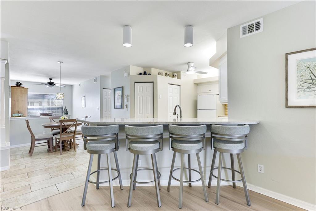 1st Floor Condo offering 2 bedrooms plus Den and 2 baths. Enter to a welcoming neutral atmosphere, tile flooring in the kitchen, dining and bathrooms and wood look luxury laminate throughout the remainder of the condo. The open kitchen features beautiful neutral colored granite countertops, tile backsplash and all new cabinetry offering plenty of storage. The versatile den is great for a home office or even create a perfect place to enjoy your favorite book. The split bedroom floor plan gives friends/family a retreat of their own, while the spacious primary boast an upgraded ensuite with a walk in closet, dual sinks and walk-in shower. Step outside to the spacious screened-in lanai and enjoy serene lake and fountain views and sounds and bask in Southwest Florida’s spectacular weather. Stone-coated steel roofs replaced community-wide in 2020 for peace of mind and durability. Resort-Style Living at Lighthouse Bay: This gated community is packed with amenities, including:5 pools, including a lap pool 2.5miles of walking/jogging paths A robust bocce program Tennis courts with a pro on staff 2 boat houses, a fitness center, sauna, clubhouse, and library Arts & Learning Center and more! As a bonus, a Bronze Membership to the Brooks Commons Club is included, granting access to a private restaurant, enrichment center, pickleball, vibrant social programs, and more. Prime Location. Enjoy being just minutes from Coconut Point Mall, dining, entertainment, SWFL International Airport, and pristine beaches. This is your opportunity to live the Southwest Florida lifestyle in style and comfort—schedule your private showing today!