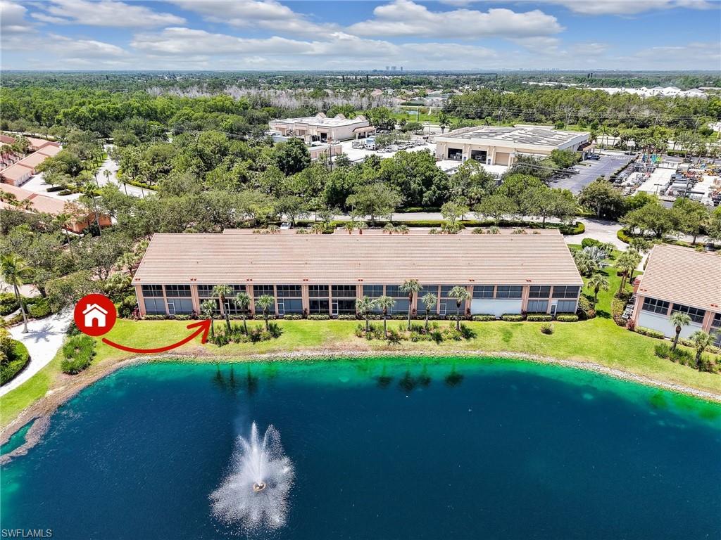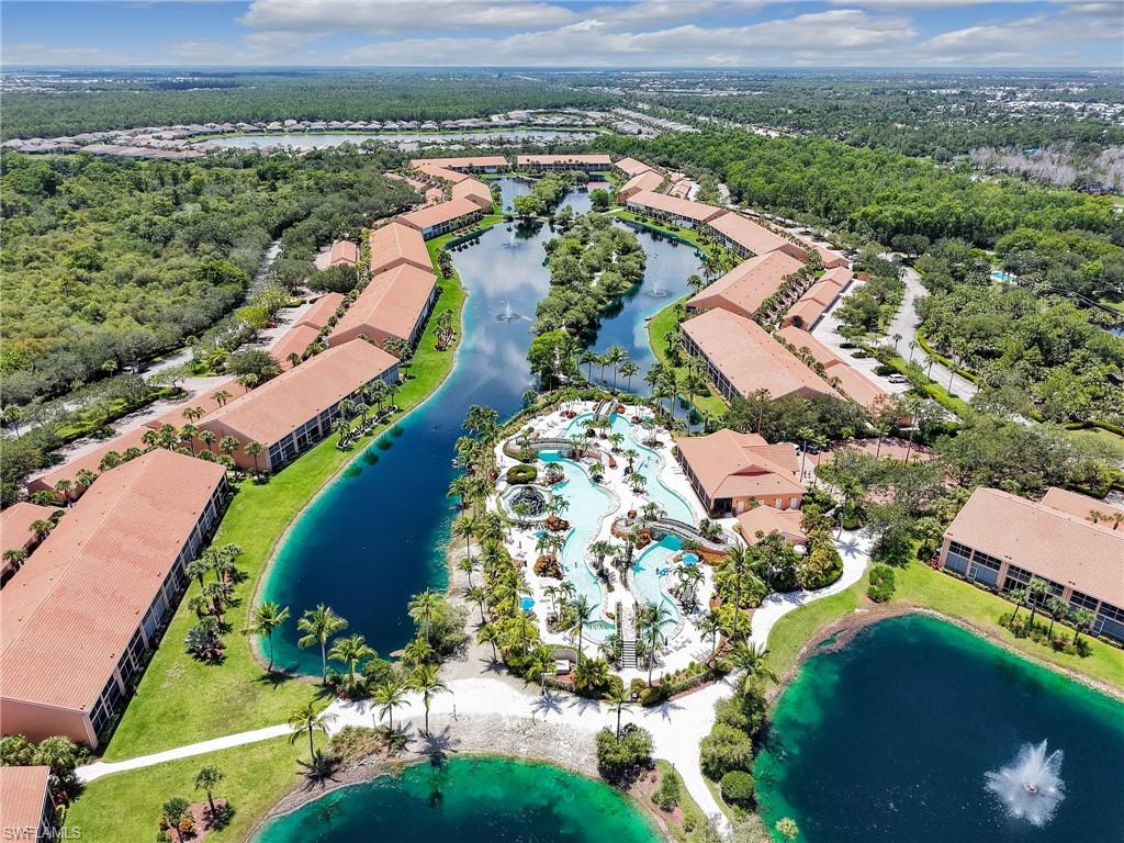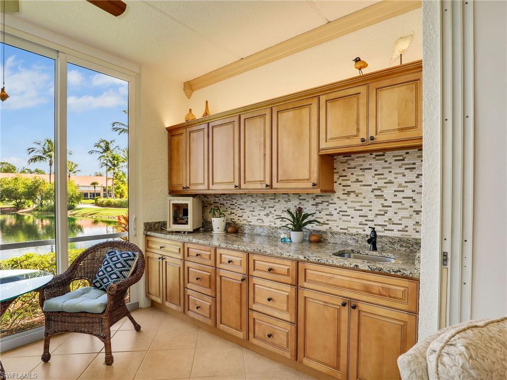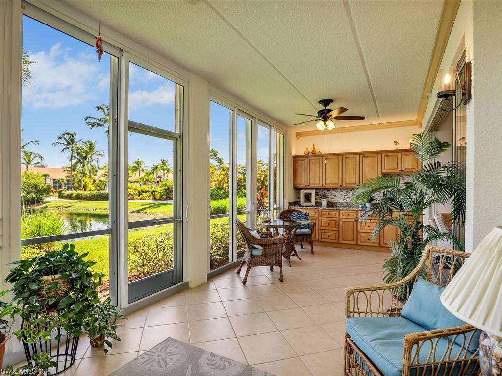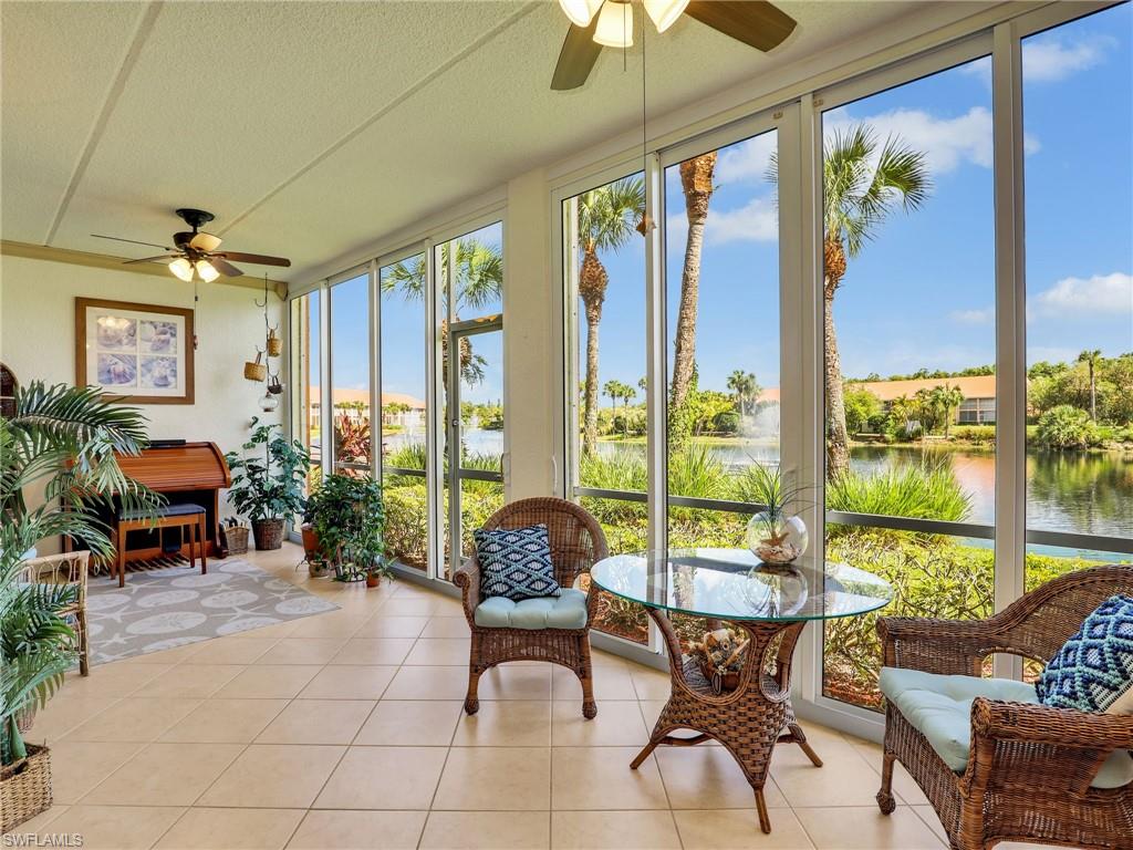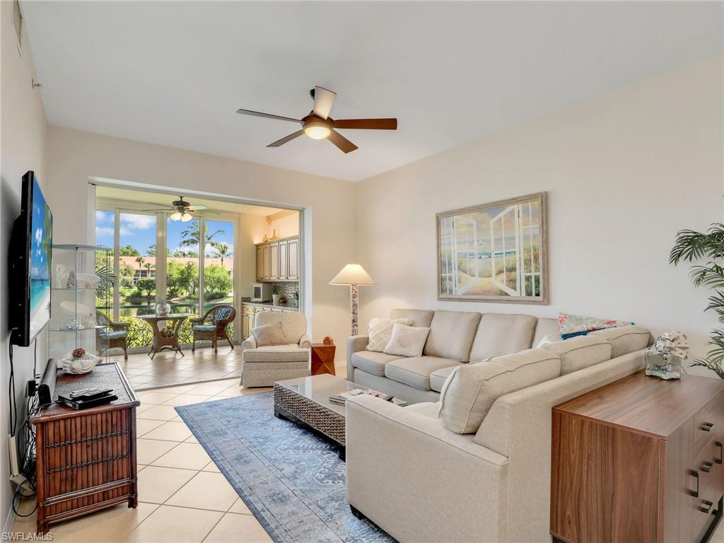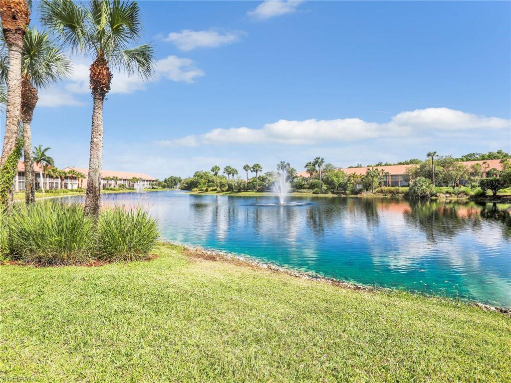 Discover this picture perfect model like first-floor condo in Falling Waters Beach Resort, offered turnkey-furnished. This updated home boasts captivating lake and fountain views from virtually every room in this spacious open floor plan. All flooring features diagonally laid tile throughout the property including the lanai. The kitchen is a chef's delight, equipped with stainless steel appliances, custom cabinets, rich granite countertops, and a tasteful tile backsplash. Both bathrooms are equally impressive showcasing new cabinets, fixtures, granite countertops, frameless glass shower doors, and custom tiled shower walls. Enjoy the expanded living area of the enclosed Lanai with custom Cabinets, granite counters and crown molding. Beyond the world renowned appeal of the” lazy river” resort style pool, Falling Waters Beach Resort provides an array of amenities for an active lifestyle, including a sparkling lap pool, pickleball courts, tennis courts, shuffleboard, and bocce ball. The community also fosters a vibrant social scene with numerous clubhouse activities, along with ample opportunities for walking, jogging, and biking. Ideally nestled between Naples and Marco Island, the resort's prime location provides convenient access to world-class shopping, dining, and the renowned Naples sugar sand beaches. Condo fees cover basic cable, water, sewer, trash, pest control, and lawn and tree maintenance, ensuring a worry-free living experience.