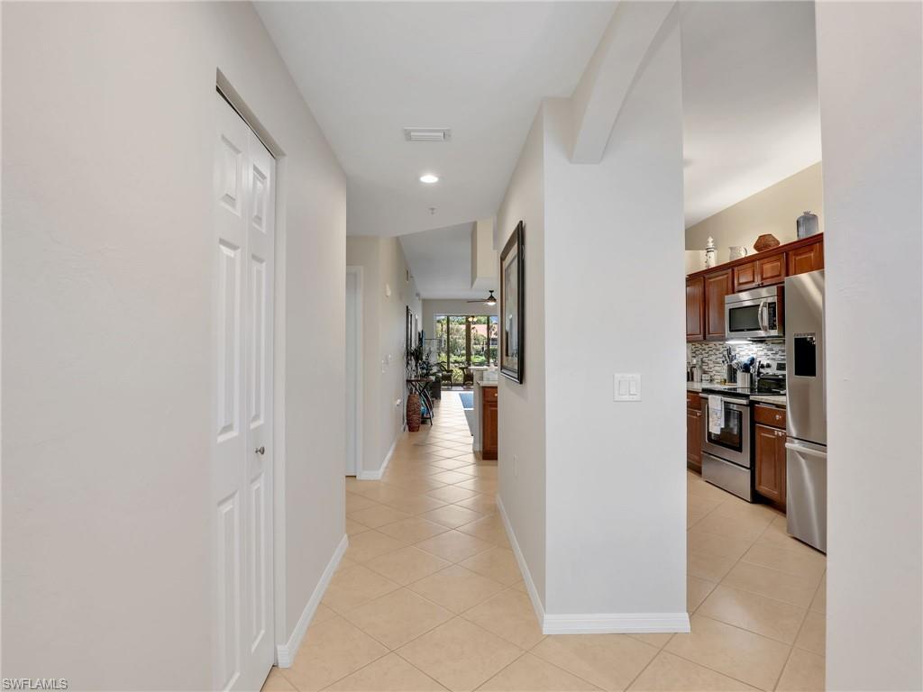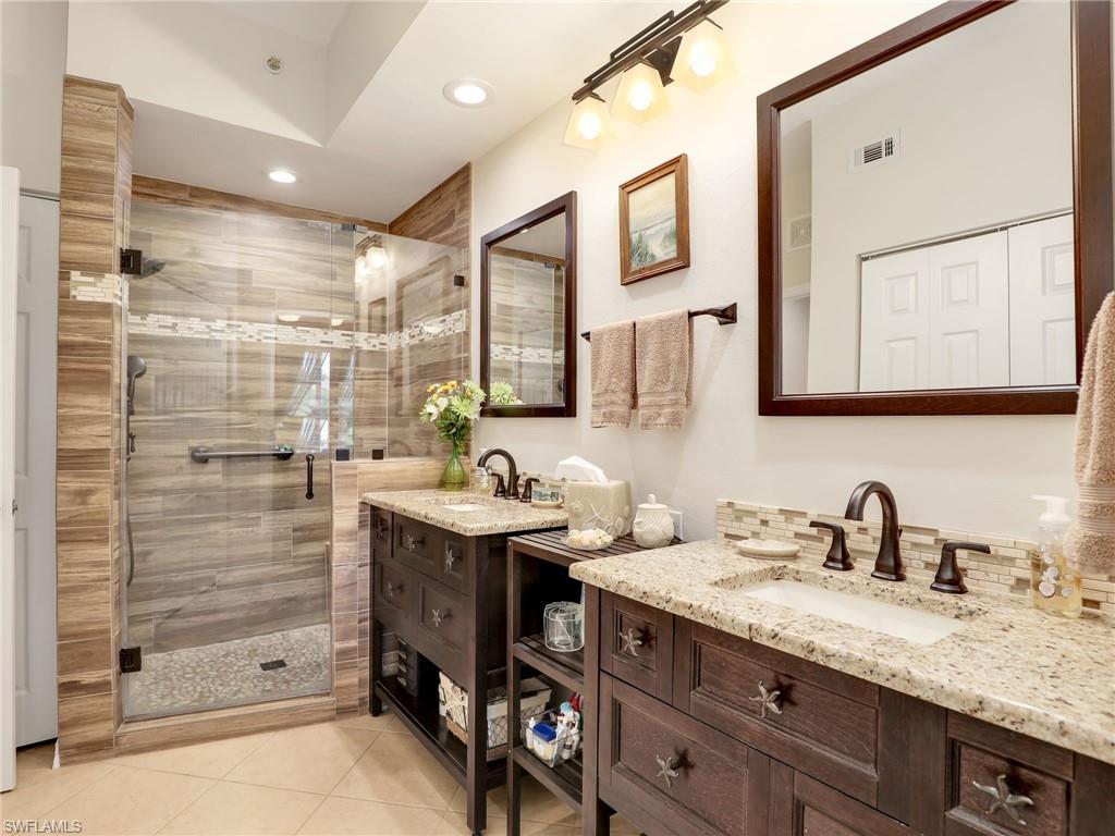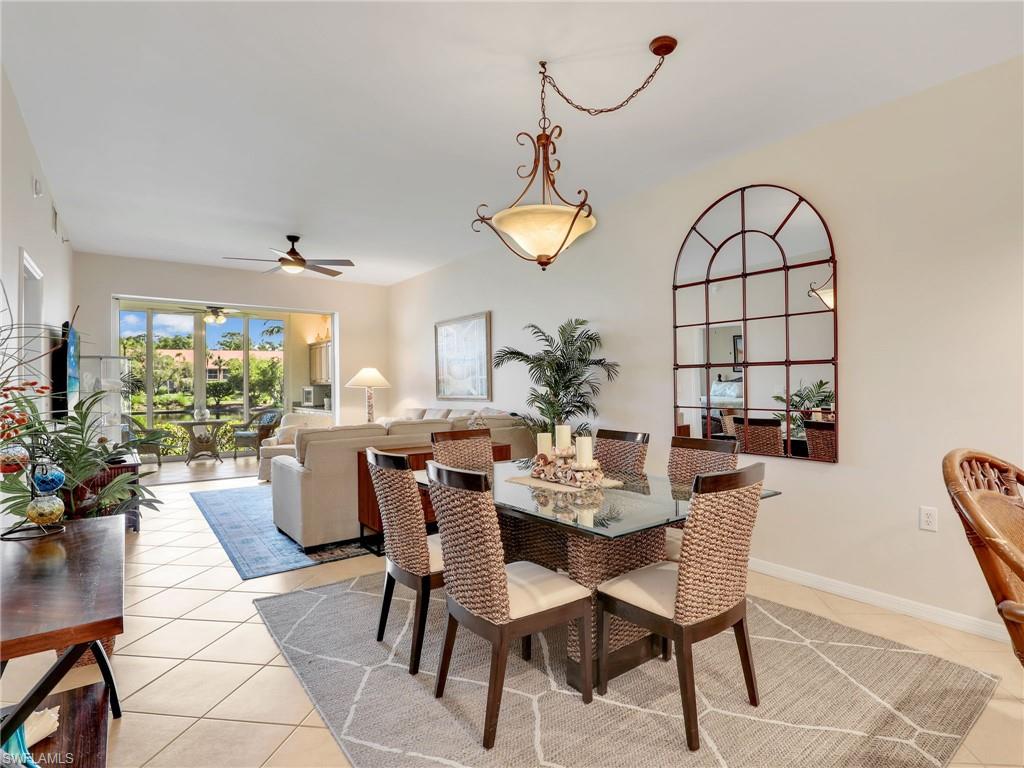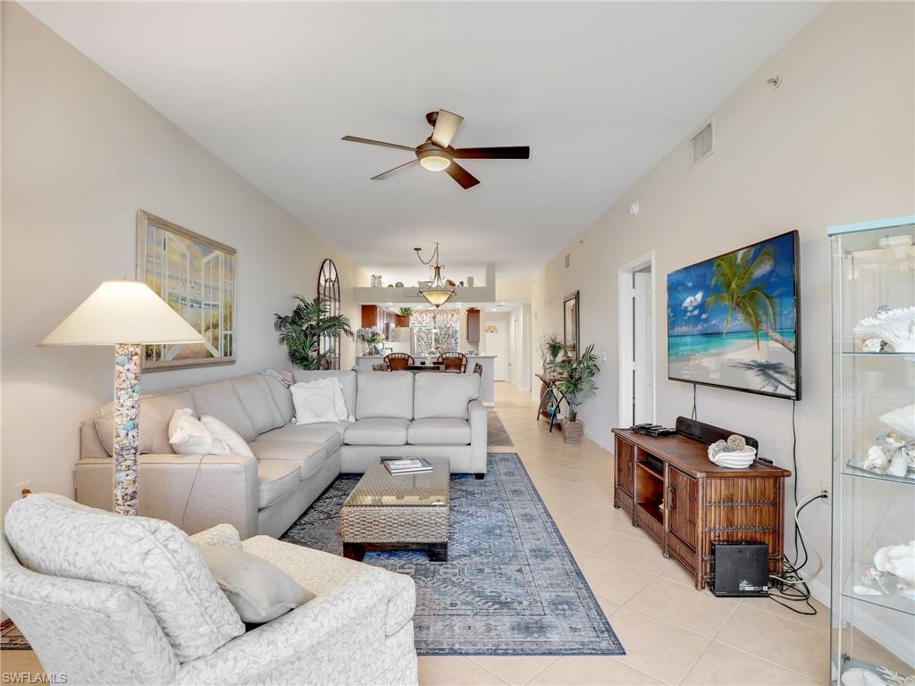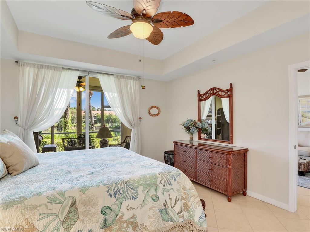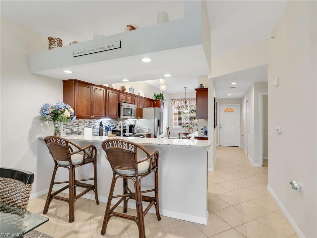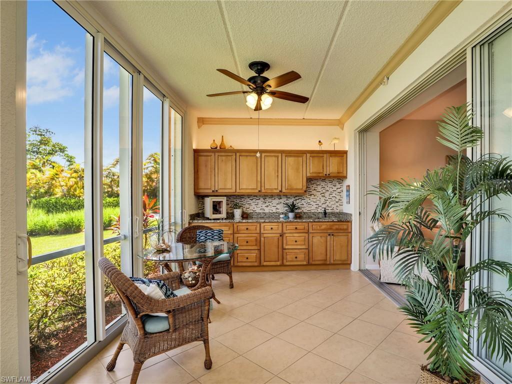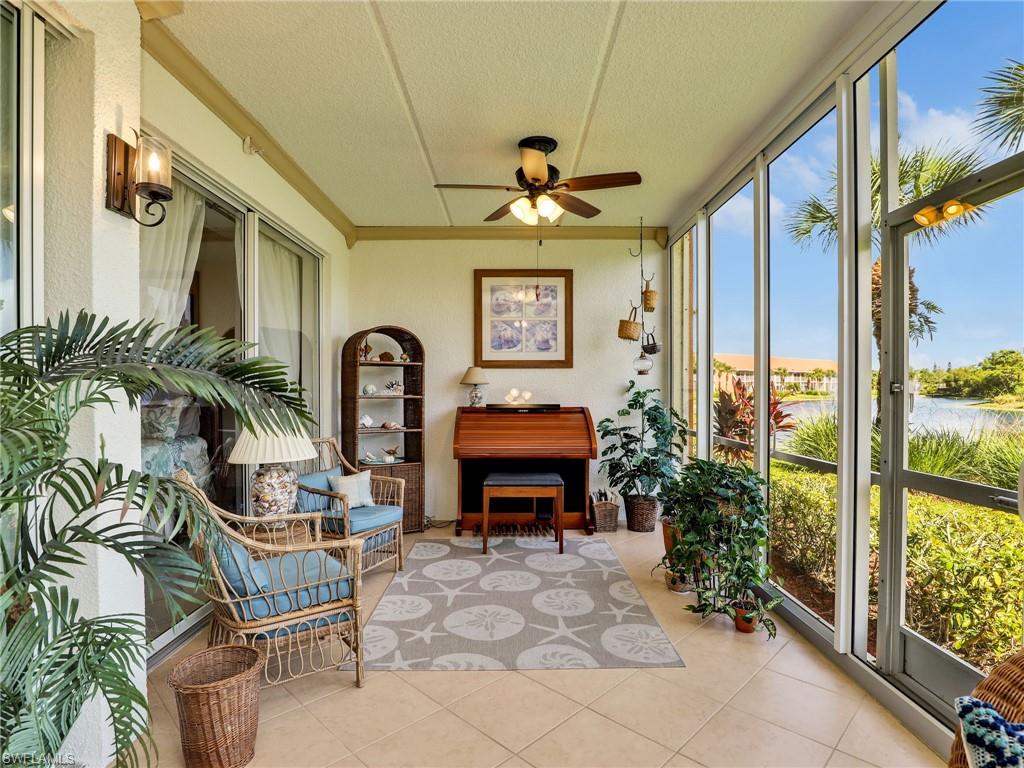 Discover this picture perfect model like first-floor condo in Falling Waters Beach Resort, offered turnkey-furnished. This updated home boasts captivating lake and fountain views from virtually every room in this spacious open floor plan. All flooring features diagonally laid tile throughout the property including the lanai. The kitchen is a chef's delight, equipped with stainless steel appliances, custom cabinets, rich granite countertops, and a tasteful tile backsplash. Both bathrooms are equally impressive showcasing new cabinets, fixtures, granite countertops, frameless glass shower doors, and custom tiled shower walls. Enjoy the expanded living area of the enclosed Lanai with custom Cabinets, granite counters and crown molding. Beyond the world renowned appeal of the” lazy river” resort style pool, Falling Waters Beach Resort provides an array of amenities for an active lifestyle, including a sparkling lap pool, pickleball courts, tennis courts, shuffleboard, and bocce ball. The community also fosters a vibrant social scene with numerous clubhouse activities, along with ample opportunities for walking, jogging, and biking. Ideally nestled between Naples and Marco Island, the resort's prime location provides convenient access to world-class shopping, dining, and the renowned Naples sugar sand beaches. Condo fees cover basic cable, water, sewer, trash, pest control, and lawn and tree maintenance, ensuring a worry-free living experience.