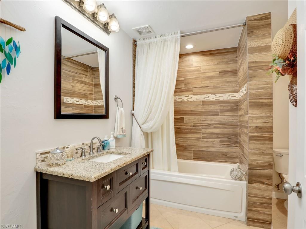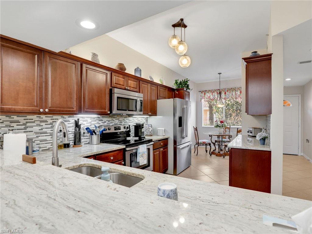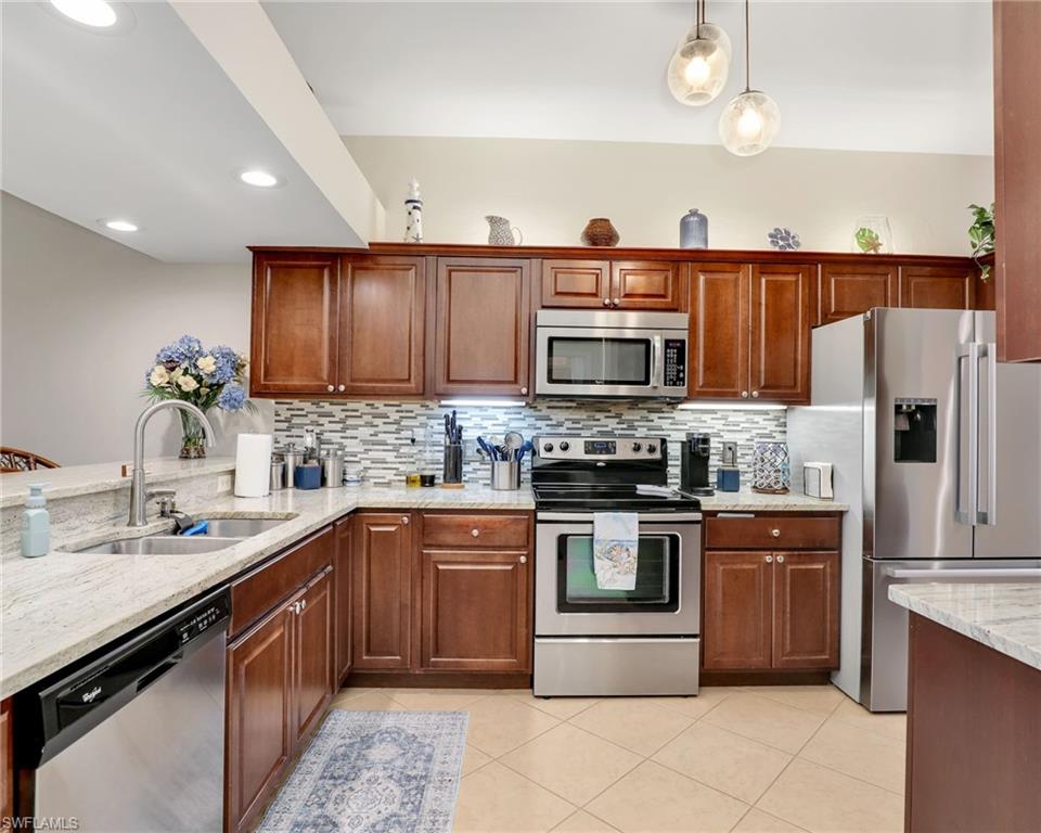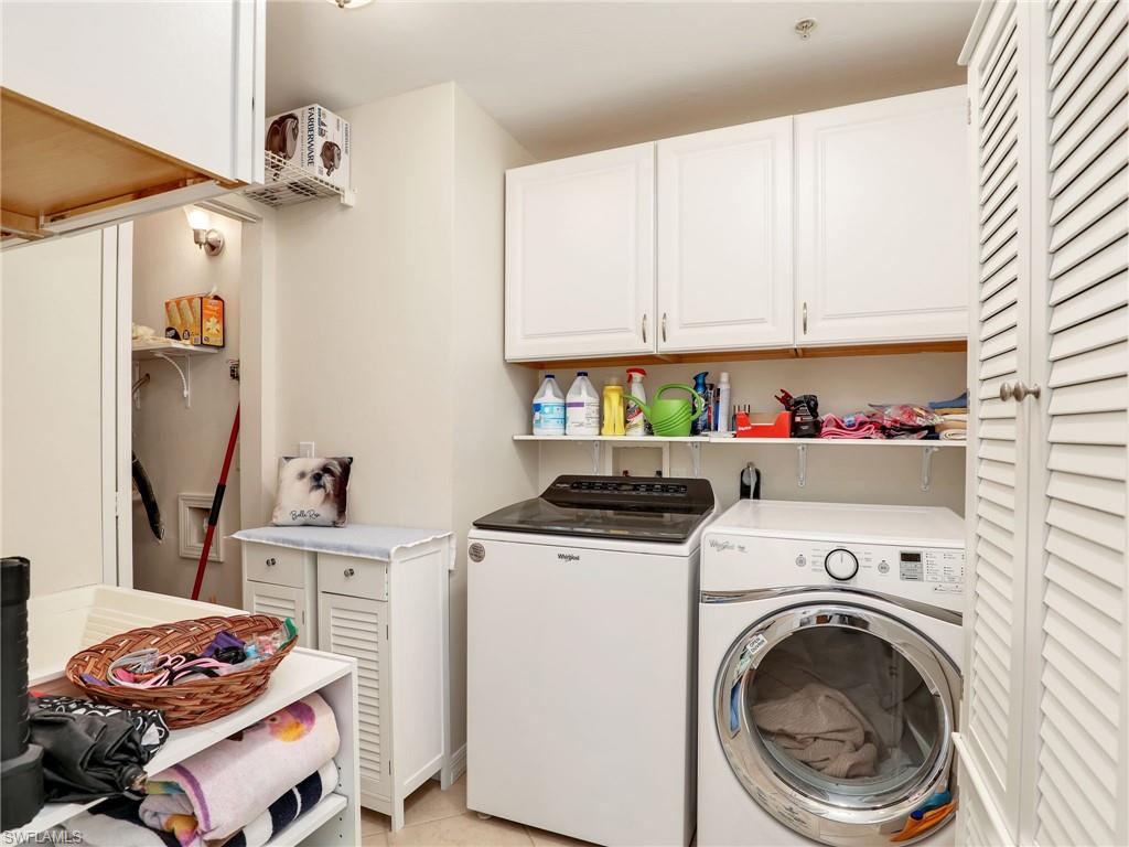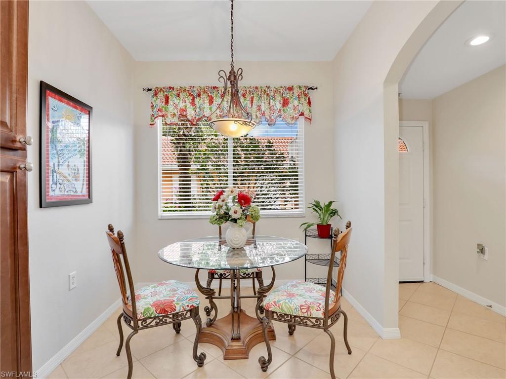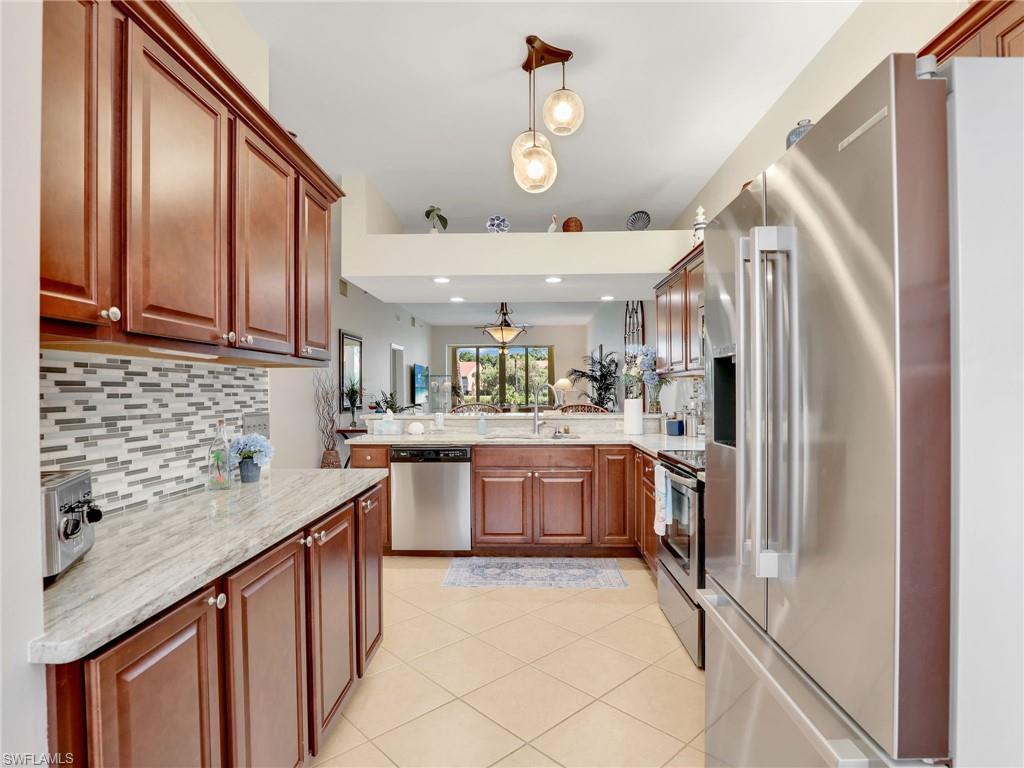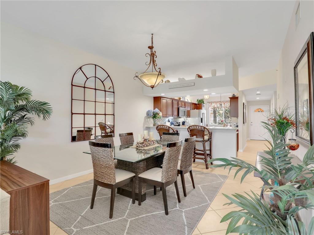 Discover this picture perfect model like first-floor condo in Falling Waters Beach Resort, offered turnkey-furnished. This updated home boasts captivating lake and fountain views from virtually every room in this spacious open floor plan. All flooring features diagonally laid tile throughout the property including the lanai. The kitchen is a chef's delight, equipped with stainless steel appliances, custom cabinets, rich granite countertops, and a tasteful tile backsplash. Both bathrooms are equally impressive showcasing new cabinets, fixtures, granite countertops, frameless glass shower doors, and custom tiled shower walls. Enjoy the expanded living area of the enclosed Lanai with custom Cabinets, granite counters and crown molding. Beyond the world renowned appeal of the” lazy river” resort style pool, Falling Waters Beach Resort provides an array of amenities for an active lifestyle, including a sparkling lap pool, pickleball courts, tennis courts, shuffleboard, and bocce ball. The community also fosters a vibrant social scene with numerous clubhouse activities, along with ample opportunities for walking, jogging, and biking. Ideally nestled between Naples and Marco Island, the resort's prime location provides convenient access to world-class shopping, dining, and the renowned Naples sugar sand beaches. Condo fees cover basic cable, water, sewer, trash, pest control, and lawn and tree maintenance, ensuring a worry-free living experience.