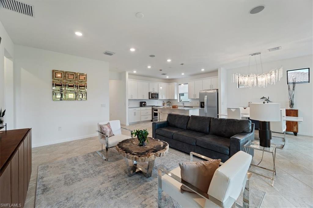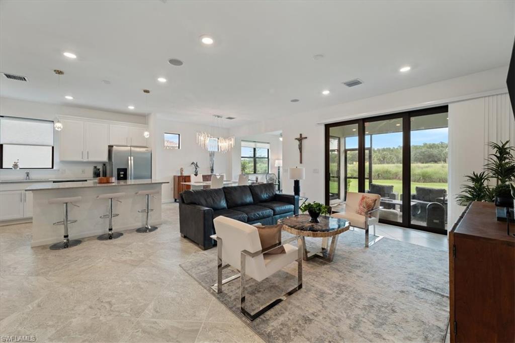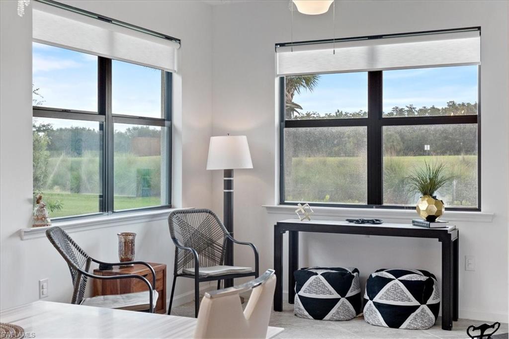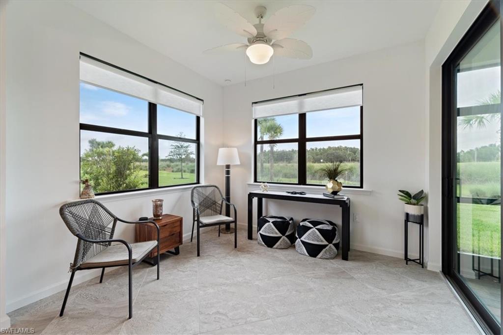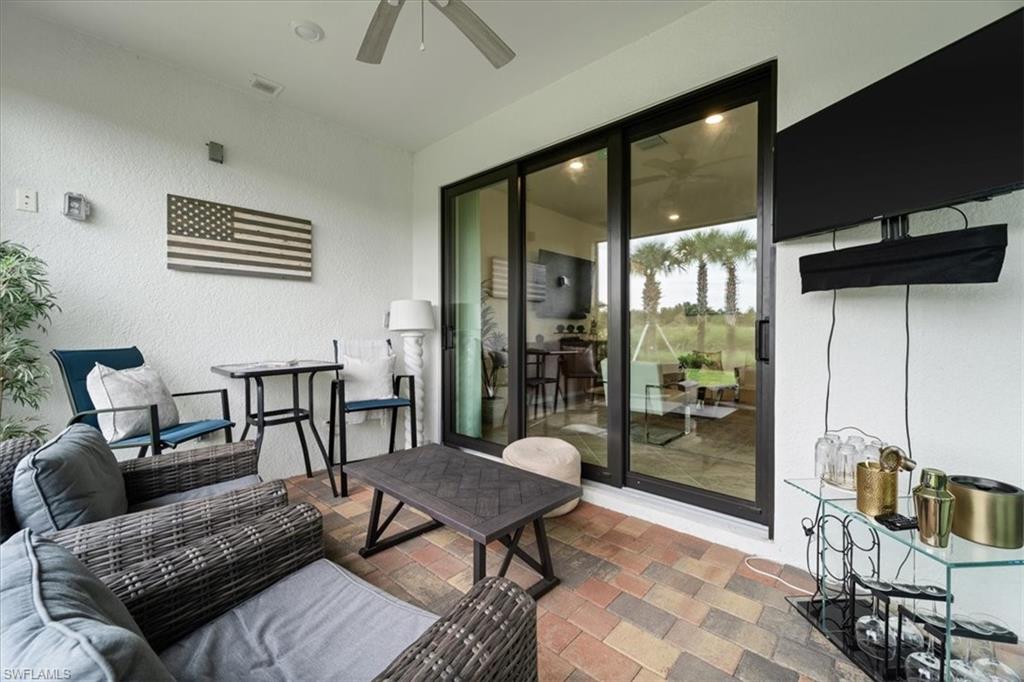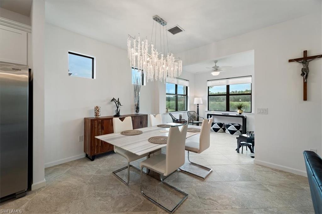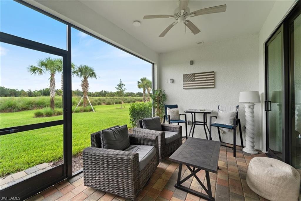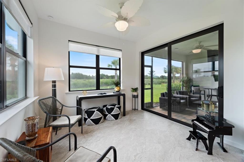 Welcome Home to this spectacular Prestige Pulte built home in the Del Webb 55+ community located in Ave Maria, FL. Tasteful upscale enhancements abound in this highly UPGRADED home! EXTENDED room off dining area with sliders in both the extended room and the living room area, SONOS Sound system, upgraded cabinets throughout including crown molding and extended draws in kitchen, quartz counters, SS appliances, large kitchen island, upgraded tile level placed on the diagonal, 8 ft doors, professionally installed blinds throughout with cordless blinds in all windows for easy up and down motion and a remote controlled blind in the sliders. The living room has built-in Sonos surround sound, installed floor outlet in center of room. Whole home is set up as a smart home with extended WIFI that can be extended out to the Lanai, plus every room wired for cable hookup including the Lanai. The Master bathroom has seamless glass shower door, quartz counters with double sinks, floor to ceiling tiles in both bathrooms. The exterior front elevation is upgraded, landscaping is enhanced with outdoor lighting, the lanai is plumbed for an outdoor kitchen installation. The master bathroom also has a convenient pass through window (with door) to the laundry room. Amenities include two pools, spa, pickleball, library, cafe, large event room, fitness gym, card, billiards and meeting rooms. Come experience life to the fullest where there are activities for everyone. With the negotiable furniture, this home could be effortlessly ready to step into so you can begin your Florida lifestyle. Welcome Home!