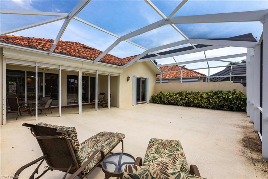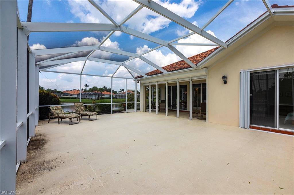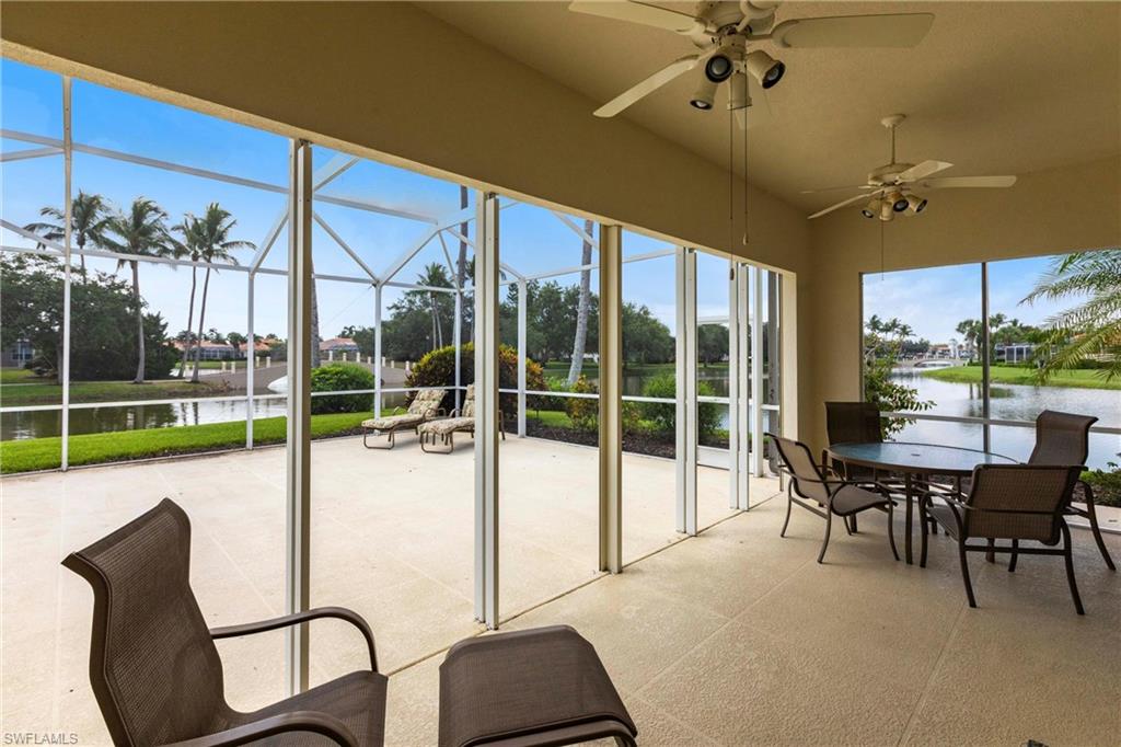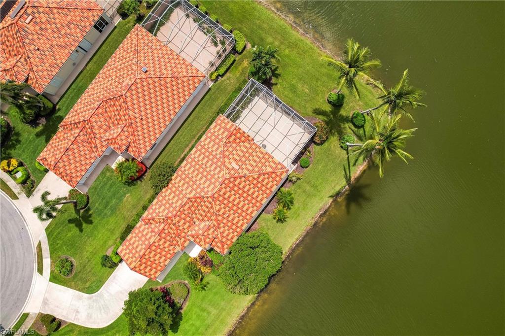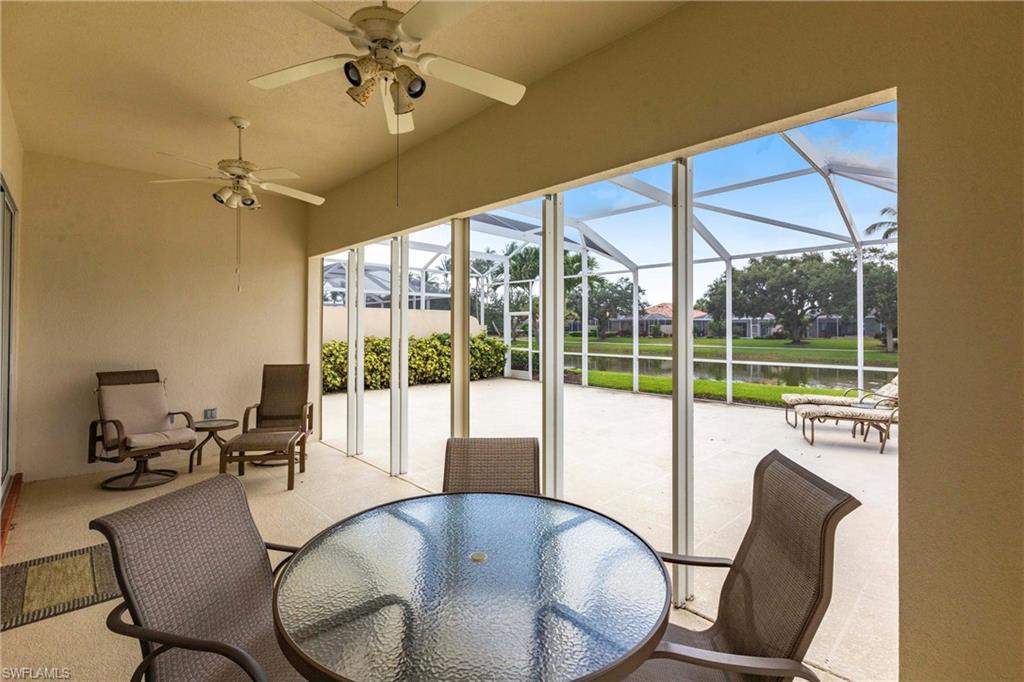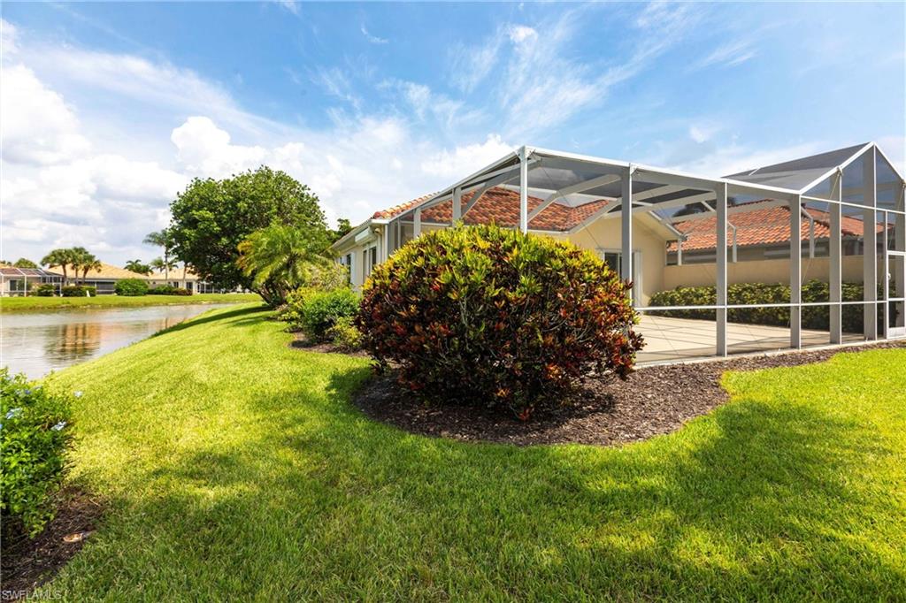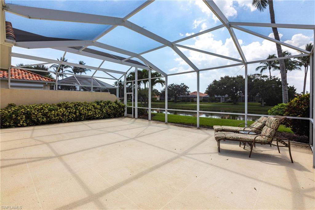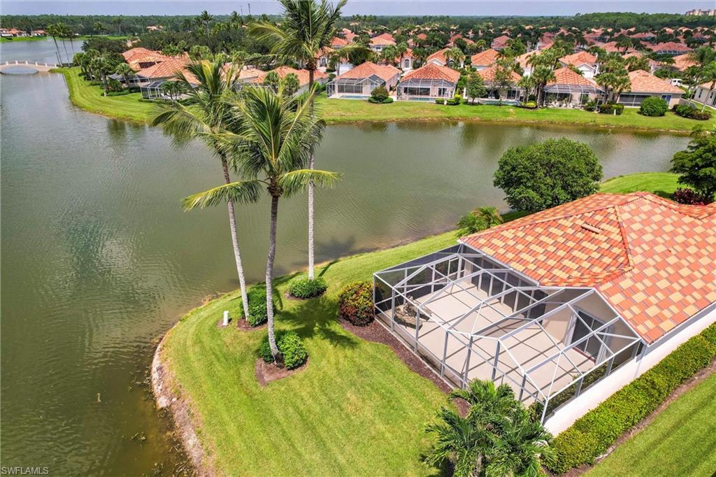 This end of cul-de-sac location is a rare find! It is just like living on an island with spectacular water views on 3 sides! There are special views out each window!! This single family 3 bedroom, plus den, 2 bath home, is the most popular floor plan this builder ever constructed. Features include, an extra large patio with a 2019 screen enclosure, roof was replaced in 2018, full hurricane shutter protection, and an extra long driveway. Village Walk in North Naples is 5 miles from Vanderbilt Beach and 4 miles to the shopping and dining gem - Mercato! Community amenities include 2 heated resort pools, har-tru tennis courts, pickleball, bocce ball, gym with lap pool, on-site restaurant, miles of paved walking paths, and so much more. You will love this special location and living in Village Walk!