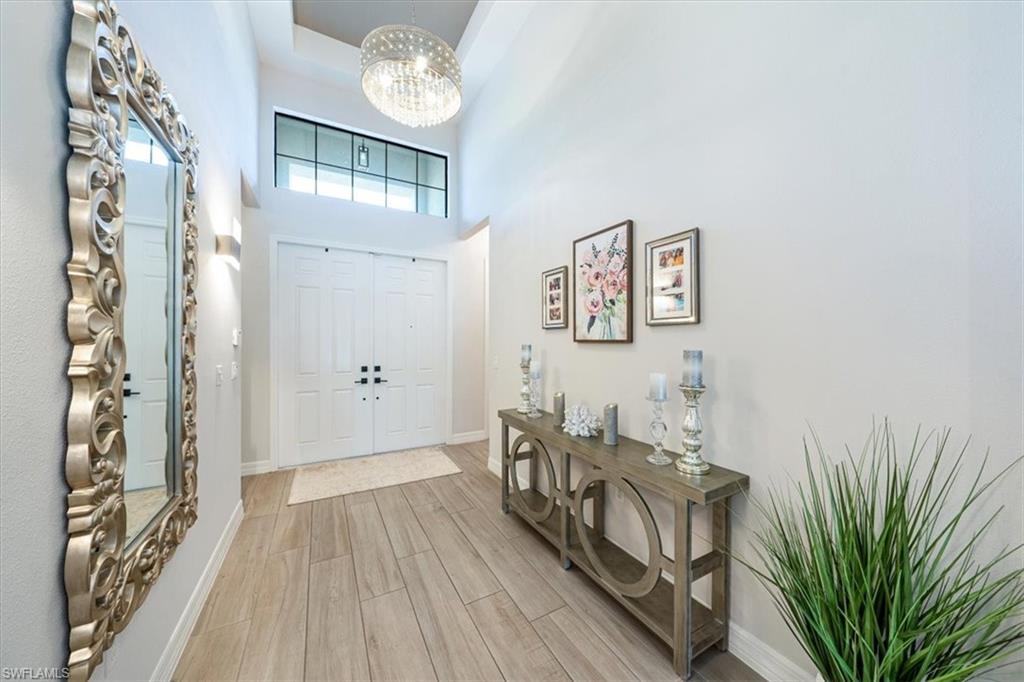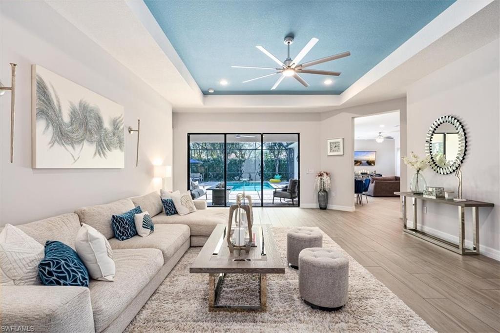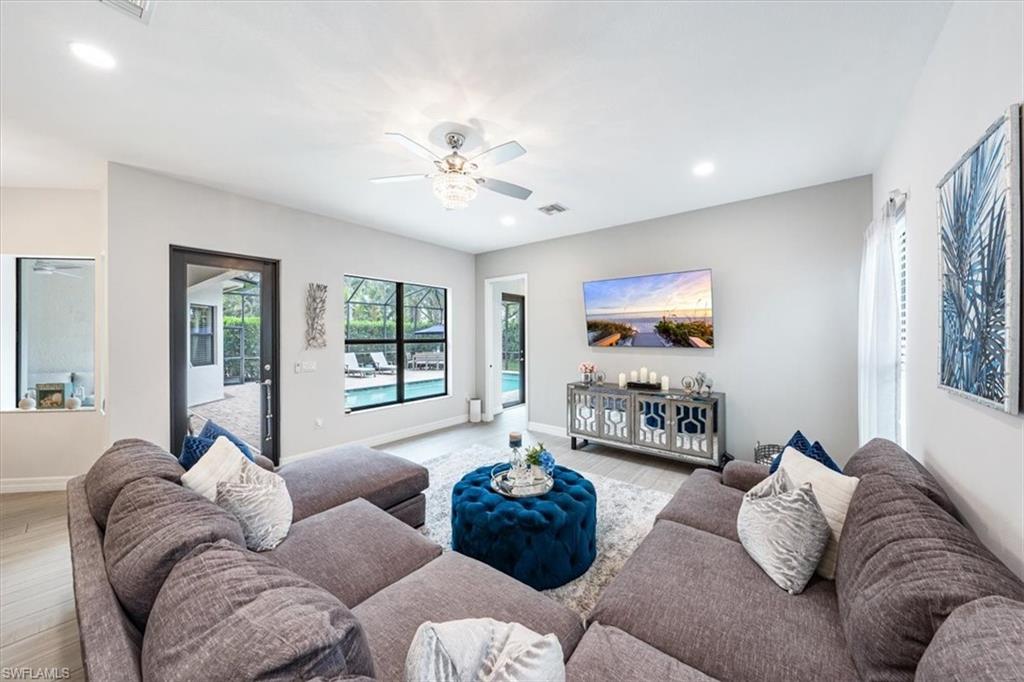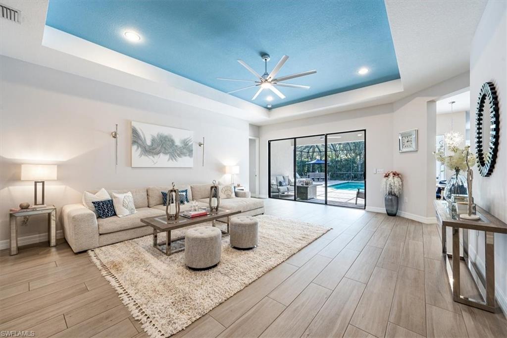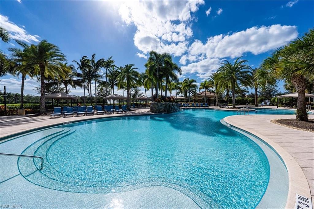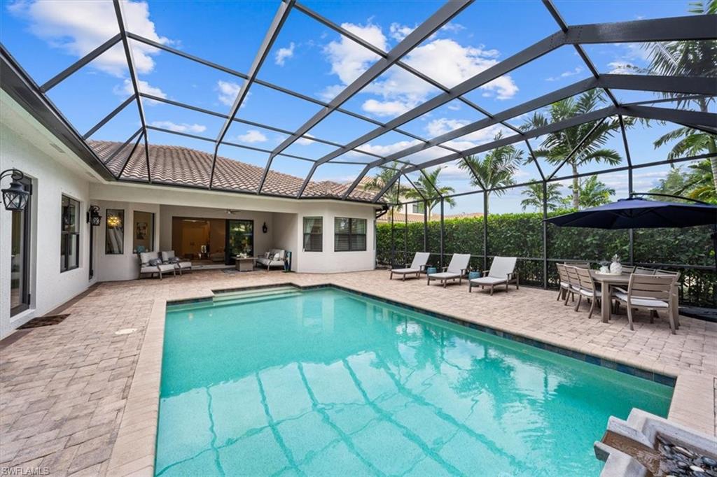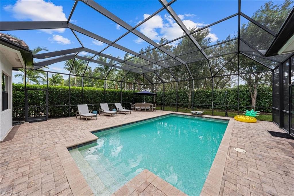 PRICED TO SELL! The largest single-story floor plan in Riverstone... the rare Drake Model! At 3,360 square feet, this sprawling home features 4 large Bedrooms, one in each corner of the home, PLUS a separate Den or Office and 4 Full Bathrooms. The luxurious layout is a perfect blend of elegance, size and comfort. With a split 3-Car Garage and huge horseshoe shaped driveway, there is always ample room for guests. This updated home offers spacious living with meticulous design. The kitchen features quartz countertops, stainless steel appliances, and a reverse osmosis water system. Two separate living areas provide flexibility for gatherings and relaxation, while the large den with bay window offers a private retreat, office, or separate media Room. The master suite boasts a newly remodeled bathroom with walk-in shower, soaking tub, & two walk-in closets. Step outside to your own completely private oasis with a heated pool, enclosed lanai, and beautifully landscaped view. NEW Pool Pump & New A/C Unit July 2025. Located in the active and ever popular Riverstone community, you are a short 10 minute drive to white sandy beaches and have access to some of the best schools and restaurants in Naples. This gated community offers a resort-style pool, lap pool, splash pad, jacuzzi, tiki bar, tennis & pickleball, indoor & outdoor basketball courts, playground, fitness center, activities director, yoga room, billiards game room and 24 hour security. Welcome Home!