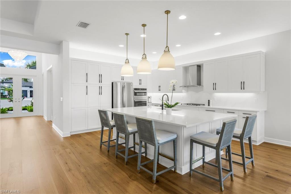 Stunning Lakefront Retreat in Valencia Trails – Your Private Oasis Awaits! Welcome to a breathtaking sanctuary nestled at the end of a peaceful cul-de-sac in the highly sought-after community of Valencia Trails. This exquisite 3-bedroom + den, 3.5-bath home boasts ultimate privacy and offers a rare opportunity to indulge in lakefront living with long, unobstructed views that will take your breath away. As you step through the grand entryway, you are greeted by soaring 14-foot ceilings that create an airy, open ambiance. Natural light floods the space through expansive windows, illuminating the elegant coastal-inspired design and highlighting the stunning wide plank wood flooring that flows seamlessly throughout—say goodbye to carpet! The heart of this home is undoubtedly the show-stopping gourmet kitchen, a dream for any culinary enthusiast. Boasting premium white solid wood cabinetry with integrated lighting, sleek quartz countertops, and a massive center island with seating for five, this kitchen is the perfect space for entertaining friends and family. High-end GE Profile appliances promise both functionality and style, while designer pendant lights and chandeliers add a touch of glamour to the heart of the home. Your luxurious primary suite is a true retreat, featuring a spa-like bathroom equipped with a custom linen closet, oversized rainfall shower, deep soaking tub, and dual vanities with stunning counter-to-ceiling mirrors. Step outside through the sliding glass doors into your very own private oasis, where the sun-drenched saltwater pool awaits—perfect for year-round enjoyment. The extended lanai, complete with dual oversized ceiling fans, offers a cool, shaded refuge for relaxation or entertaining guests. Take advantage of the magnificent custom summer kitchen, adorned with a striking waterfall-edge countertop, designed to elevate your outdoor gatherings to new heights. The spacious side yard, fence-ready and ideal for pets or play, adds to the allure of this stunning property. Additional features of this remarkable home include a three-car garage with epoxy flooring and modern floating cabinetry, full impact windows and doors for peace of mind. Enjoy the added benefit of living in a community with NO Community Development District (CDD) fees. Just a short walk or bike ride away lies the spectacular clubhouse, on-site restaurant, and lighted pickleball courts—making this not just a home, but a lifestyle filled with active living and vibrant community engagement. Opportunities like this are truly rare—don’t miss your chance to own a piece of paradise in Valencia Trails. Schedule your private showing today and step into a world of luxury, tranquility, and endless possibilities!