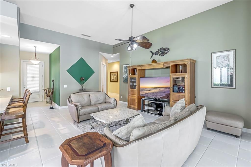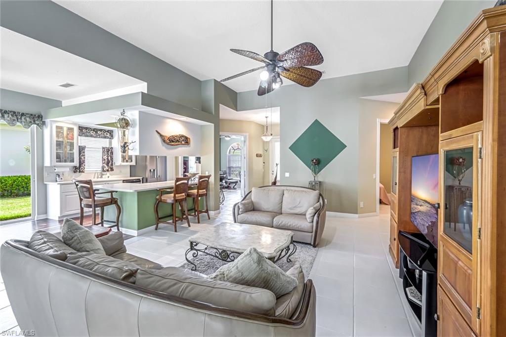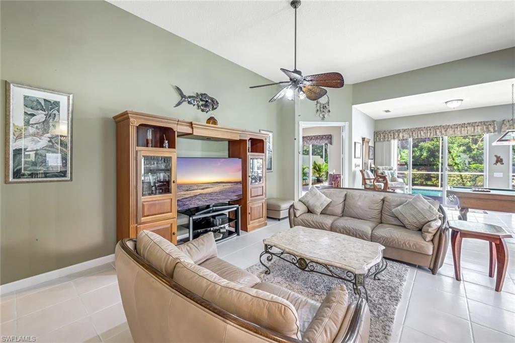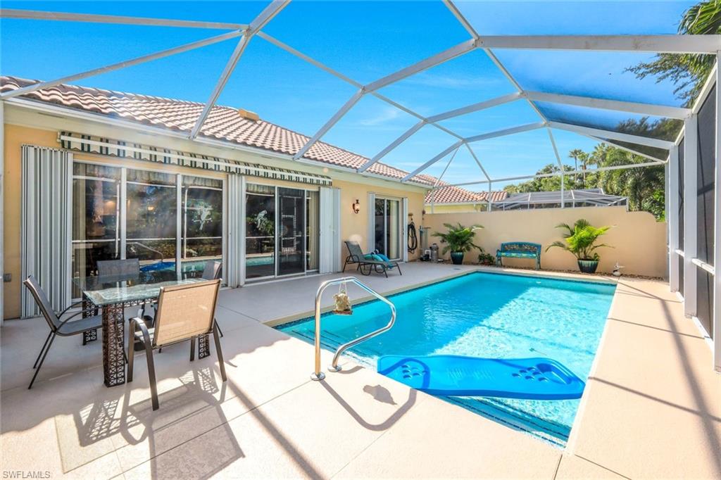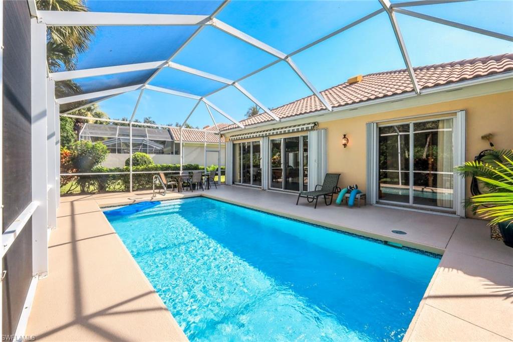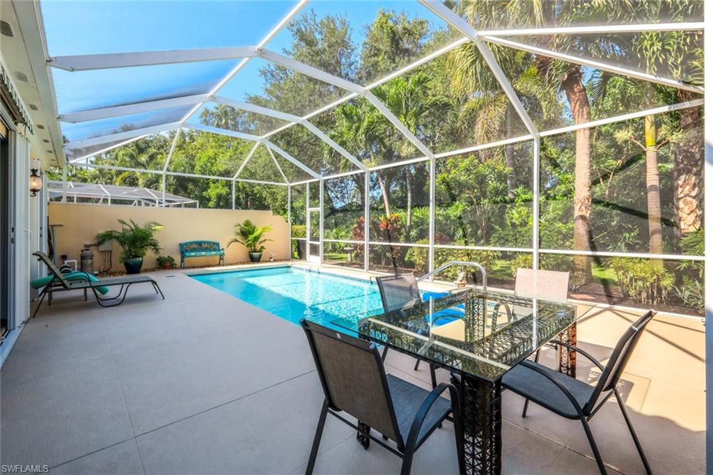 Feast your eyes on this Gorgeous Oakmont model 3 Bedroom and a Den home with the rarely available Extended Living area, which is conveniently located near the Front Entry Gate and only a short stroll to the Town Center. This home features tile throughout the living areas and a high-quality wood floor in the chef’s kitchen complete with stainless appliances and Corian countertops. Enjoy entertaining your family and friends by your own private heated pool adorned by lush tropical landscaping. There are upgraded accordion shutters for your peace of mind. The Washer and Dryer and Refrigerator were purchased in 2025. Located in one of Naples' most sought-after neighborhoods, residents enjoy access to exclusive amenities including Resort style pool, lap pool, Towncenter, Tennis, pickleball, bocce, fitness center, Restaurant, Beauty and Nail Salons, Car Wash, Gas Station and Post Office. Close to Naples’ sandy beaches, wonderful shopping, and dining, every convenience is within reach. LOW FEES include Amenities Galore, Landscape Care and HDTV and High-Speed Internet. Relax and enjoy the Naples lifestyle, come and see for yourself what Resort Living is like.