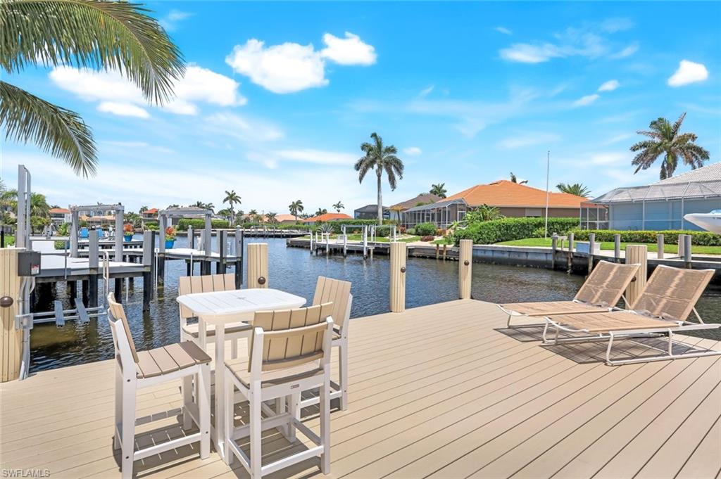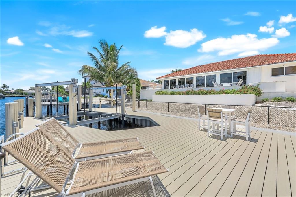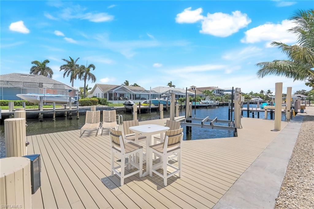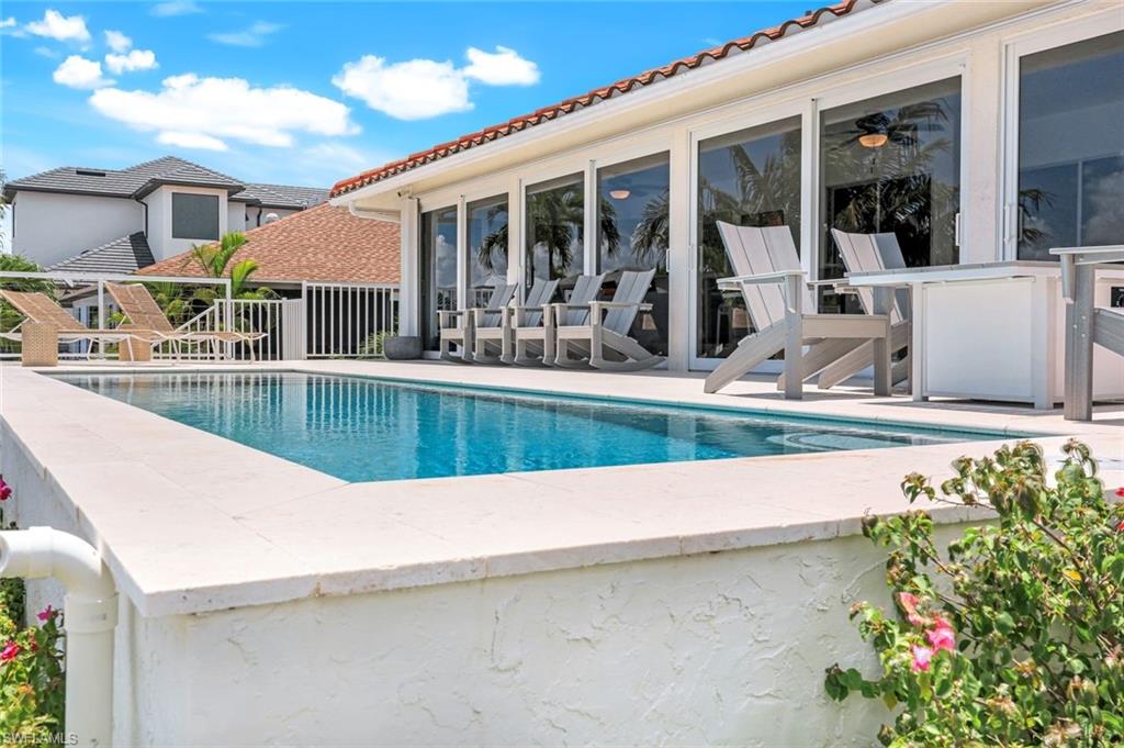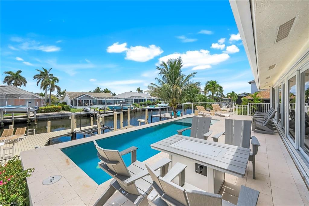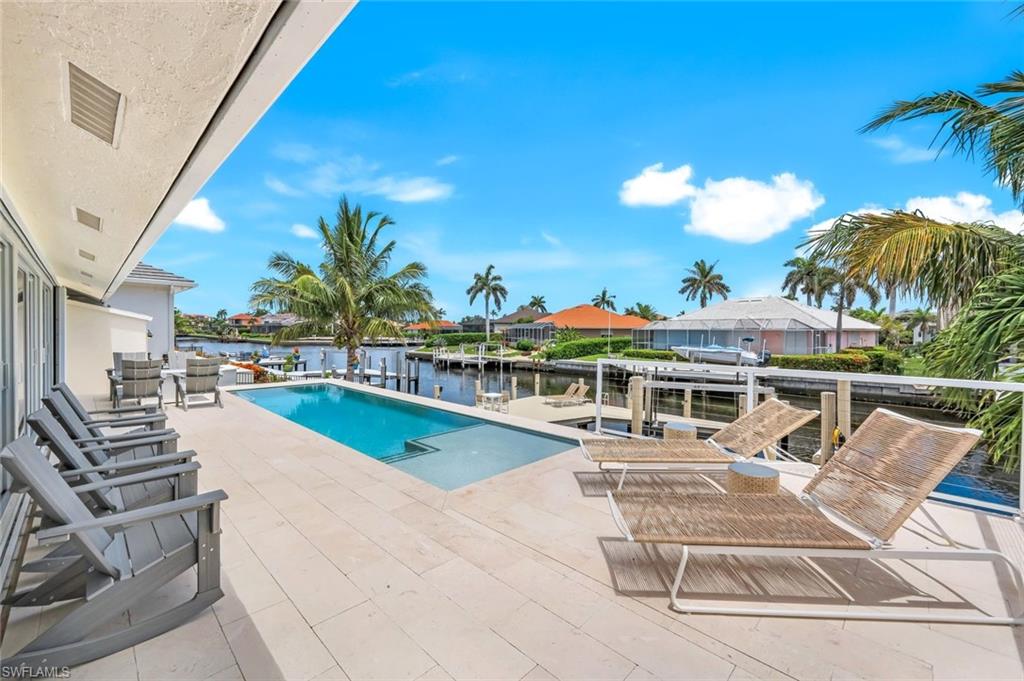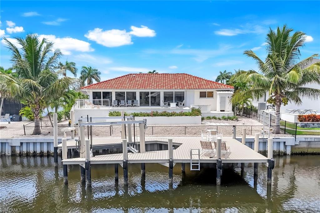 Move-in ready waterfront gem! Live the island lifestyle in this beautifully updated 3BR/2.5 BA waterfront pool home, perfectly situated on a quiet cul-de-sac just six blocks from Marco Island’s Resident’s Beach and Mackle Park. This high-elevation property offers quick Gulf access through a single 14-ft bridge to Smokehouse Bay—ideal for boaters! Enjoy peace of mind with all-NEW hurricane impact windows and sliders, NEW seawall, and a NEW dock with a 10,000 lb boat lift—everything you need for secure and effortless waterfront living. Inside, the renovation shines with coastal-inspired finishes: wood-look tile plank flooring, a spacious open-concept layout, and a chef’s kitchen featuring quartz countertops, stainless steel appliances, center island, pantry, and built-in wine fridge. Impact-resistant sliders lead to a serene outdoor space with an enclosed lanai, shell-stone tile deck, electric-heated pool with sun shelf, and tranquil canal views. Additional perks include an outdoor half bath and shower, fenced yard, circular driveway, 2-car garage, and solid concrete block construction with a tile roof. New mini split installed in enclosed lanai for added comfort. Located in a desirable, centrally located neighborhood with new construction nearby, this home is ideal as a full-time residence, vacation getaway, or high-demand rental—a rare opportunity for stylish, secure, and island living!