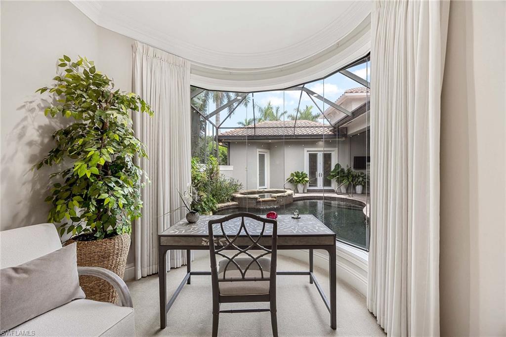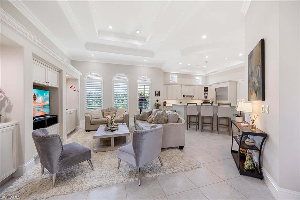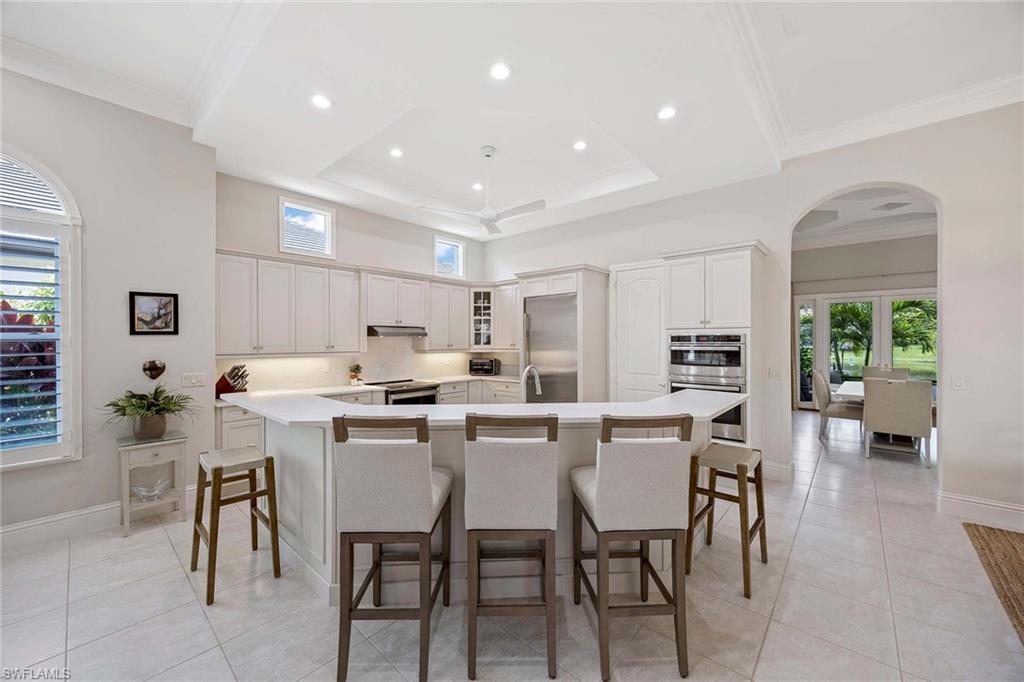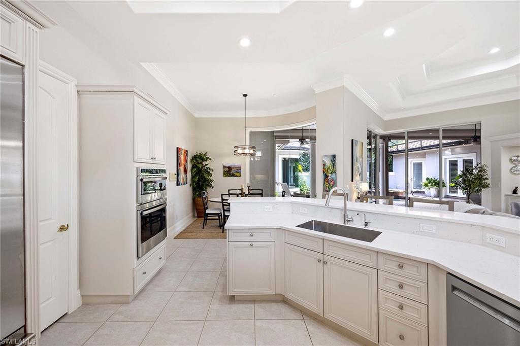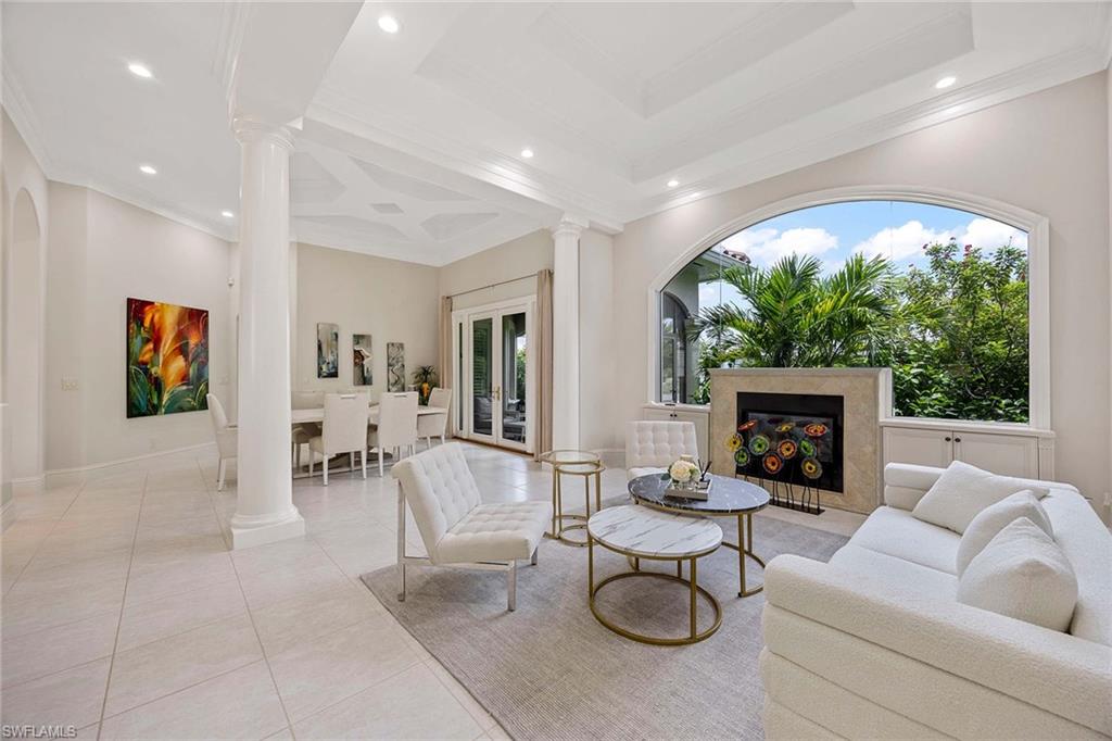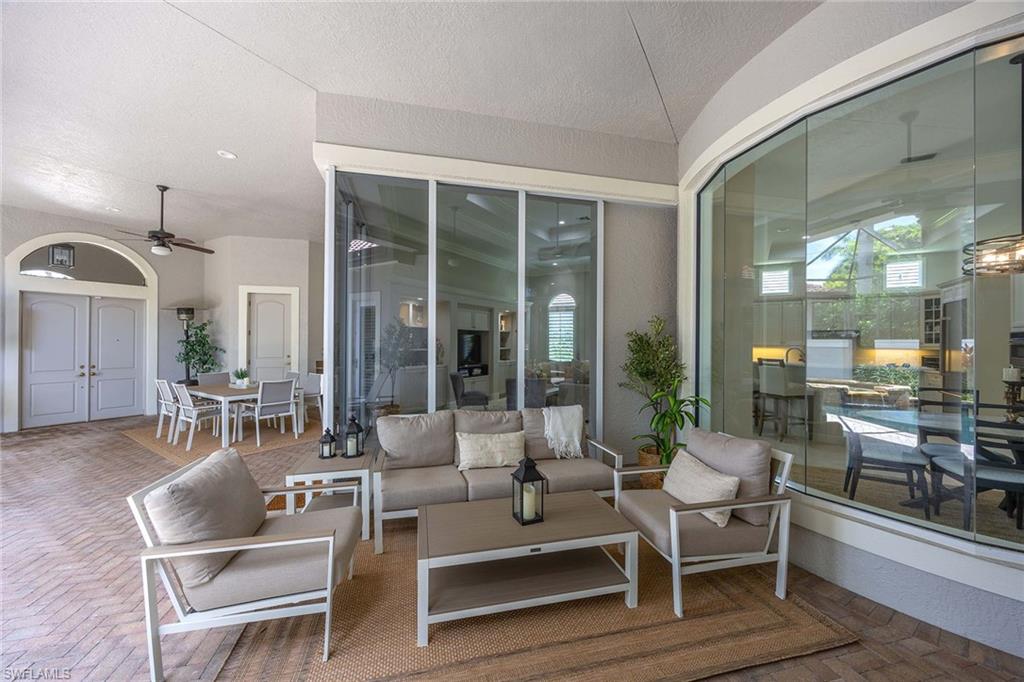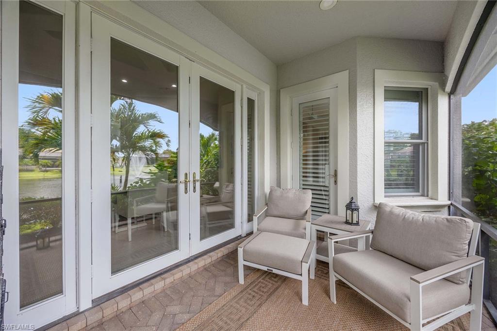 PRICED TO SELL! Turnkey furnished, updated and fabulous! Rarely available in Muirfield at Pelican Marsh, a private gated enclave of just 37 custom homes. This former model home offers 3,100 square feet of tastefully updated living space with three en-suite bedrooms, a saltwater lagoon-style pool and spa, outdoor kitchen, zero-corner sliders and a two-car garage with epoxy flooring. Newer roof (2018). Whole house generator (2020). Three air conditioners for total comfort. Enter through grand double doors into a stunning courtyard entry with pool and spa a Florida oasis. The open concept layout flows seamlessly with porcelain tile flooring throughout, combining leisure and formal dining areas with a beautifully renovated kitchen featuring a neutral white cabinetry, quartz countertops, a stainless-steel induction range with hood, built-in oven/microwave combo, large walk-in pantry and counter-height seating. The elegant living room with a gas fireplace (propane) opens to serene lake and fountain views with eastern exposure. The spacious primary suite offers a cozy sitting area overlooking the pool, dual custom closets, jetted tub, dual vanities and a separate shower. Residents of Pelican Marsh enjoy 24/7 staffed gatehouse, private golf club, clubhouse, tennis and pickleball center, The Court restaurant, fitness center, bocce, biking paths, playground and more. One of the best locations in Naples. All just minutes from white sand beaches, fine dining and everything Naples!