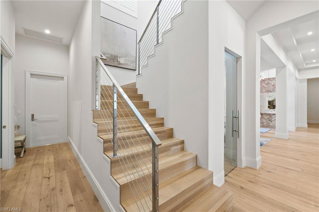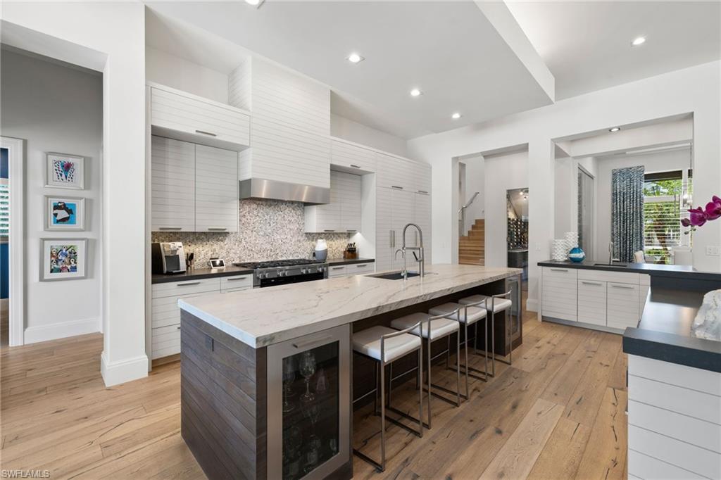 Welcome to 745 Riviera Drive — a stunning Modern Transitional masterpiece nestled on one of the most prestigious streets in The Moorings. This award-winning residence offers a rare blend of timeless architecture, cutting-edge technology, and sophisticated Florida living at its finest. Spanning 4,912 sq. ft. under air, this custom-built home features 4 spacious bedrooms, 4.5 designer bathrooms, a private office, bonus room, gym, and 3 car garage offering both comfort and flexibility. Wide-plank wood flooring flows throughout the main living area, complementing the clean lines and warm textures that define this home’s architectural elegance. The heart of the home is a chef’s dream kitchen, featuring custom cabinetry, dual islands, two dishwashers, two beverage drawers, a wet bar with ice maker, and top-of-the-line appliances including a Miele 8 burner gas cook top all seamlessly integrated withControl4 Smart-Home technology for lighting, audio, televisions and HVAC. A true showstopper, the brick-walled wine room is framed by a dramatic floating staircase with stainless steel cable railings and a sleek glass enclosure—perfectly blending form and function. The spa-inspired primary suite offers a serene escape, with floating walnut vanities, pearlized glass tile accents, and concrete-style flooring that add modern sophistication to the luxurious bath. Designed for the ultimate in indoor-outdoor living, the approx. 1,000 sq. ft. outdoor living area includes a brick-wrapped. fireplace, summer kitchen with refrigerator, gas grill, and built-in ice cooler—ideal for entertaining year-round. Enjoy the Florida sun by the oversized pool and spa, surrounded by striking fire bowls, lush landscaping, and thoughtful design to maximize privacy and ambiance. Additional highlights include: full-home generator, electric hurricane and screens on the lanai * NEW exterior paint Dec 2025 * 3 NEW A/C units * 2 laundry rooms, linear indoor fireplace and meticulously curated furnishings. This home is a rare opportunity to own a one-of-a-kind residence in The Moorings—proximity to Moorings Private Beach, shopping and dining while offering unmatched quality, location, and lifestyle. X FLOOD ZONE AND SITS 13 FT IN ELEVATION.