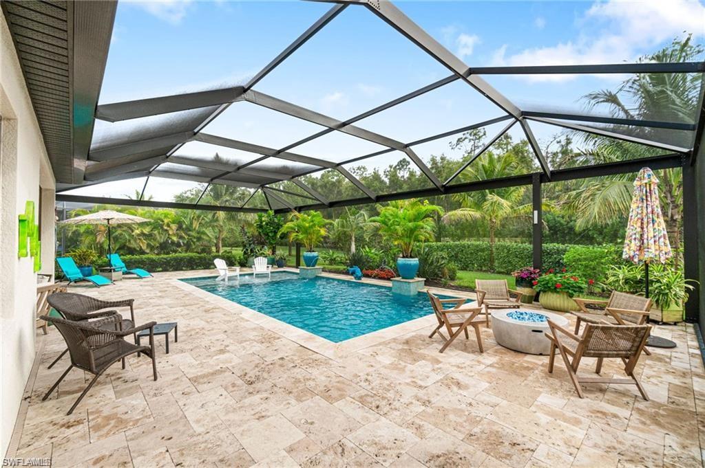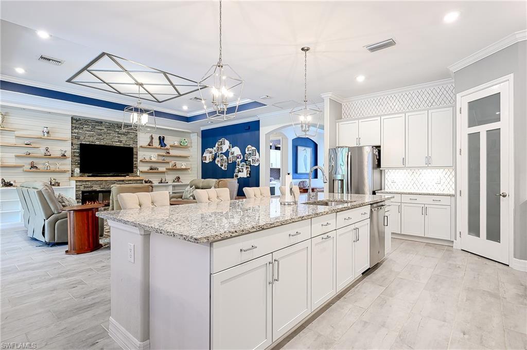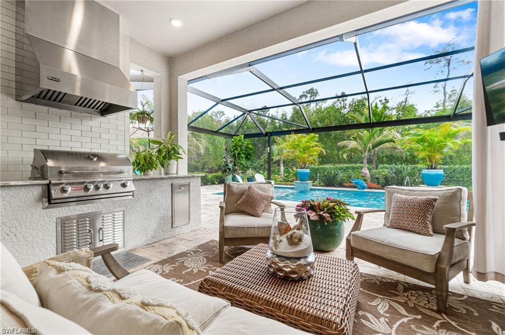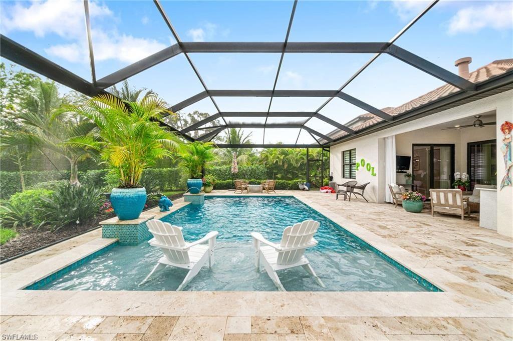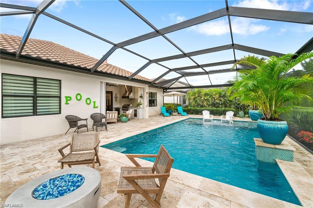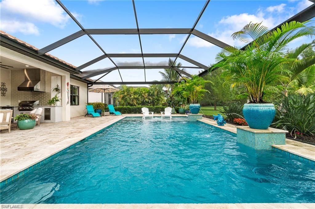 This upgraded Summerville model, part of the Manor Home Collection, offers spacious and stylish living with thoughtful design throughout. With 3 bedrooms, 3 full bathrooms, a den, and a 3-car garage, this home was built for comfort, functionality, and entertaining. Step through double glass doors into a wide foyer with a custom accent wall. The open-concept great room impresses with expansive views and a seamless connection between the living, dining, and kitchen areas. The chef’s kitchen features an 11-foot island, custom walk-in pantry, and a full-height backsplash that extends over the cabinets to the ceiling for a dramatic finish. Each bedroom has been tastefully styled with custom wall or ceiling accents. The master suite is a serene retreat with two walk-in closets, a chandelier, and a statement accent wall. The master bath includes dual vanities, a soaking tub with custom wall art above, and an oversized walk-in shower. The guest suite offers privacy and comfort with its own en-suite bathroom, ideal for visitors or extended stays. The den is enclosed with 8-foot French doors and plantation shutters, creating a quiet and flexible space for work or relaxation. Outdoors, the covered lanai delivers the full Florida lifestyle with a complete outdoor kitchen, built-in grill and exhaust hood, refrigerator, marble countertops, and a wall-mounted TV. The custom saltwater pool, installed in 2021, is 15 by 32 feet and features a sun shelf with loungers, a bubbler, water features, and two built-in stanchions with matching planters. The oversized panoramic cage is finished with travertine tile and landscape lighting, offering the perfect setting for day or night entertaining. Additional features include hurricane impact windows and doors throughout and three large overhead storage racks in the garage that eliminate the need for off-site storage. LaMorada is a gated, natural gas community in North Naples that combines the amenities of a large resort-style neighborhood with a more intimate residential feel. Residents enjoy pickleball, tennis, bocce, a fitness center, resort-style pool and bar, theater, culinary arts studio, and a library.
