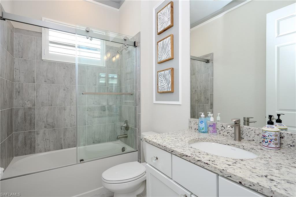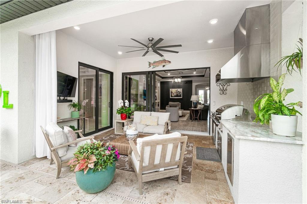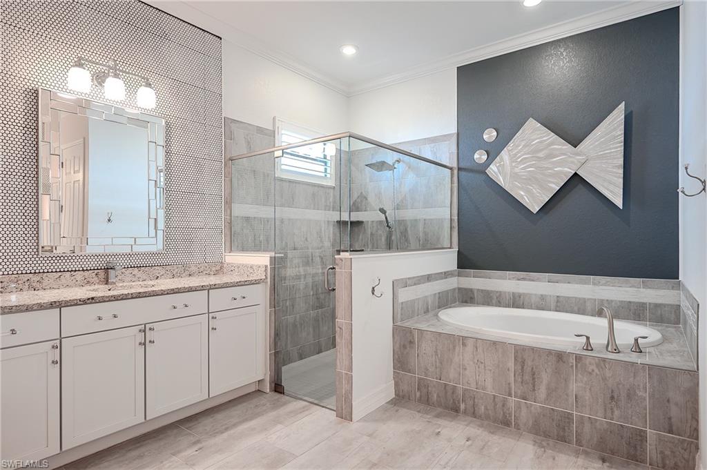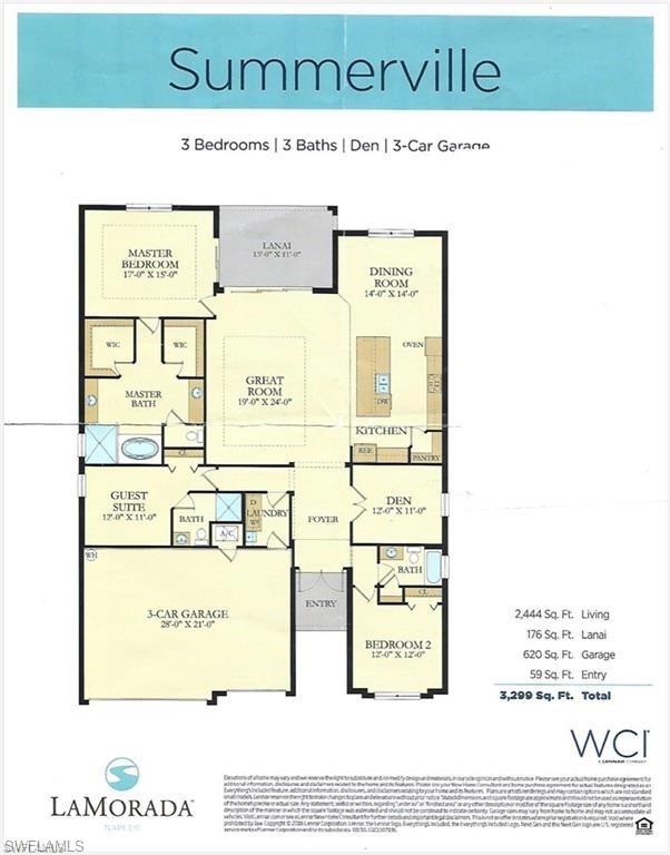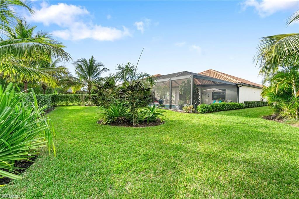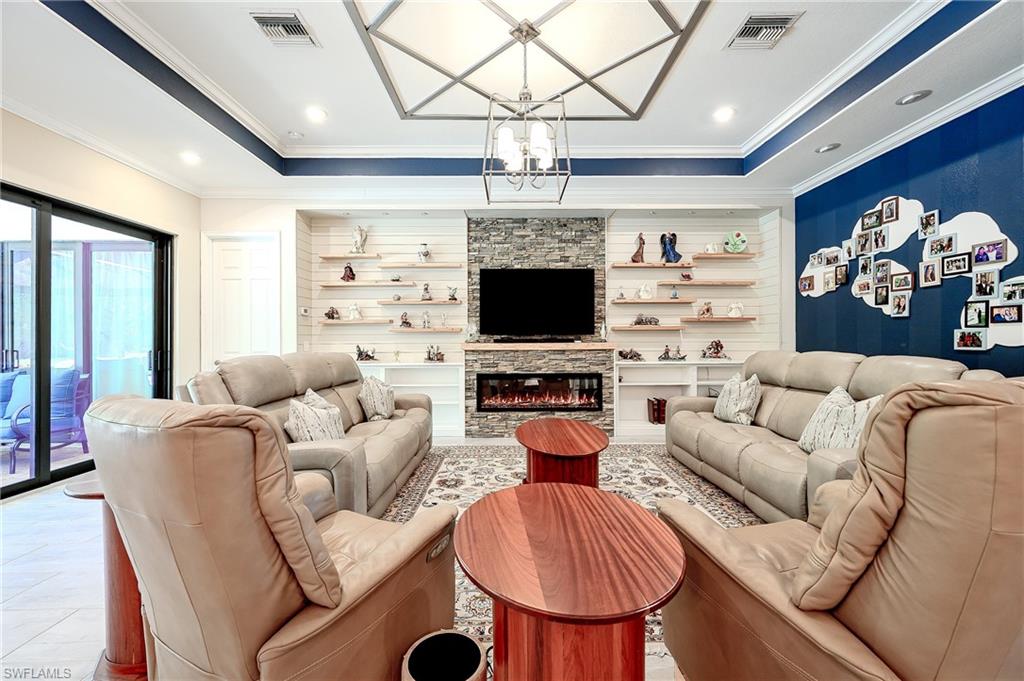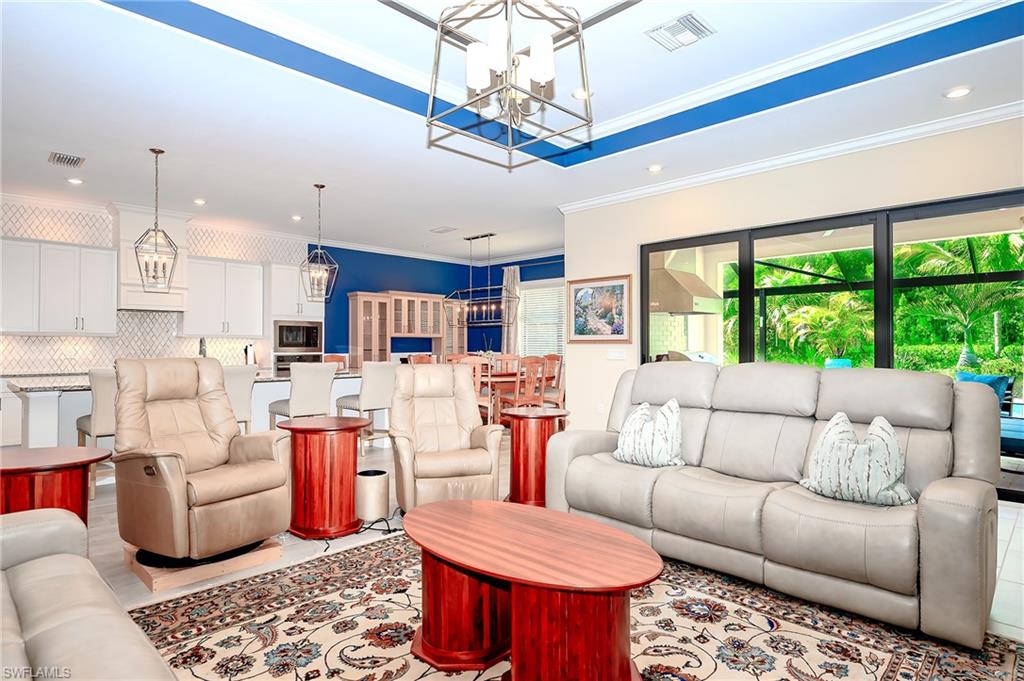 This upgraded Summerville model, part of the Manor Home Collection, offers spacious and stylish living with thoughtful design throughout. With 3 bedrooms, 3 full bathrooms, a den, and a 3-car garage, this home was built for comfort, functionality, and entertaining. Step through double glass doors into a wide foyer with a custom accent wall. The open-concept great room impresses with expansive views and a seamless connection between the living, dining, and kitchen areas. The chef’s kitchen features an 11-foot island, custom walk-in pantry, and a full-height backsplash that extends over the cabinets to the ceiling for a dramatic finish. Each bedroom has been tastefully styled with custom wall or ceiling accents. The master suite is a serene retreat with two walk-in closets, a chandelier, and a statement accent wall. The master bath includes dual vanities, a soaking tub with custom wall art above, and an oversized walk-in shower. The guest suite offers privacy and comfort with its own en-suite bathroom, ideal for visitors or extended stays. The den is enclosed with 8-foot French doors and plantation shutters, creating a quiet and flexible space for work or relaxation. Outdoors, the covered lanai delivers the full Florida lifestyle with a complete outdoor kitchen, built-in grill and exhaust hood, refrigerator, marble countertops, and a wall-mounted TV. The custom saltwater pool, installed in 2021, is 15 by 32 feet and features a sun shelf with loungers, a bubbler, water features, and two built-in stanchions with matching planters. The oversized panoramic cage is finished with travertine tile and landscape lighting, offering the perfect setting for day or night entertaining. Additional features include hurricane impact windows and doors throughout and three large overhead storage racks in the garage that eliminate the need for off-site storage. LaMorada is a gated, natural gas community in North Naples that combines the amenities of a large resort-style neighborhood with a more intimate residential feel. Residents enjoy pickleball, tennis, bocce, a fitness center, resort-style pool and bar, theater, culinary arts studio, and a library.