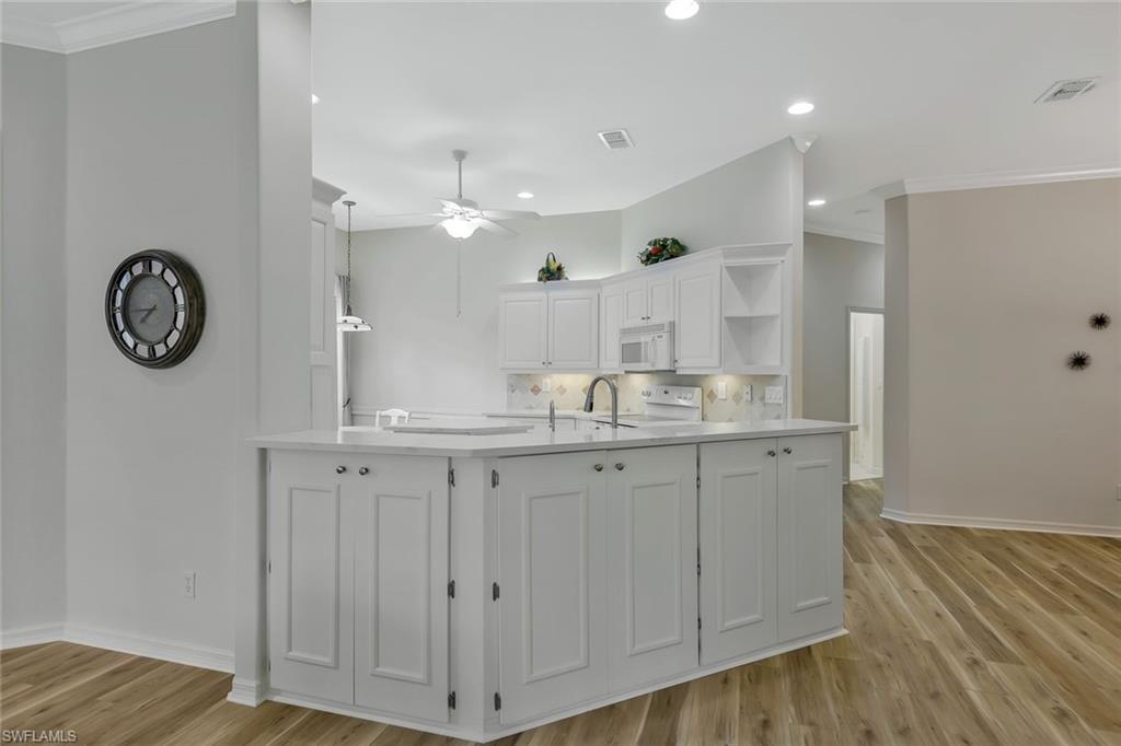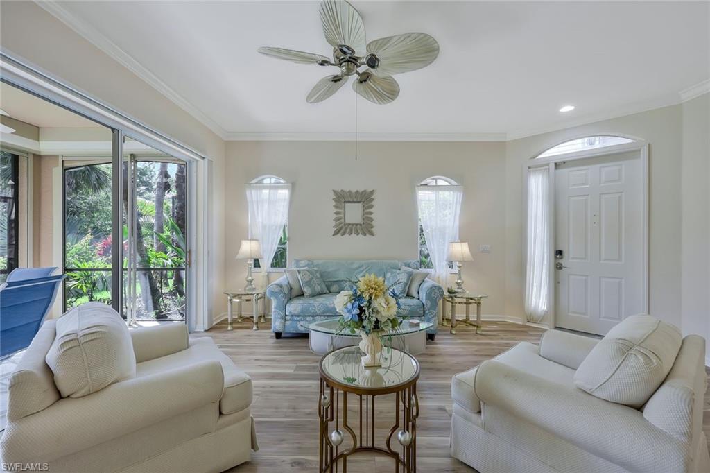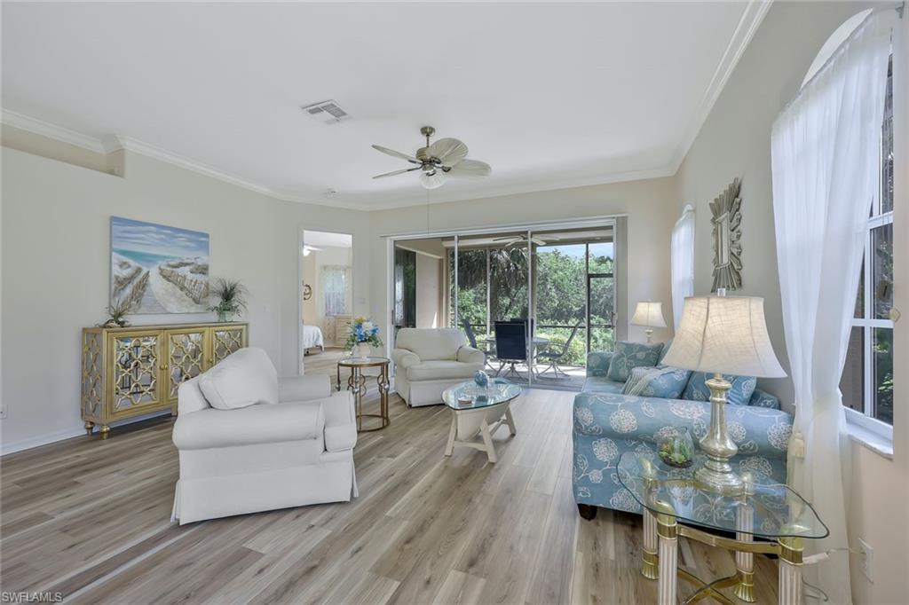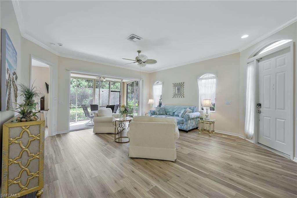 MOVE-IN READY PARADISE! Stunning Villa with SOCIAL MEMBERSHIP in premier country club community. INCREDIBLE VALUE ALERT! This gorgeous 2-bedroom + den (perfect for 3rd bedroom!) attached villa at prestigious Hunters Ridge Golf & Country Club is your gateway to resort-style living at an unbeatable price! NICELY UPDATED, FURNISHED & MOVE-IN READY: Brand new luxury vinyl plank flooring throughout - Stunning brand new quartz kitchen countertops - Brand new 3-ton AC system (September 2025) - 1,700 sq ft of comfortable living space - 2-car garage for convenience. PRIVATE SANCTUARY: Unwind on your screened lanai overlooking serene preserve views – your own slice of tranquility! Soaring volume ceilings create an airy, spacious feel while storm shutters provide peace of mind. RESORT LIFESTYLE INCLUDED: Your Social Membership unlocks endless amenities: sparkling community pool with bar service, clubhouse dining, tennis courts, activity center, and so much more! PRIME LOCATION ADVANTAGES: Just 6 miles to pristine Bonita Beach - Minutes from RSW International Airport - Excellent shopping and dining nearby - Exciting Bonita Midtown development coming soon with 315 shops/restaurants, hotel, and residences just 5 minutes away! SMART INVESTMENT: Financially stable community with low fees and NO CDD assessments means more money in your pocket! This is your chance to own a piece of paradise at the BEST VALUE in Hunters Ridge. Don't let s gem slip away!