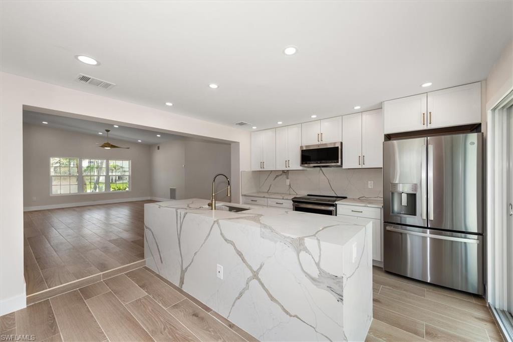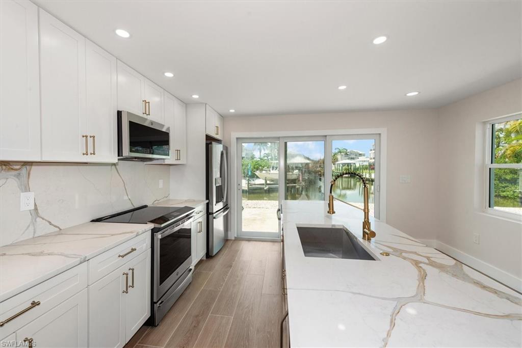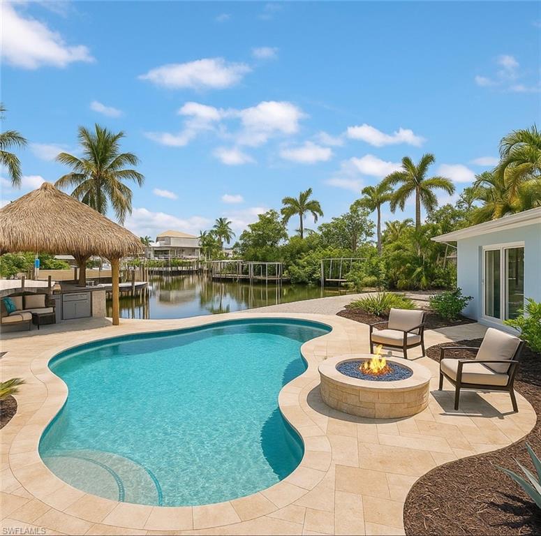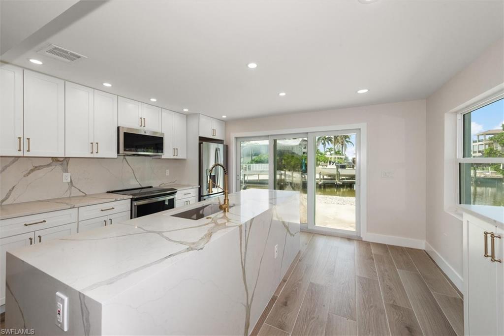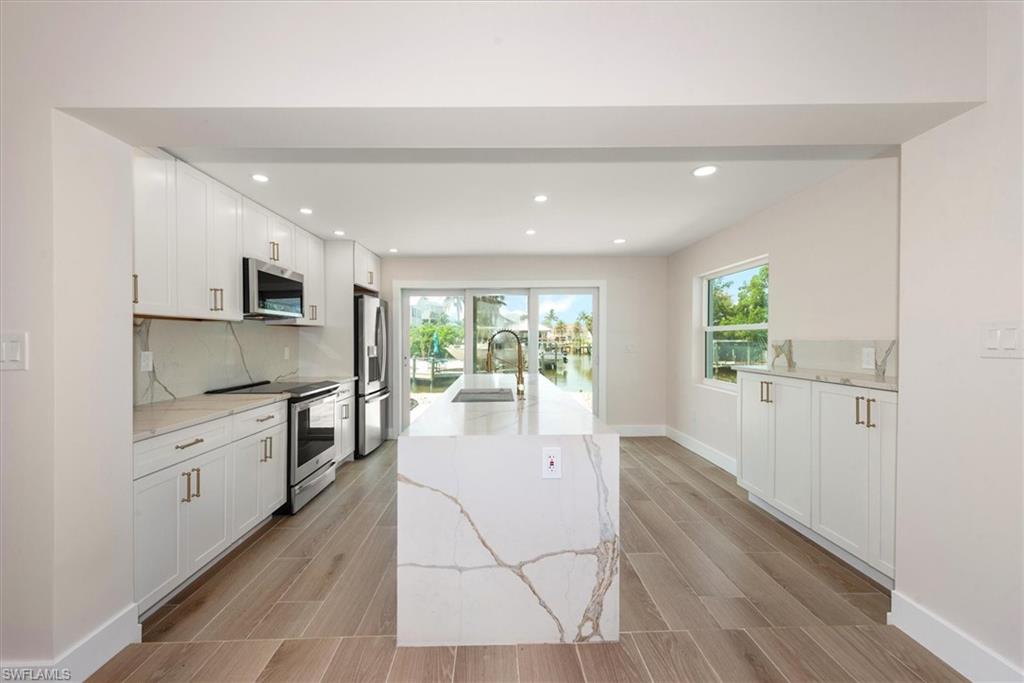 Meticulously remodeled 3/3/1 direct Gulf access home only steps from the white sands of the Gulf. When you step into this home you will immediately notice the attention to detail and upgraded finishings throughout. The interior of this residence features an open floor plan, plank porcelain tile throughout, upgraded lighting and the desired split floor plan. With two en-suite bedrooms your guests or family can enjoy the privacy and comfort of their own custom tiled walk-in shower. The kitchen boasts a huge Island fit for a Chef, bright white soft close shaker cabinetry and stunning waterfall quartz counters. The oversized rear yard has amazing long water views down the canal and has plenty of room for a pool, Tiki hut and so much more! Sample renderings are in the photos.. Customize your dock where you have quick boating access to the Gulf and all that SW Florida has to offer. This amazing S End home is only minutes to the airport, Ft Myers, Bonita Springs and Naples where you can enjoy 5-star shopping and dining. All work was fully permitted and nearly everything is brand new, including plumbing, electrical, all interior finishings, the roof and so much more, which helps to keep insurance rates affordable. No water intrusion during Milton or Helene and flood insurance is in place. Seller motivated!