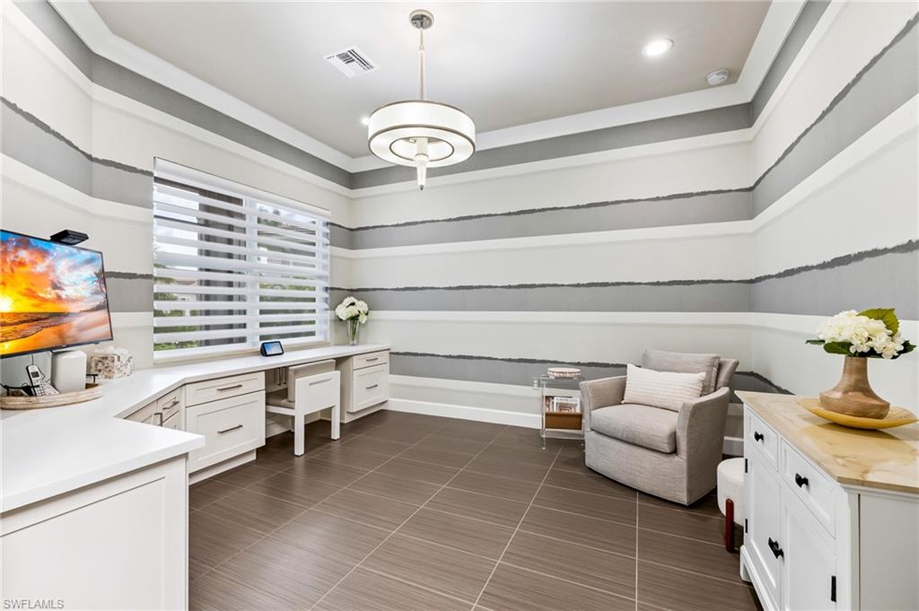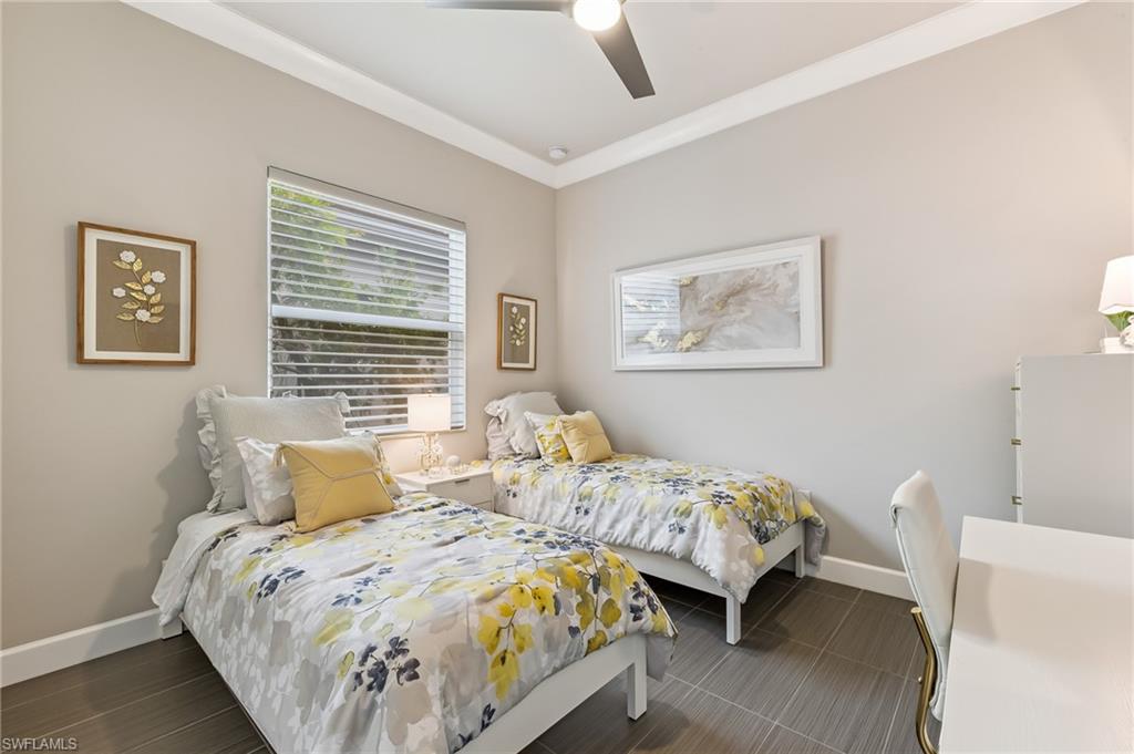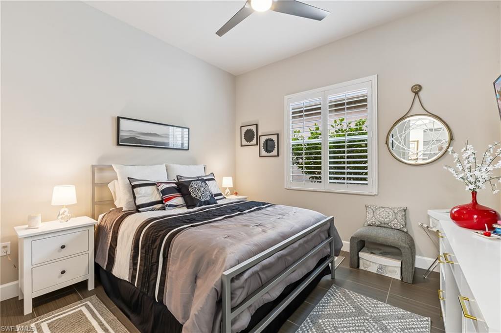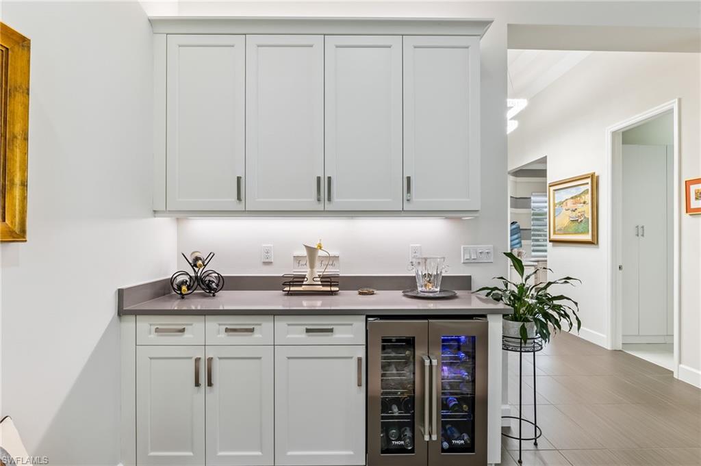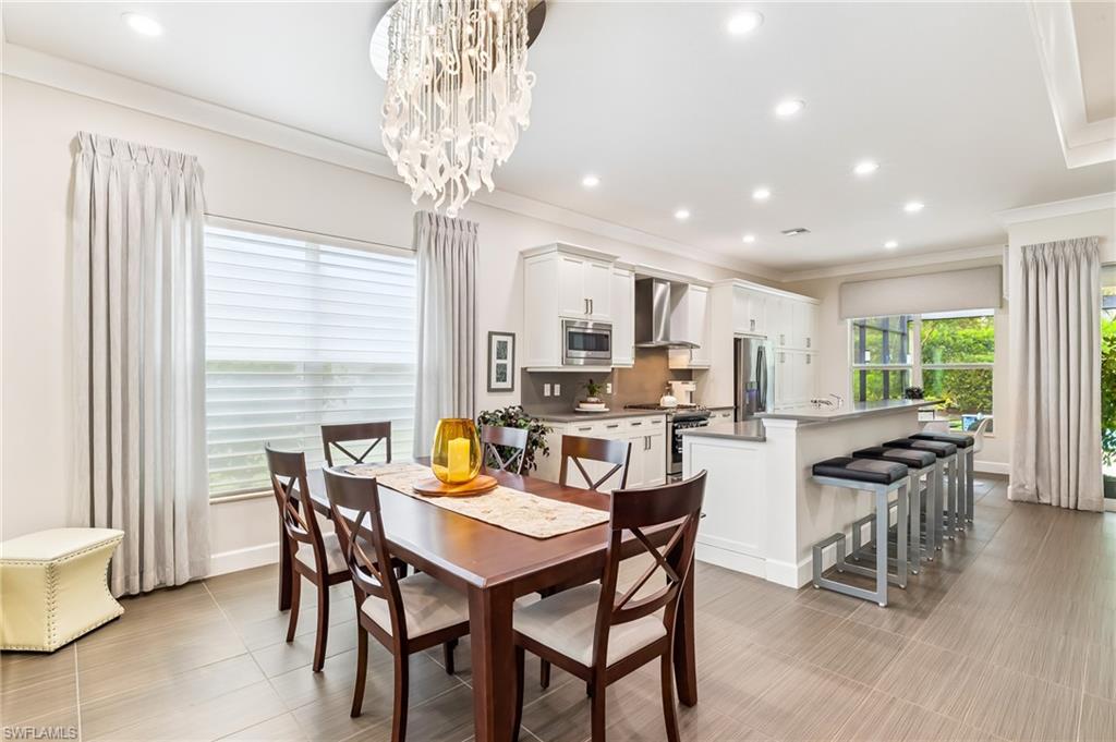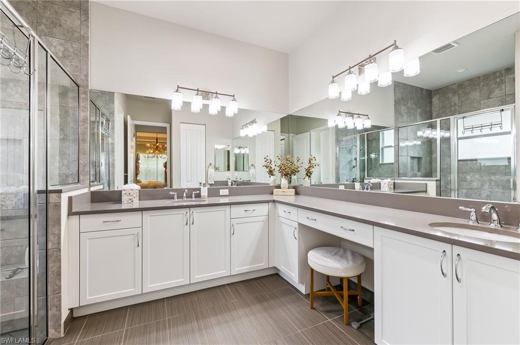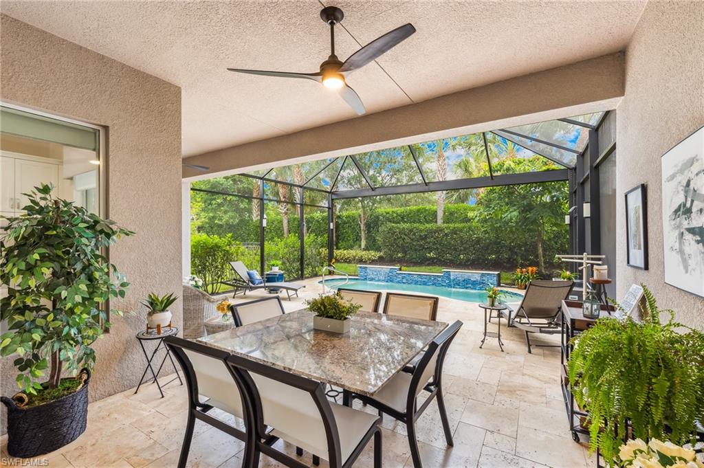 Is the active adult lifestyle calling you? This well-appointed move-in ready “Cabernet” floorplan is positioned on a lushly landscaped PRIVATE lot with no homes behind, and priced to sell. Built with storm protection in mind, the home includes hurricane-impact windows and doors as well as Storm Smart hurricane-rated motorized shades and a WHOLE-HOUSE NATURAL GAS GENERATOR (providing uninterrupted power and peace of mind). Throughout the home you will see embellishments of designer LED lighting, premium fixtures and ceiling fans, crown molding, and custom motorized window treatments, tankless hot water heater, whole-house water treatment system, and landscape lighting. The great room features a custom bar with cabinetry and a wine refrigerator, perfect for hosting guests. Offering nearly 2,200 square feet of refined living space, this residence features gorgeous porcelain tile flooring throughout (no carpet anywhere) creating a sleek, clean, and low-maintenance environment that enhances both style and comfort. The thoughtfully designed layout includes 3 spacious bedrooms, 2 full bathrooms, plus a gourmet kitchen with a breakfast bar and casual dining area, a light-filled great room, formal dining room, a versatile den or office, and a large laundry room. Storage is abundant, with custom closets, an oversized walk-in storage room complete with built-ins, and a 2.5 CAR AIR-CONDITIONED GARAGE to accommodate a golf cart or more storage. Enjoy both front and rear screened lanais for maximum outdoor living space. The kitchen is beautifully appointed with upgraded appliances, soft-close cabinetry, pull-out shelves, quartz countertops, boasting a perfect open layout ideal for entertaining. The expanded rear lanai is a private oasis, complete with panoramic no-see-um screening, travertine pavers, and a heated saltwater pool with spa jets at both ends and dual waterfalls, and pre-plumbed natural gas line for outdoor kitchen. Valencia Bonita’s resort-style amenities are unparalleled, featuring a spectacular 40,000-square-foot Clubhouse and Sports Center. Residents enjoy an indoor-outdoor restaurant and bar, a vibrant social hall for concerts and themed events, a luxurious spa, multiple pools including resort, lap, and resistance pools, private cabanas, a fully equipped and staffed fitness center, billiards lounge, card rooms, pottery and crafts studio, a professional cooking studio, and courts for tennis, pickleball, and bocce. With dog parks, a pro shop, dozens of fitness classes, a full calendar of resident clubs, and a full-time lifestyle director, this community offers a vibrant lifestyle that rivals the finest resorts. Ideally located just minutes from the white-sand beaches of Southwest Florida, RSW International Airport, and the cultural, dining, and shopping destinations of Bonita Springs, Naples, and Fort Myers.