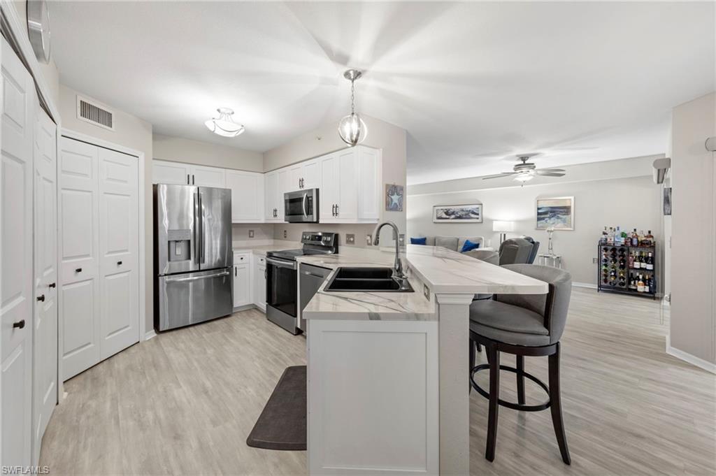 This beautifully maintained ground-floor Condo in the highly desirable, West of 41, lush, Bay Forest community offers the perfect blend of comfort, convenience, and peace of mind—ideal for buyers seeking a relaxing Naples lifestyle. NO FLOODING during Hurricanes Ian, Helene, and Milton; 2-bedroom, 2-bath home featuring calming ocean-orientated themes, upgraded kitchen and laminate flooring, a spacious layout, walk-in closet, private garage, and a screened lanai. Enjoy ground- floor living—no elevators or stairs—making it perfect for pet owners, snowbirds, or year-round residents looking for ease and accessibility. Recent updates include a new building roof and completion of the community’s new $4 million, 2,500-foot BOARDWALK, which winds through mangroves straight to the Gulf, ideal for sunset walks, wildlife watching, and kayaking from the launching raft at the end by the tiki-hut, a favorite gathering spot for sunset cocktails! In addition to the Boardwalk, Bay Forest Residents enjoy over two miles of walking paths, 3 Tennis and 3 pickleball courts, bocce, shuffleboard, exercise room and much more, catering to active lifestyles, while the clubhouse, which also has a library, serves as the hub for social events and indoor activities. 30 minutes to Southwest Florida International Airport (Ft Myers), while Delnor Wiggins and Barefoot Beaches are just minutes away