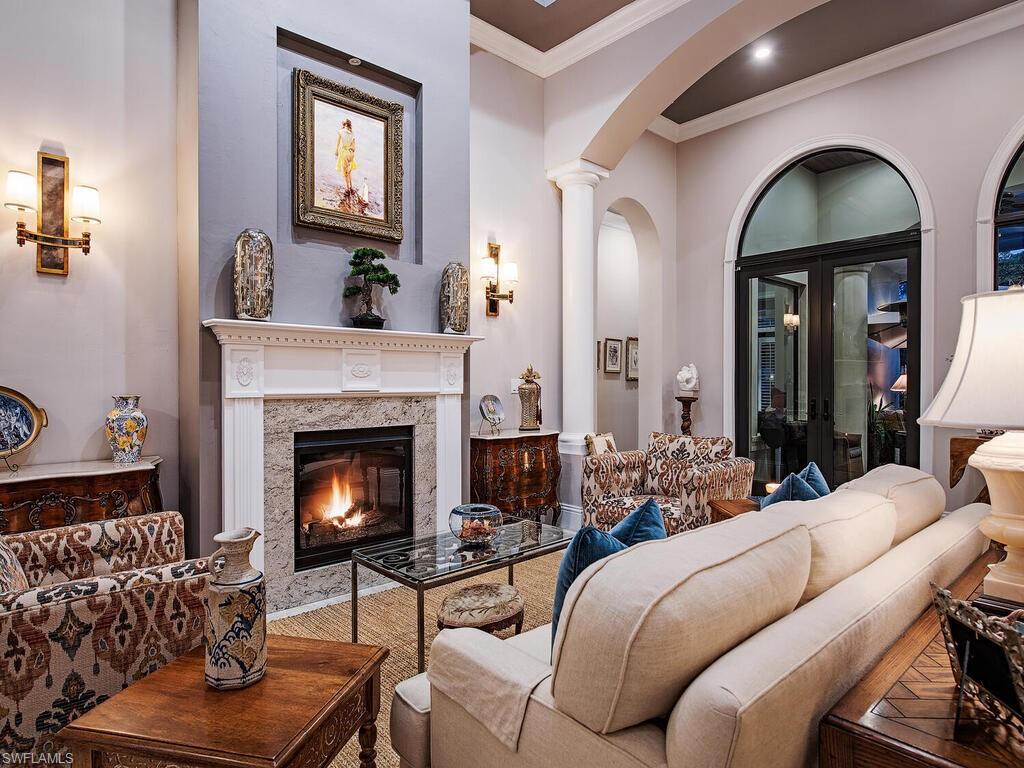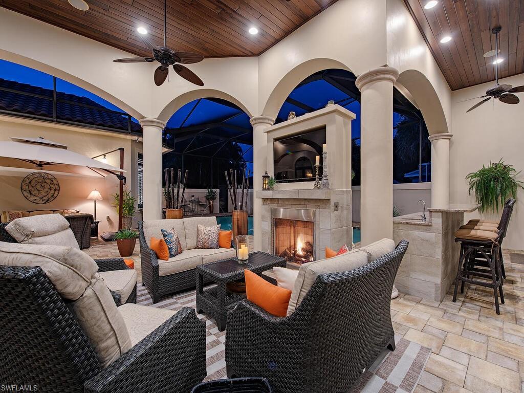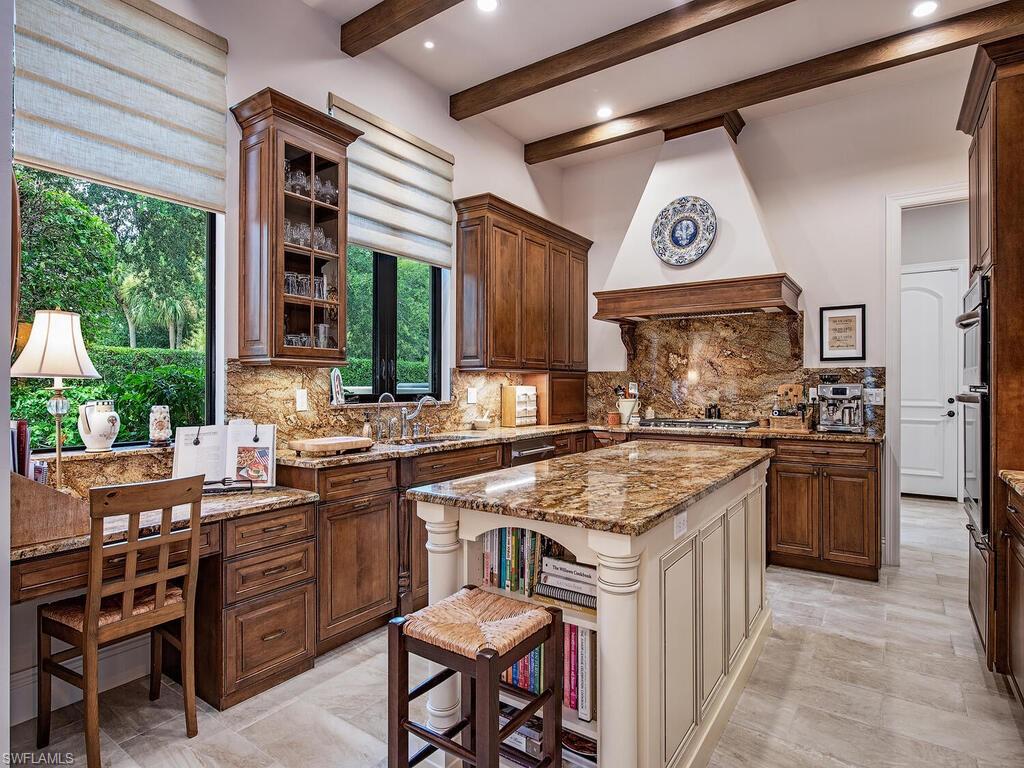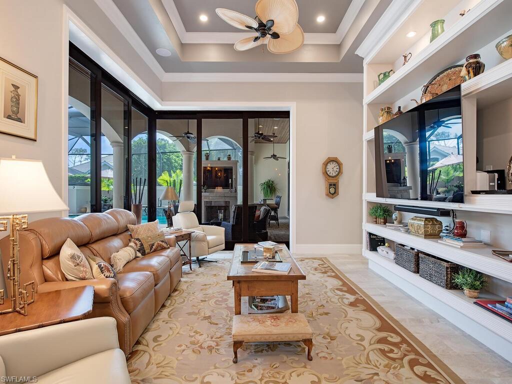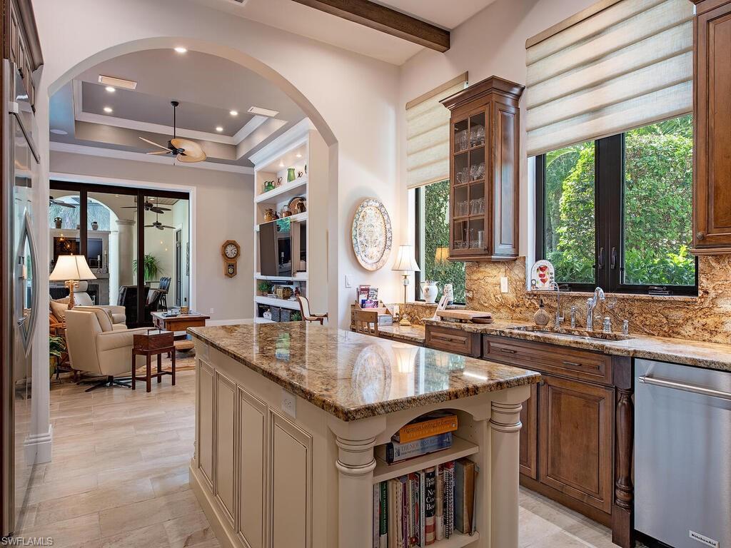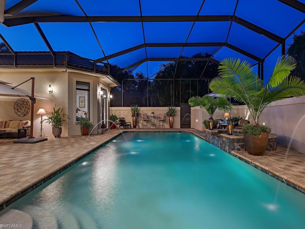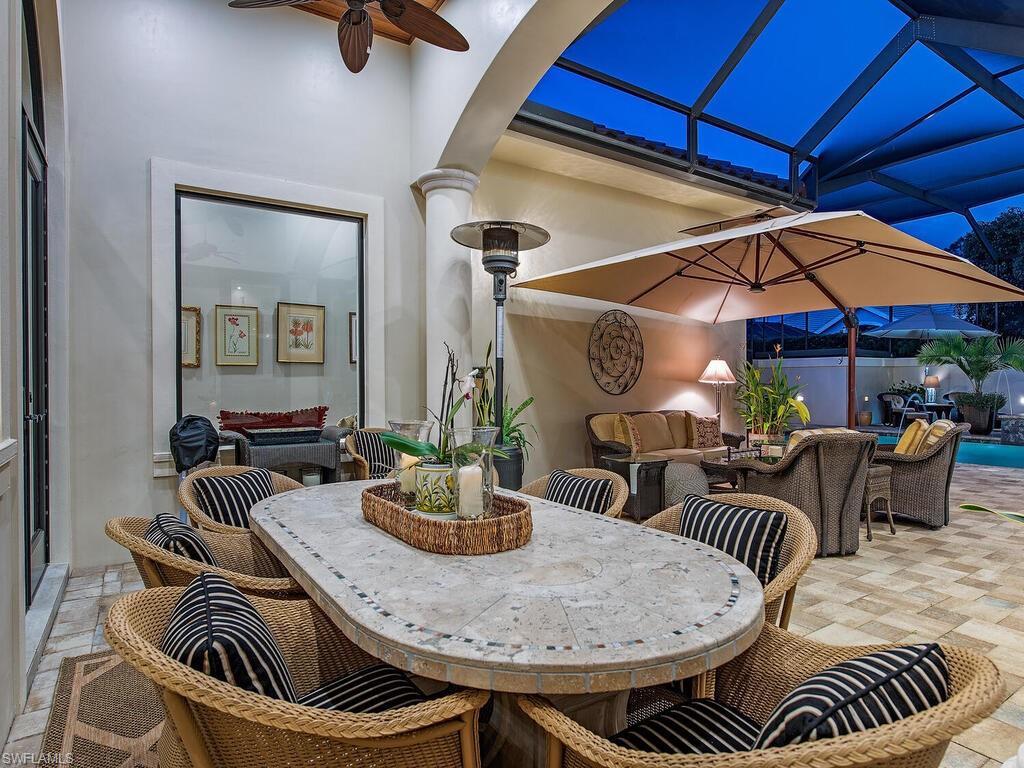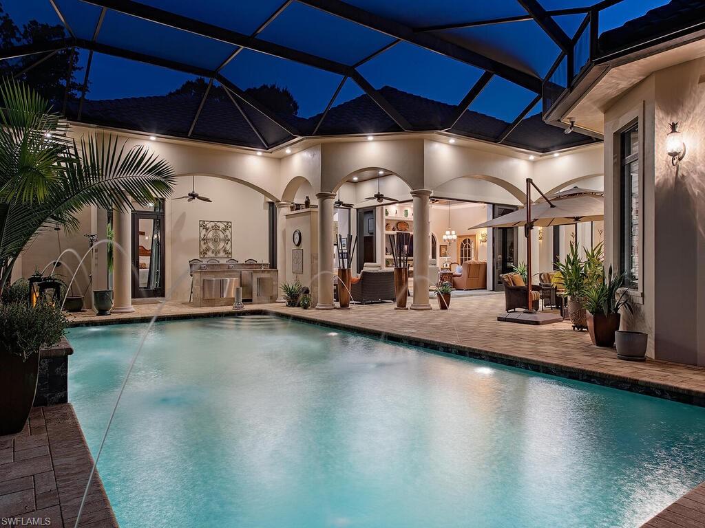 Elegant and meticulously maintained, this custom estate home is located on a quiet cul-de-sac in the highly sought-after gated community of Hawksridge. Built in 2013 and situated on a 0.35-acre lot, the spacious single-story residence offers over 4,150 square feet of living area with a thoughtful split-bedroom layout and refined architectural details throughout. The open-concept interior includes a large great room with volume ceilings, formal dining, and a study with handsome built-ins, perfect for remote work or library. The gourmet kitchen is designed for both functionality and entertaining, featuring a center island, walk-in pantry, wine cooler, stainless steel appliances, 5-burner gas cooktop, and an abundance of cabinet space. One of the home's standout features is the attached private guest suite that encompasses a full kitchen including an indoor infrared grill, living area, full bathroom, and washer/dryer—ideal for in-laws, guests, or live-in aide. Seamless indoor / outdoor entertaining, with expansive screened lanai that offers an exceptional screened-covered outdoor living space, complete with a saltwater pool and spa, outdoor kitchen and wet bar, gas fireplace with TV area, covered dining space, outdoor shower, and lush tropical landscaping for privacy. Additional upgrades include four separate HVAC zones for optimal climate control, impact-resistant windows and doors, a half-house generator for peace of mind, and a spacious two-and-half-car garage with a circular paver driveway. Hawksridge is a low-density community known for its central Naples location, mature landscaping, tennis courts, clubhouse, and proximity to downtown, beaches, shopping, dining, and top-rated schools. This home is ideal for buyers seeking a move-in ready property that combines quality construction, smart layout, and luxurious indoor-outdoor living.