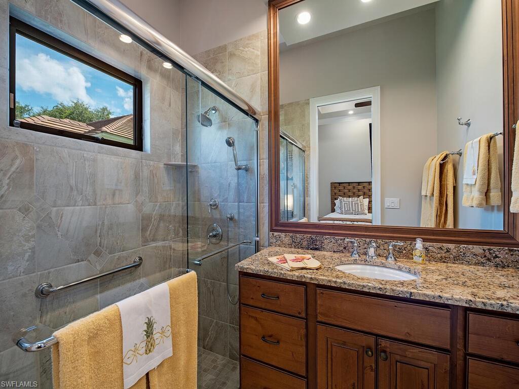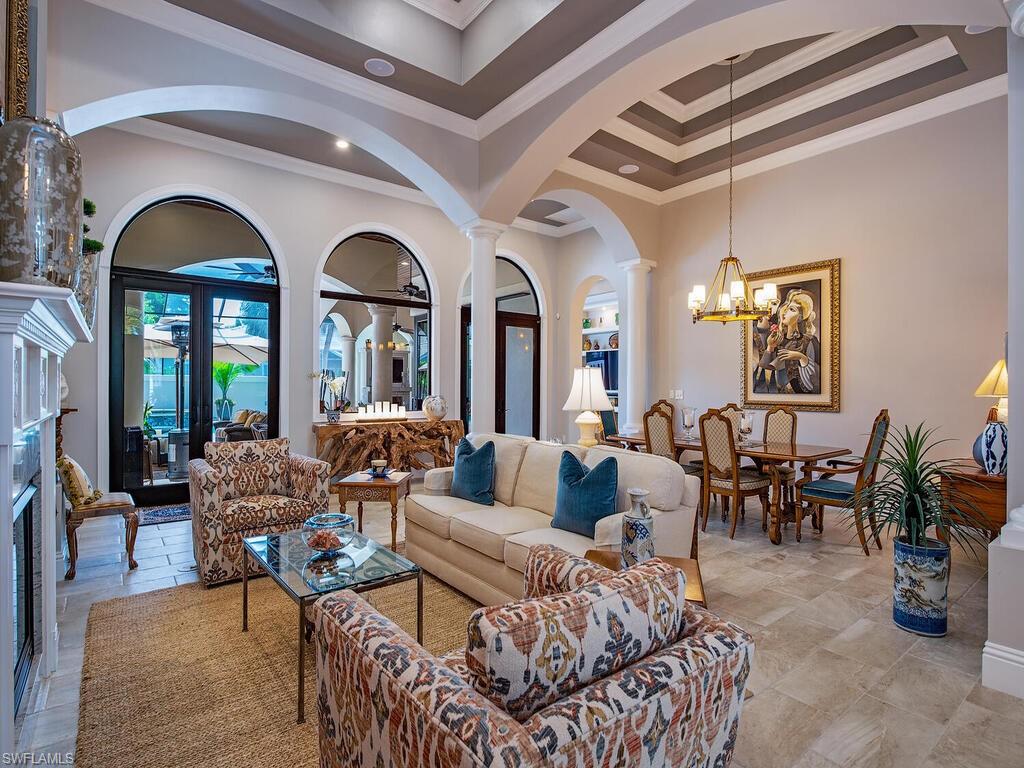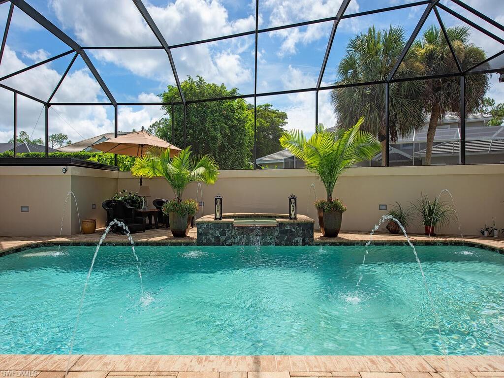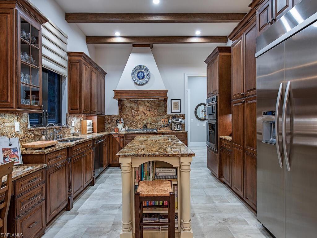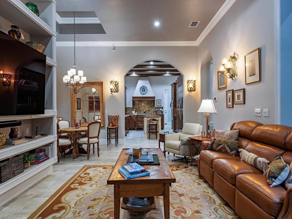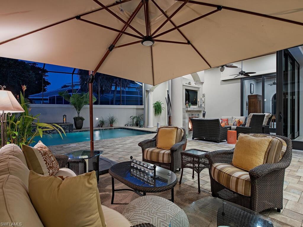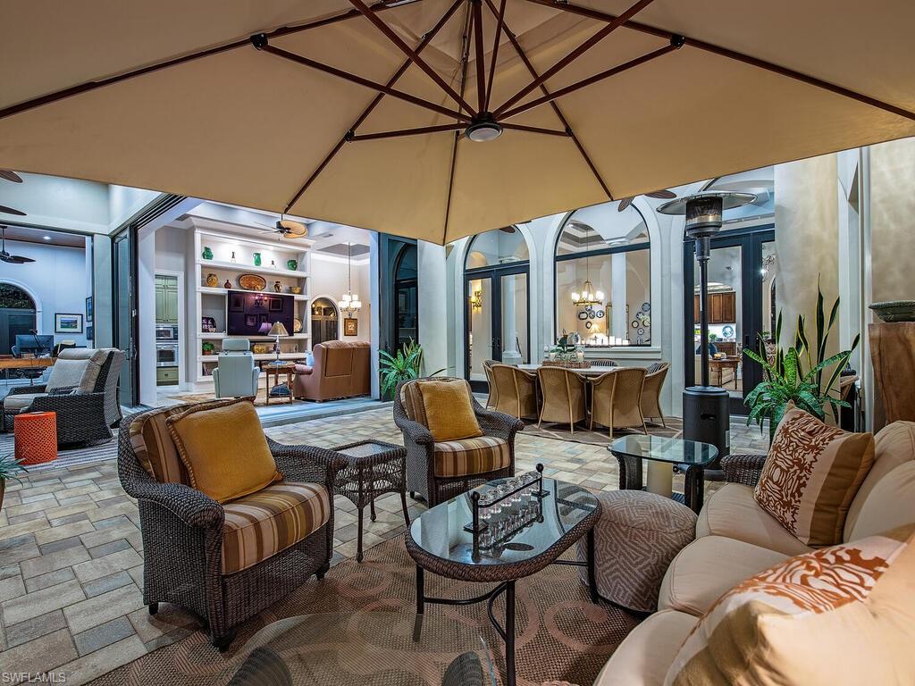Elegant and meticulously maintained, this custom estate home is located on a quiet cul-de-sac in the highly sought-after gated community of Hawksridge. Built in 2013 and situated on a 0.35-acre lot, the spacious single-story residence offers over 4,150 square feet of living area with a thoughtful split-bedroom layout and refined architectural details throughout. The open-concept interior includes a large great room with volume ceilings, formal dining, and a study with handsome built-ins, perfect for remote work or library. The gourmet kitchen is designed for both functionality and entertaining, featuring a center island, walk-in pantry, wine cooler, stainless steel appliances, 5-burner gas cooktop, and an abundance of cabinet space. One of the home's standout features is the attached private guest suite that encompasses a full kitchen including an indoor infrared grill, living area, full bathroom, and washer/dryer—ideal for in-laws, guests, or live-in aide. Seamless indoor / outdoor entertaining, with expansive screened lanai that offers an exceptional screened-covered outdoor living space, complete with a saltwater pool and spa, outdoor kitchen and wet bar, gas fireplace with TV area, covered dining space, outdoor shower, and lush tropical landscaping for privacy. Additional upgrades include four separate HVAC zones for optimal climate control, impact-resistant windows and doors, a half-house generator for peace of mind, and a spacious two-and-half-car garage with a circular paver driveway. Hawksridge is a low-density community known for its central Naples location, mature landscaping, tennis courts, clubhouse, and proximity to downtown, beaches, shopping, dining, and top-rated schools. This home is ideal for buyers seeking a move-in ready property that combines quality construction, smart layout, and luxurious indoor-outdoor living.