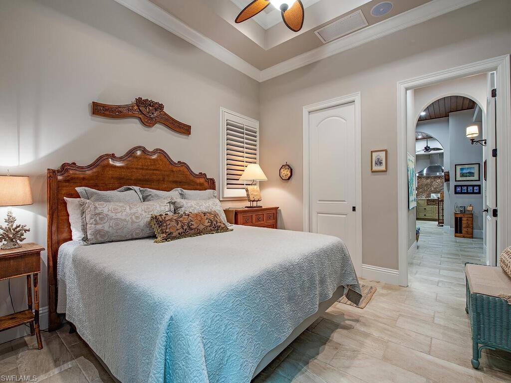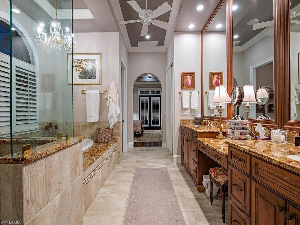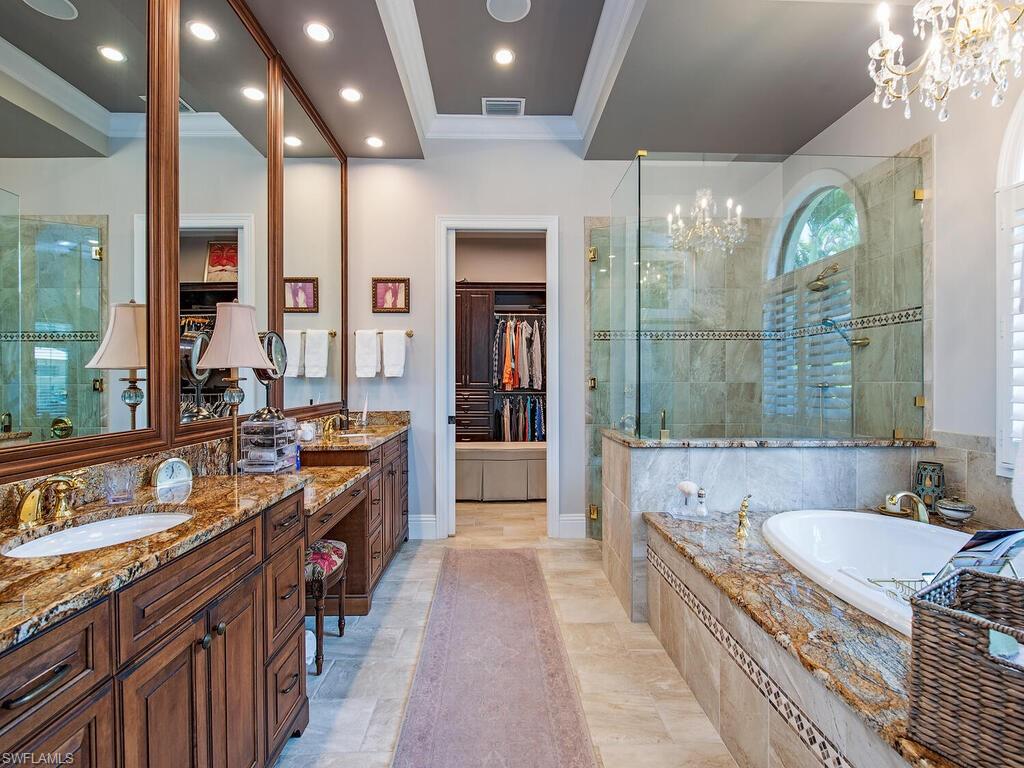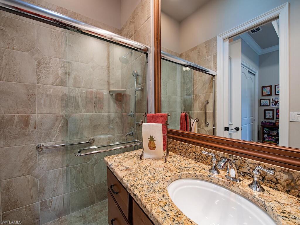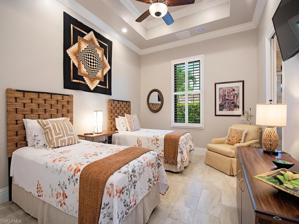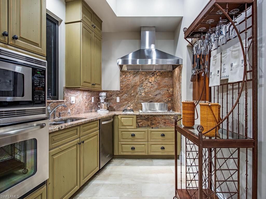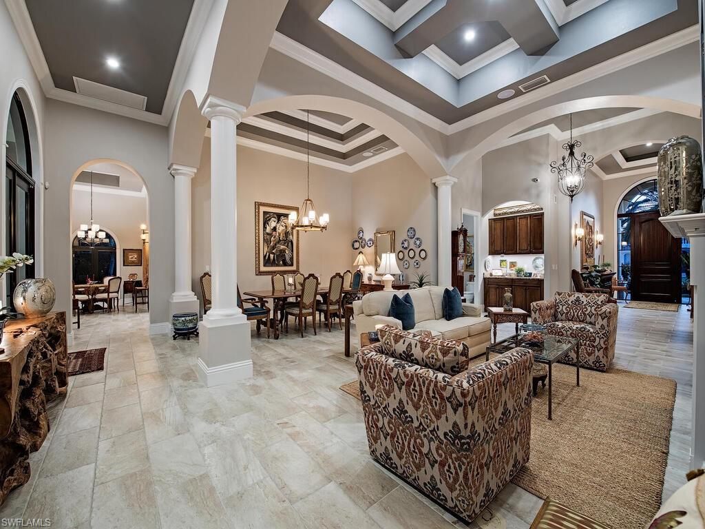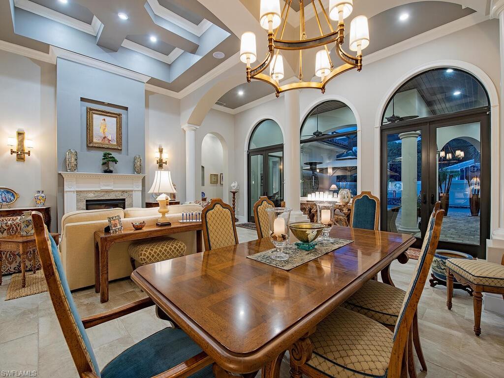 Elegant and meticulously maintained, this custom estate home is located on a quiet cul-de-sac in the highly sought-after gated community of Hawksridge. Built in 2013 and situated on a 0.35-acre lot, the spacious single-story residence offers over 4,150 square feet of living area with a thoughtful split-bedroom layout and refined architectural details throughout. The open-concept interior includes a large great room with volume ceilings, formal dining, and a study with handsome built-ins, perfect for remote work or library. The gourmet kitchen is designed for both functionality and entertaining, featuring a center island, walk-in pantry, wine cooler, stainless steel appliances, 5-burner gas cooktop, and an abundance of cabinet space. One of the home's standout features is the attached private guest suite that encompasses a full kitchen including an indoor infrared grill, living area, full bathroom, and washer/dryer—ideal for in-laws, guests, or live-in aide. Seamless indoor / outdoor entertaining, with expansive screened lanai that offers an exceptional screened-covered outdoor living space, complete with a saltwater pool and spa, outdoor kitchen and wet bar, gas fireplace with TV area, covered dining space, outdoor shower, and lush tropical landscaping for privacy. Additional upgrades include four separate HVAC zones for optimal climate control, impact-resistant windows and doors, a half-house generator for peace of mind, and a spacious two-and-half-car garage with a circular paver driveway. Hawksridge is a low-density community known for its central Naples location, mature landscaping, tennis courts, clubhouse, and proximity to downtown, beaches, shopping, dining, and top-rated schools. This home is ideal for buyers seeking a move-in ready property that combines quality construction, smart layout, and luxurious indoor-outdoor living.
