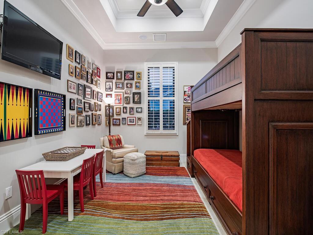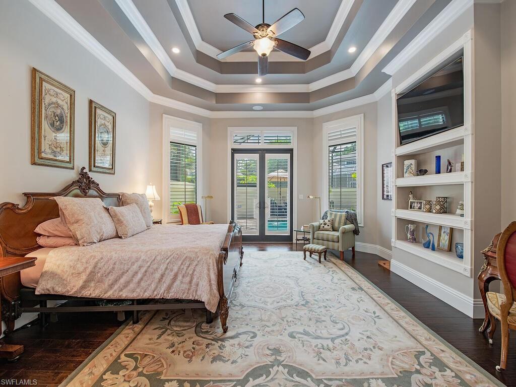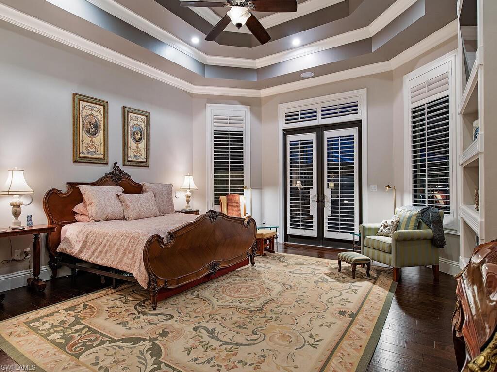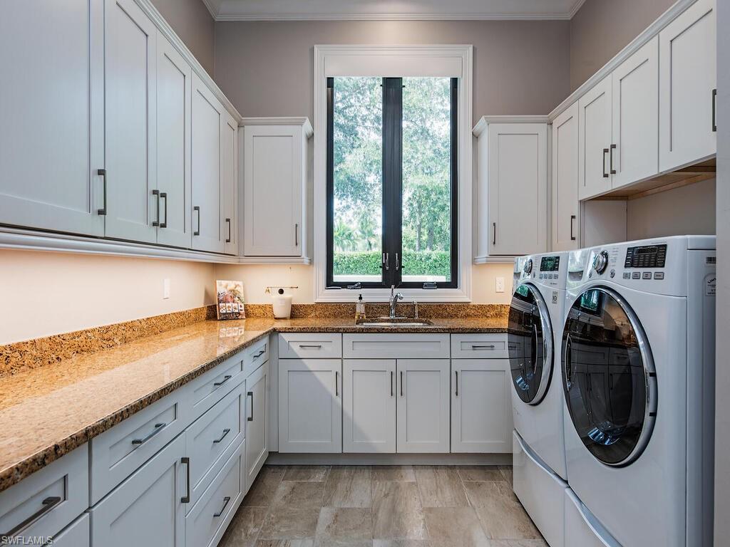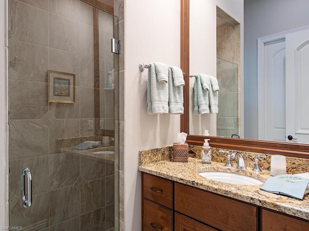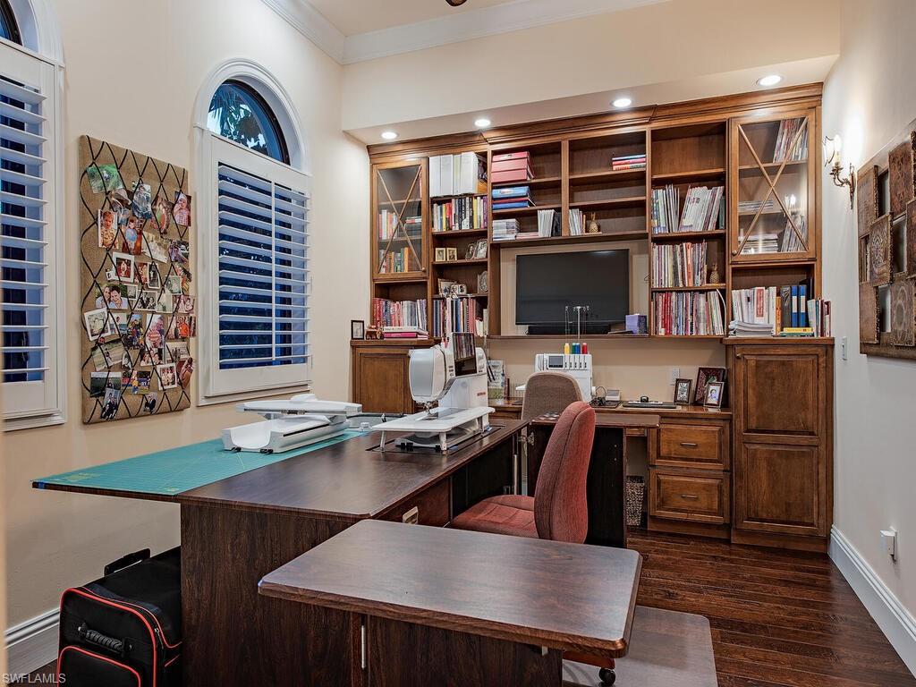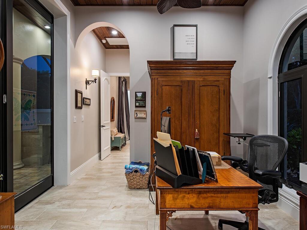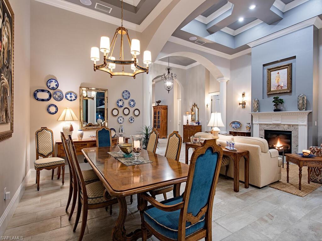 Elegant and meticulously maintained, this custom estate home is located on a quiet cul-de-sac in the highly sought-after gated community of Hawksridge. Built in 2013 and situated on a 0.35-acre lot, the spacious single-story residence offers over 4,150 square feet of living area with a thoughtful split-bedroom layout and refined architectural details throughout. The open-concept interior includes a large great room with volume ceilings, formal dining, and a study with handsome built-ins, perfect for remote work or library. The gourmet kitchen is designed for both functionality and entertaining, featuring a center island, walk-in pantry, wine cooler, stainless steel appliances, 5-burner gas cooktop, and an abundance of cabinet space. One of the home's standout features is the attached private guest suite that encompasses a full kitchen including an indoor infrared grill, living area, full bathroom, and washer/dryer—ideal for in-laws, guests, or live-in aide. Seamless indoor / outdoor entertaining, with expansive screened lanai that offers an exceptional screened-covered outdoor living space, complete with a saltwater pool and spa, outdoor kitchen and wet bar, gas fireplace with TV area, covered dining space, outdoor shower, and lush tropical landscaping for privacy. Additional upgrades include four separate HVAC zones for optimal climate control, impact-resistant windows and doors, a half-house generator for peace of mind, and a spacious two-and-half-car garage with a circular paver driveway. Hawksridge is a low-density community known for its central Naples location, mature landscaping, tennis courts, clubhouse, and proximity to downtown, beaches, shopping, dining, and top-rated schools. This home is ideal for buyers seeking a move-in ready property that combines quality construction, smart layout, and luxurious indoor-outdoor living.