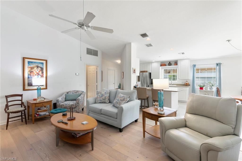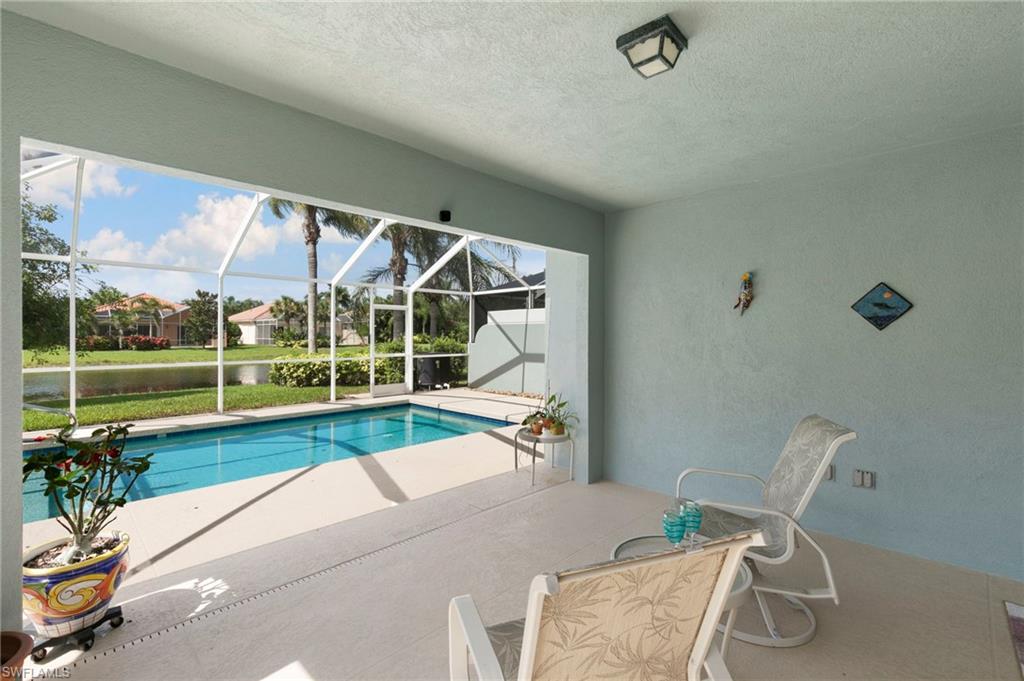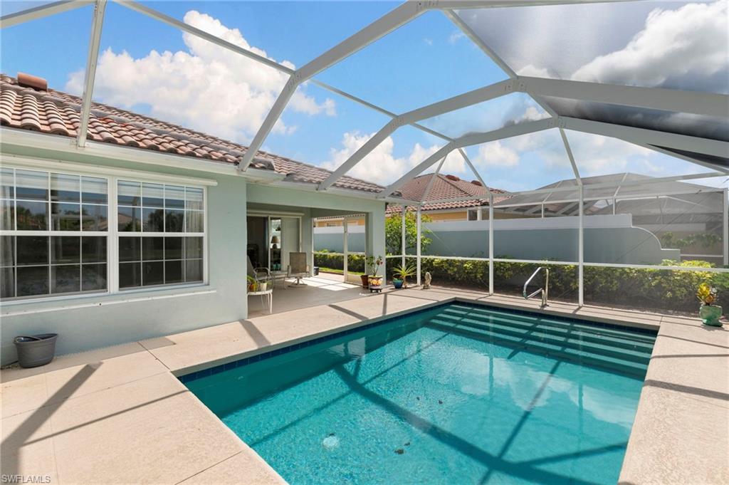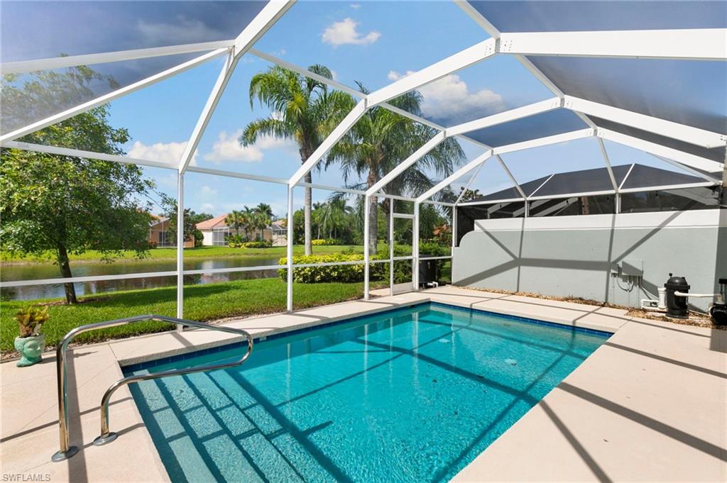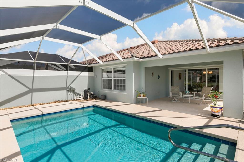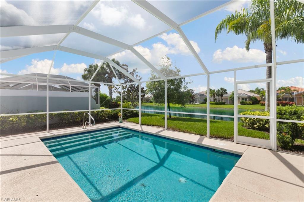 Move in ready pool home with perfect South exposure for all day sun and nice bright natural light in the home. This lovingly cared for Capri floor plan features 2 bedrooms and a den, open kitchen, spacious laundry room, 2 car garage and extended lanai. Enjoy the heated pool and outdoor living overlooking the lake with good covered area and sunning area.. This home has had many improvements and upgrades including newer luxury vinyl wood look flooring, hardwood floors living room, stainless appliances, and new screening on lanai, new faucets primary bath. The exterior of the home is freshly painted. Other great features include paver boarder path to pool area, excellent storage, walk in closets in both bedrooms, high ceilings, double vanity in primary suite and many options to set up living room/dining room and den space. Verona Walk is a wonderful resort style community with LOW FEES and fantastic amenities. Pool, fitness center, tennis, pickleball courts and over 20 miles of walking and bike trails. Pet friendly community. Other amenities that make it so you almost never need to leave the community include hair salon, post office, gas pumps, restaurant/café, ice cream and coffee shop. This home is in low risk flood zone X.