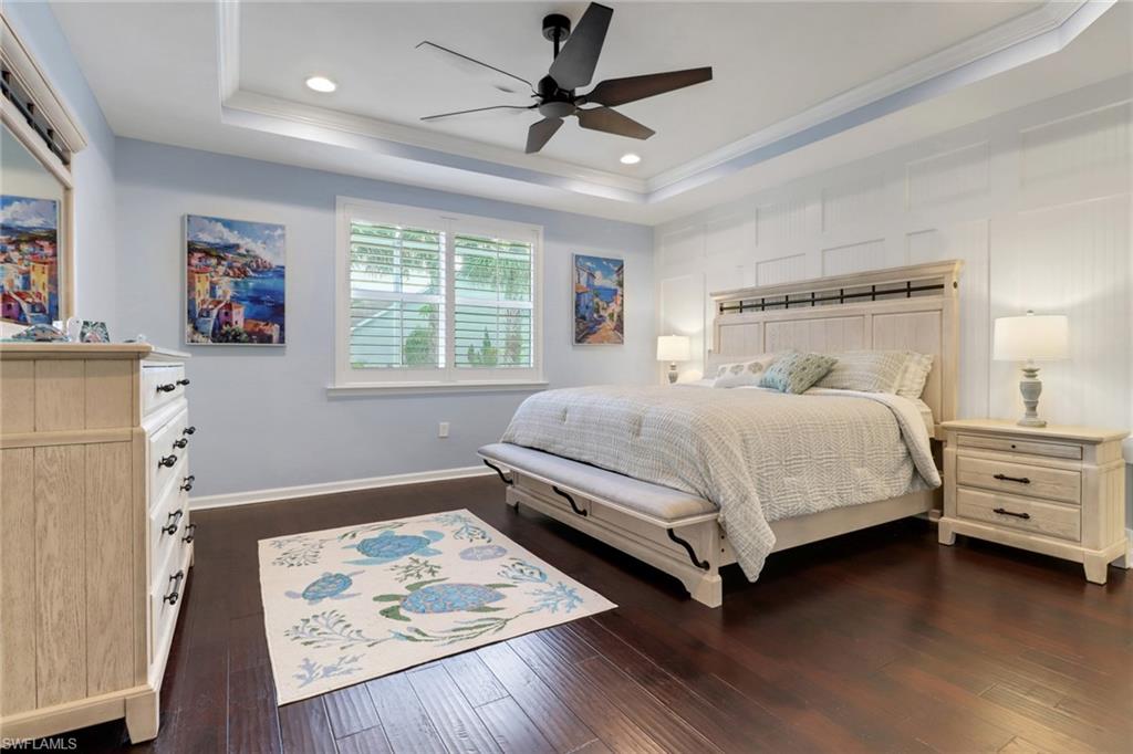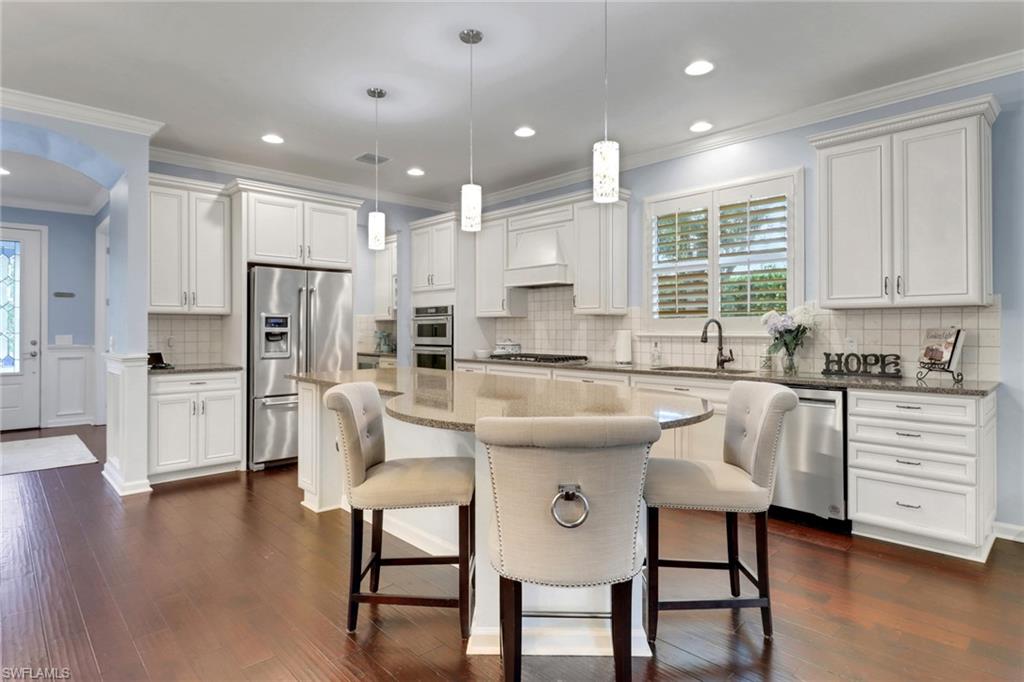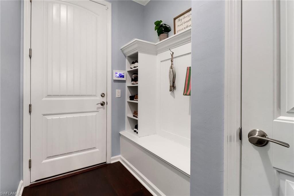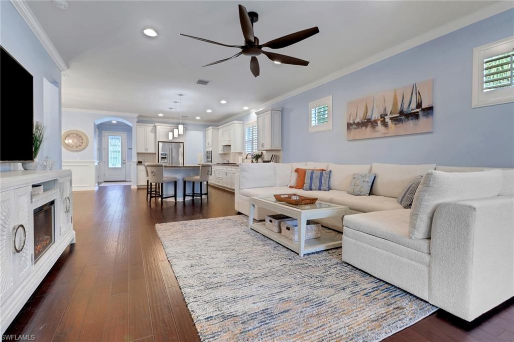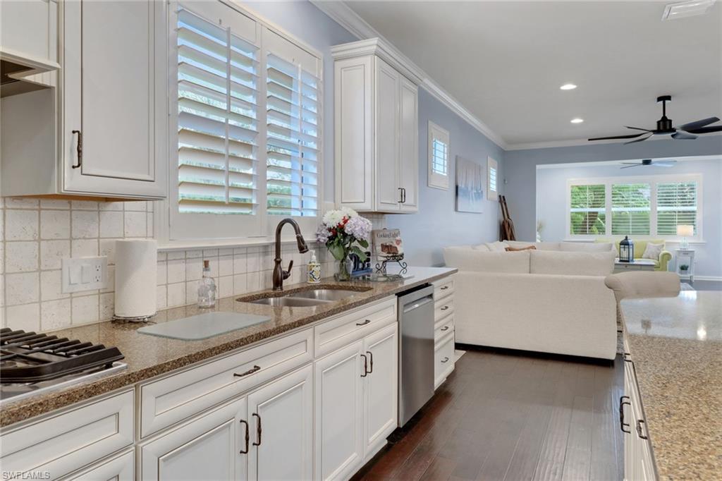 This stunning Martin Ray floor plan is a showcase of elegance, functionality, and premium upgrades. Recently professionally painted, the home features real wood floors, custom trim work, crown molding, and plantation shutters throughout. Brand new designer light fixtures and premium DC ceiling fans elevate each room’s style and efficiency. The chef’s kitchen impresses with a Level 5 KitchenAid appliance package, natural gas range, and a butler’s pantry complete with a wine fridge. The optional sunroom adds valuable extra living space, while the drop zone enhances everyday organization. Luxurious finishes continue with Cheyanne 8-foot doors, tile-to-ceiling showers, custom closets in every room, and hurricane impact glass windows for safety and peace of mind. The expansive laundry room includes a front-loading washer and gas dryer, utility sink, and ample cabinetry. The garage offers built-in storage with custom cabinetry and slatwall organization, while a tankless water heater provides endless hot water. Outdoors, enjoy a newly installed fenced dog run—perfect for pets and privacy. Located in Tidewater, a premier 55+ active adult community, residents enjoy a vibrant lifestyle with access to a resort-style pool and spa, barefoot bar, fitness center, movement studio, pickleball and bocce courts, BBQ grills, fire pit, and a full calendar of events curated by the on-site lifestyle director.