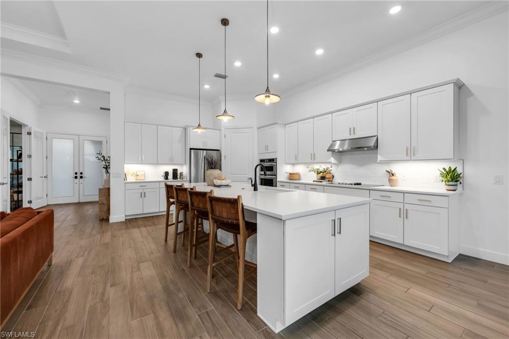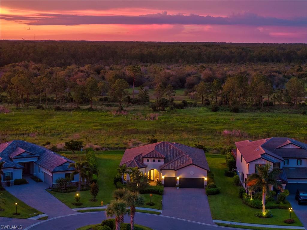 The only Pinnacle Estate Series Pulte home currently on the market on a cul-de-sac, this remarkable residence offers a rare combination of exclusivity, privacy, and refined design, setting it apart as one of the most sought-after properties in the community. Tucked away at the end of a quiet street and backed by a lush, protected preserve, this home blends elegant craftsmanship with serene natural surroundings to create a truly exceptional living experience. Meticulously crafted, the layout features three spacious bedrooms, a versatile den, three full bathrooms, and an oversized three-car garage. Step inside to discover a bright and airy interior filled with natural light, coffered ceilings, wide-plank wood-look tile flooring, and 8-foot interior doors, all contributing to a sense of elevated comfort and space. The expansive great room flows seamlessly into a chef-inspired kitchen, complete with crisp white shaker cabinetry, soft-close drawers, quartz countertops, built-in wall ovens, a sprawling center island with pendant lighting, and a full suite of stainless-steel appliances. Whether you're entertaining guests or enjoying a quiet evening at home, this space is both functional and visually striking. Zero-corner sliding glass doors open fully to a covered lanai that overlooks the preserve, offering panoramic views and absolute serenity. The backyard provides ample space to create your dream outdoor retreat; be it a custom pool, summer kitchen, or tranquil garden escape. The primary suite serves as a private sanctuary, offering peaceful green views, a spa-like en-suite bathroom with dual vanities and a frameless glass shower, and a large walk-in closet. Two additional guest bedrooms, a flexible den, and a separate laundry room round out the thoughtful floor plan. The oversized three-car garage and paver driveway add practicality and curb appeal. Life in The Place at Corkscrew means access to an unmatched array of resort-style amenities, including a sprawling pool with cascading waterfalls, a spa, splash pad, cooling cabanas, and an exhilarating 100-foot water slide. Residents also enjoy a state-of-the-art fitness center, movement studio, tennis, pickleball, basketball, and bocce courts. Dining and social options include an indoor restaurant, outdoor bar, bourbon lounge, and café—plus community fire pits, live entertainment, and more. Additional features include a dog park, playground, child watch services, full-service spa, and 24-hour manned gate access for added peace of mind. Offering a rare blend of thoughtful design, natural beauty, and resort-caliber living, this home is a one-of-a-kind opportunity for the discerning buyer seeking space, style, and a vibrant lifestyle in one of Southwest Florida’s most desirable communities.