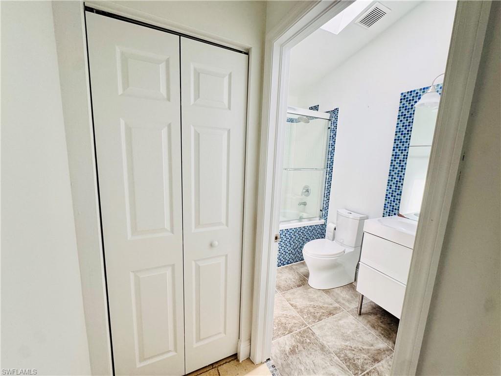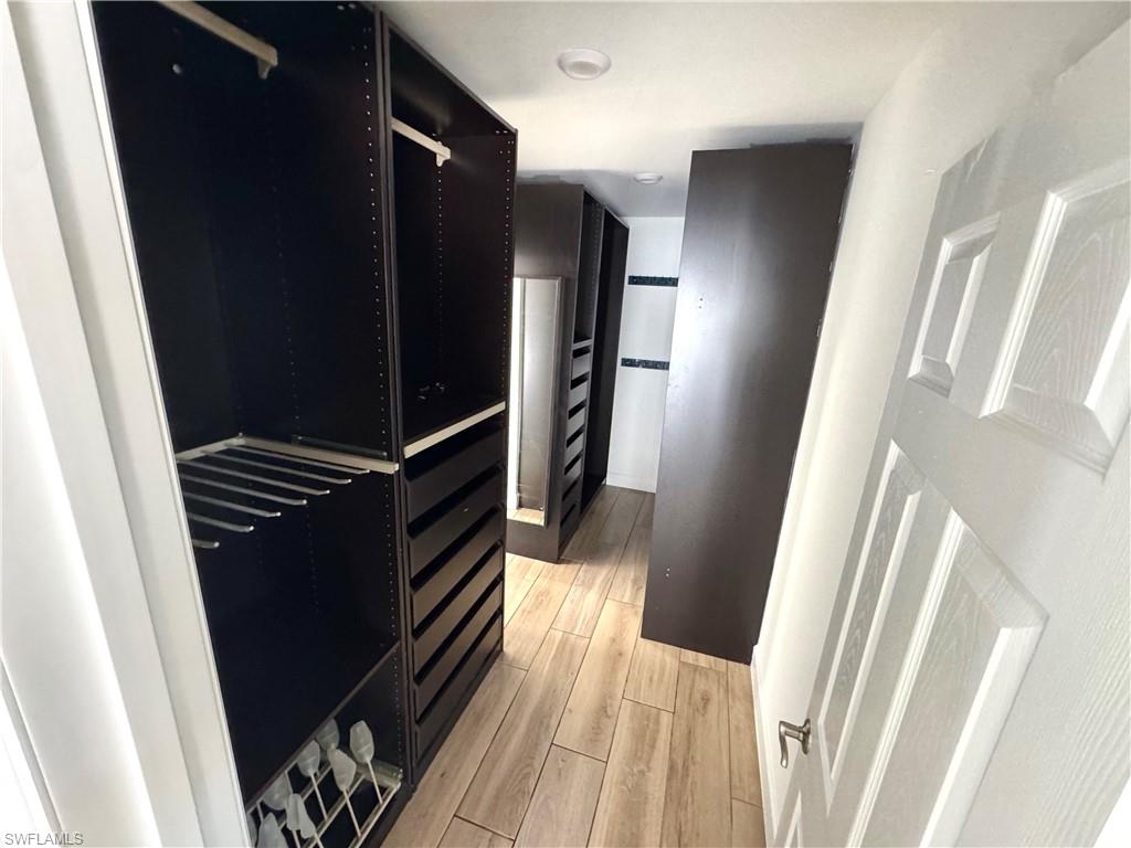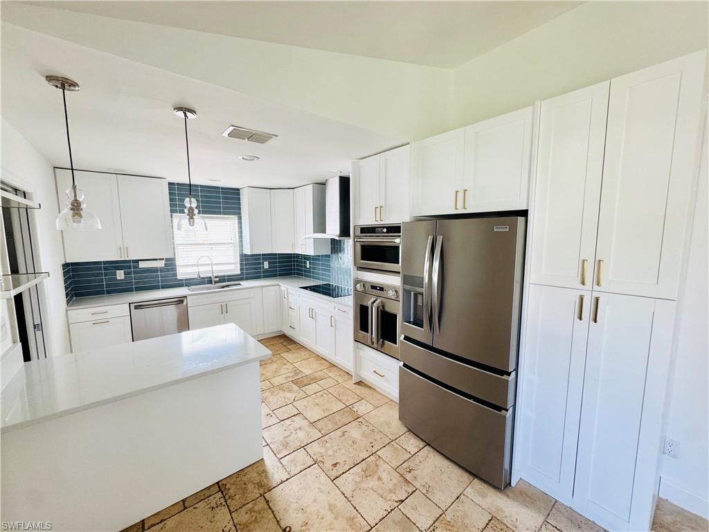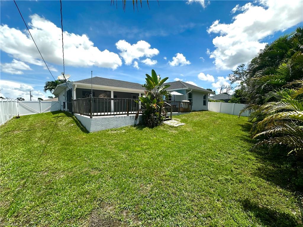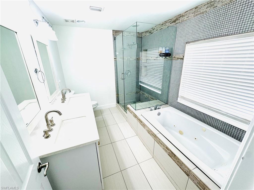 Beautifully updated 3B/2.5Ba home near Coconut Point! Light & Bright open great room floor plan features HURRICANE WINDOWS, NEW ROOF, UPDATED KITCHEN, newly exterior and interior painted, cathedral ceilings, gorgeous travertine flooring throughout main living areas, wood tile in master bedroom, newly updated quartz countertops in kitchen w/stainless appliances, spacious great room with plant shelves, separate dining area or great area for billiards, amazing master bedroom suite featuring beautiful wood tile flooring, tray ceiling, a dream custom closet and a luxurious updated bath complete with seamless glass shower, updated vanities & lighting and a luxurious jetted soaking tub. This split plan features 2 other spacious bedrooms with wood flooring and an updated bath with combination shower/jetted tub & NEW skylight. Enjoy the great outdoors with a huge covered screened lanai, an outside patio! Privacy plus with this fenced yard which has an irrigation system and custom landscaping. Hurry! This is one of the best values in the super convenient Coconut Point area!