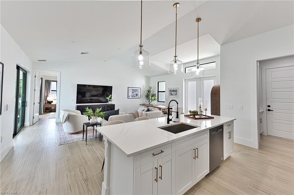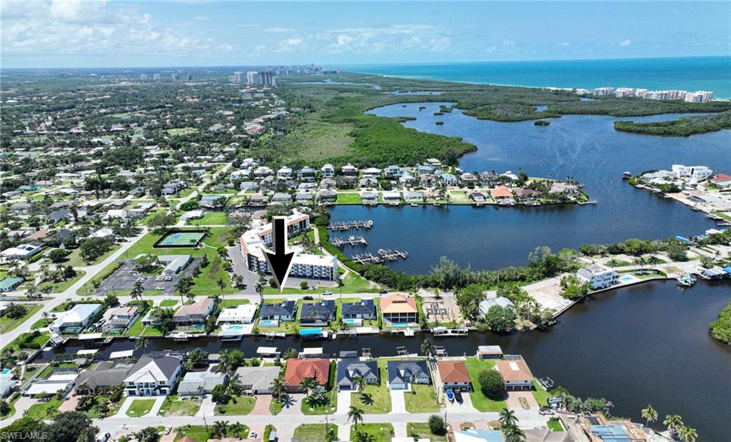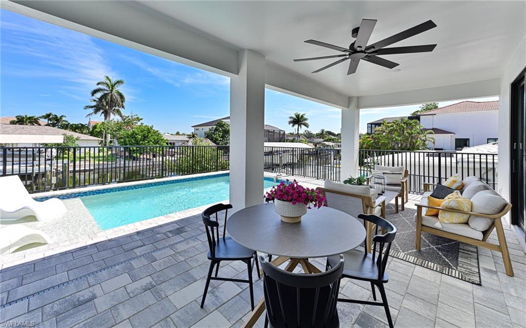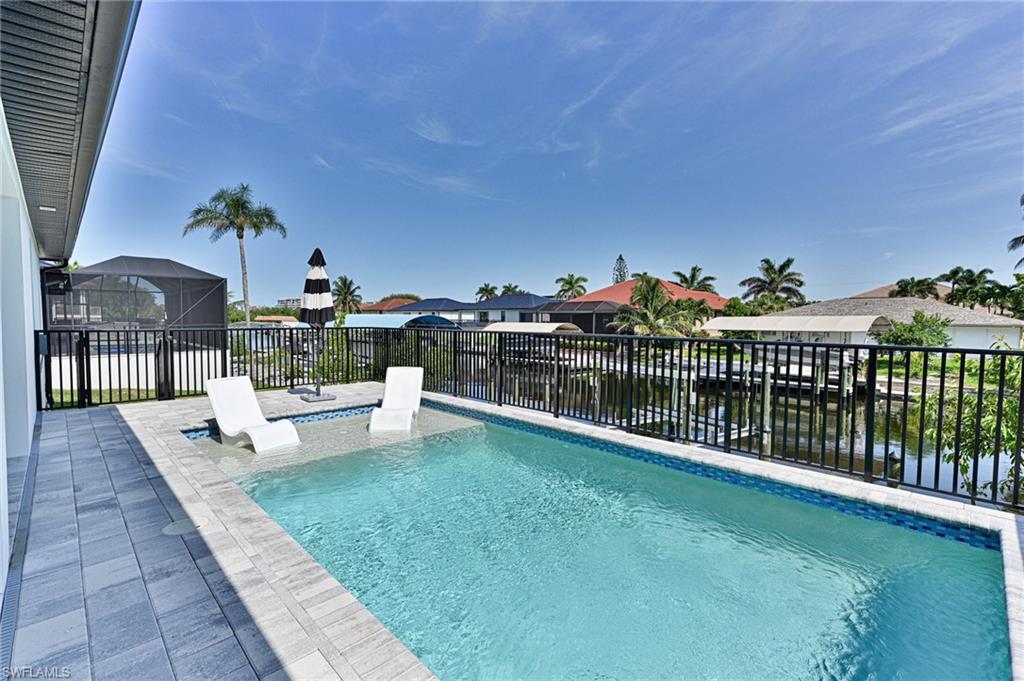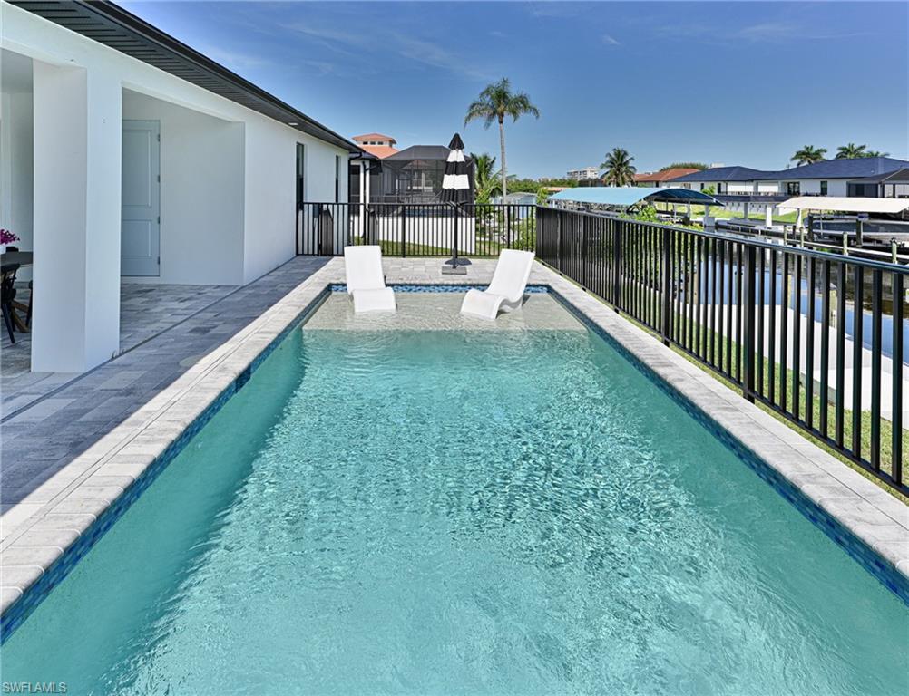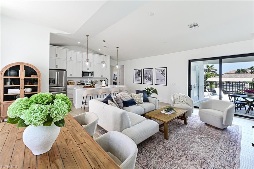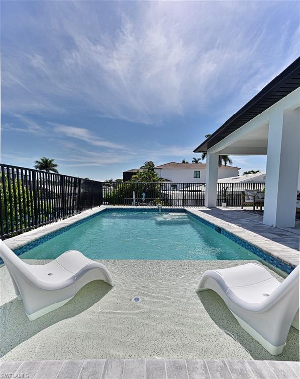 This 2025 new construction 4 bedroom waterfront home offers it all including: perfect Collier County location in Little Hickory Shores on a wide canal, walk or bike to beautiful Barefoot Beach, premier boating out your back door via a new dock and lift with no bridges and quick gulf access, light coastal design inside and out, open floor plan and designer selections throughout, but best of all is PEACE OF MIND with a Tesla roof and battery pack so no generator or propane tanks and lines to worry about and no electric outages, concrete construction to the latest hurricane codes including impact windows and doors and the whole house including the garage and pool were constructed at an elevation above FEMA requirements so flooding is not an issue all while constructed on one level for ease of living. Features include great room, kitchen and dining all open to covered lanai leading to the swimming pool and deck area all overlooking the water and boat dock, volume & vaulted ceilings, large kitchen with island, pantry, quartz countertops custom double stacked Kitchen cabinetry, porcelain wood plank flooring, 8’ doors, smooth drywall finish and designer bath selections. The elevated pool with sundeck includes an oversized covered patio with access to a convenient pool bath. The spacious master suite offers 2 walk in closets with built-ins, oversized frameless shower and floating tub with dual vanities and the 3 guest rooms include an additional en-suite bath. The oversized garage also above flood is finished with epoxy flooring. Little Hickory Shores is centrally located to dining, entertainment, golfing, arenas in Naples and Bonita Springs and is close RSW Airport, the Promenade, Coconut Point, Mercato & Waterside Shops and Old Naples. There is also an option to join the Club at Barefoot Beach which offers casual and fine dining restaurants, pool & beachside food, drinks and chair service, indoor & outdoor bars, tennis courts with pro & a full events calendar. (waitlist with usage during wait period). Note: This property is a perfect full time homestead residence or winter home residence with no worries while away during the summer, a come and go property that earns enough to carry itself when you are not in residence or a full time rental property since no rental restrictions and no HOA fees. Designer turnkey furniture and furnishings package can be purchased for $99,900.