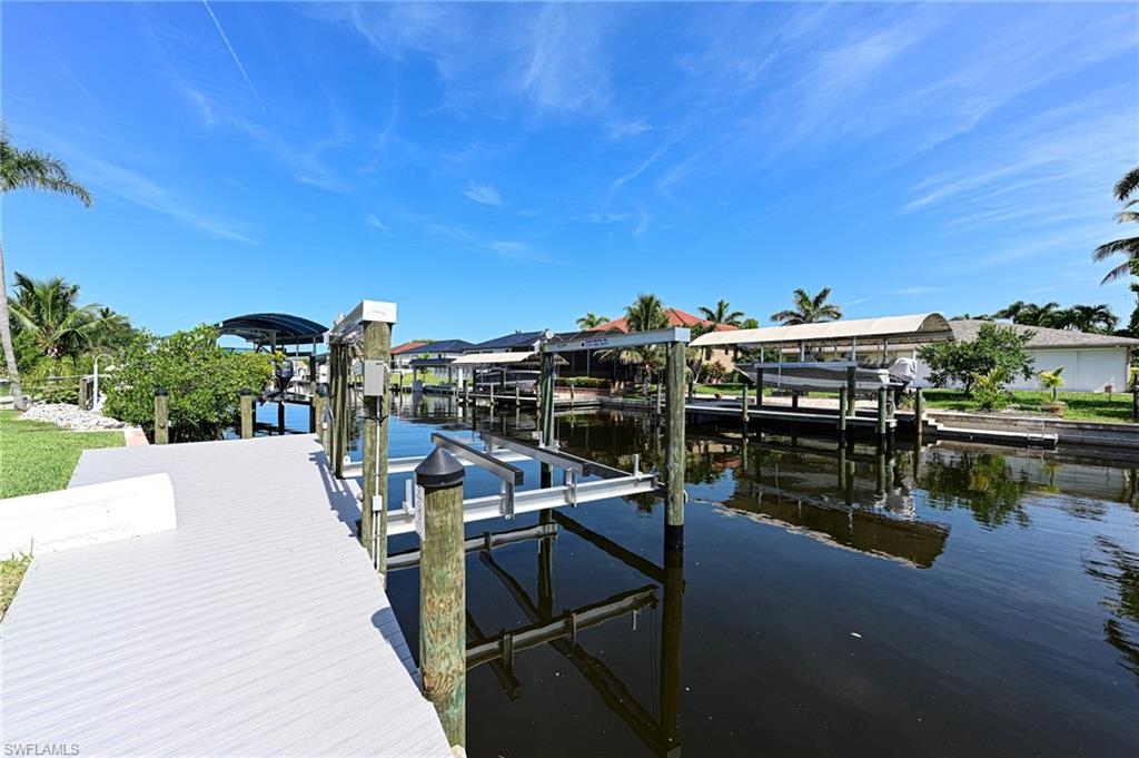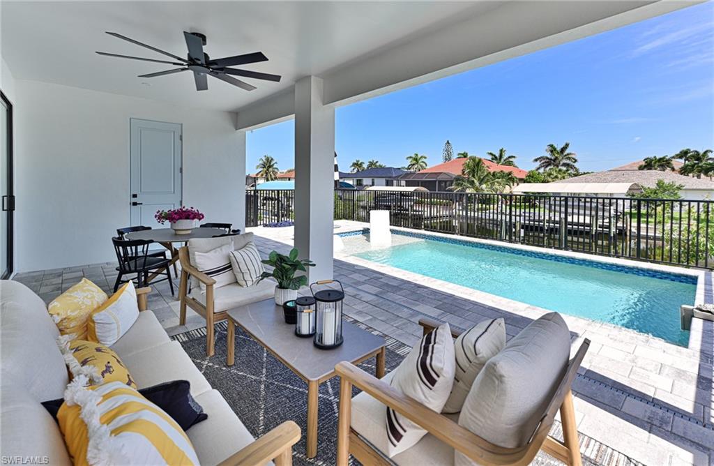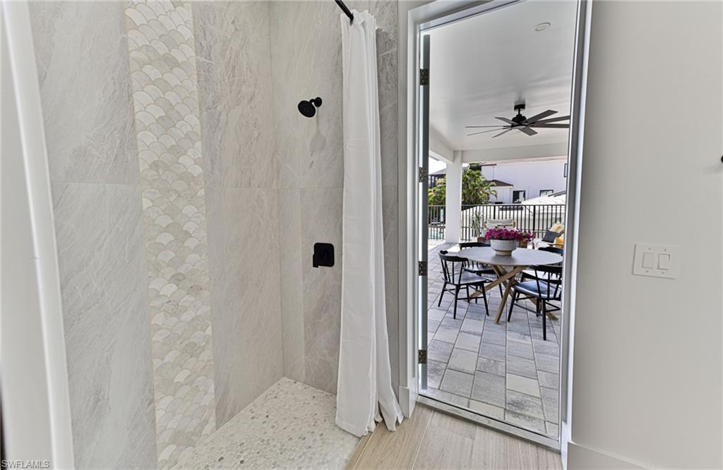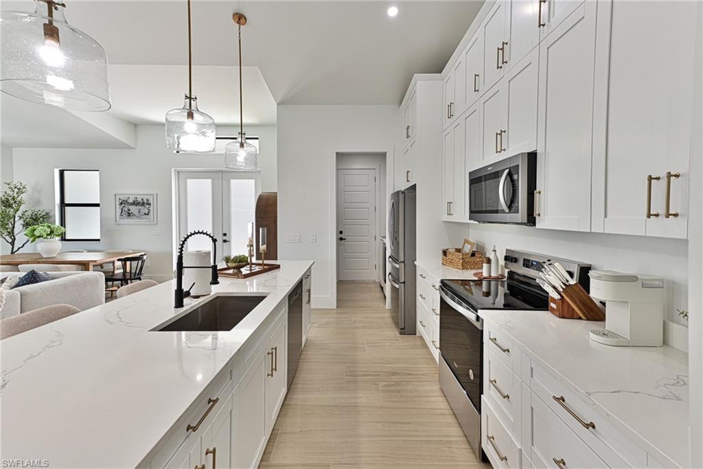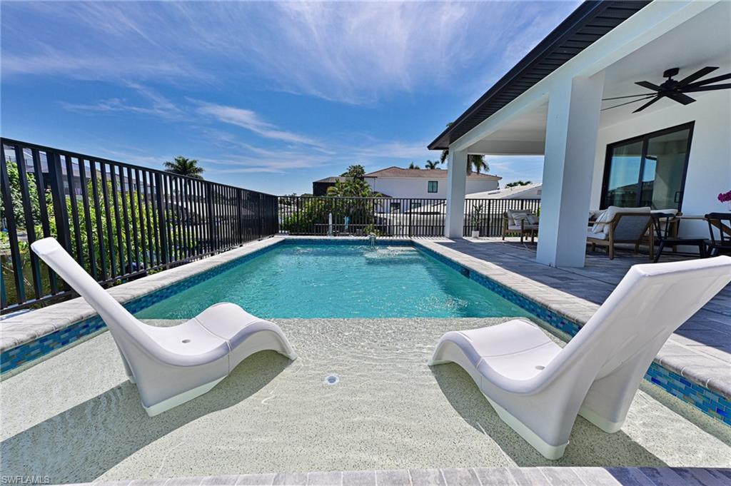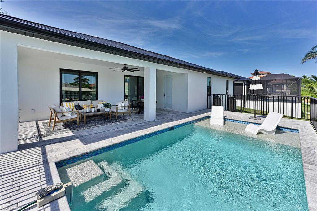 This 2025 new construction 4 bedroom waterfront home offers it all including: perfect Collier County location in Little Hickory Shores on a wide canal, walk or bike to beautiful Barefoot Beach, premier boating out your back door via a new dock and lift with no bridges and quick gulf access, light coastal design inside and out, open floor plan and designer selections throughout, but best of all is PEACE OF MIND with a Tesla roof and battery pack so no generator or propane tanks and lines to worry about and no electric outages, concrete construction to the latest hurricane codes including impact windows and doors and the whole house including the garage and pool were constructed at an elevation above FEMA requirements so flooding is not an issue all while constructed on one level for ease of living. Features include great room, kitchen and dining all open to covered lanai leading to the swimming pool and deck area all overlooking the water and boat dock, volume & vaulted ceilings, large kitchen with island, pantry, quartz countertops custom double stacked Kitchen cabinetry, porcelain wood plank flooring, 8’ doors, smooth drywall finish and designer bath selections. The elevated pool with sundeck includes an oversized covered patio with access to a convenient pool bath. The spacious master suite offers 2 walk in closets with built-ins, oversized frameless shower and floating tub with dual vanities and the 3 guest rooms include an additional en-suite bath. The oversized garage also above flood is finished with epoxy flooring. Little Hickory Shores is centrally located to dining, entertainment, golfing, arenas in Naples and Bonita Springs and is close RSW Airport, the Promenade, Coconut Point, Mercato & Waterside Shops and Old Naples. There is also an option to join the Club at Barefoot Beach which offers casual and fine dining restaurants, pool & beachside food, drinks and chair service, indoor & outdoor bars, tennis courts with pro & a full events calendar. (waitlist with usage during wait period). Note: This property is a perfect full time homestead residence or winter home residence with no worries while away during the summer, a come and go property that earns enough to carry itself when you are not in residence or a full time rental property since no rental restrictions and no HOA fees. Designer turnkey furniture and furnishings package can be purchased for $99,900.