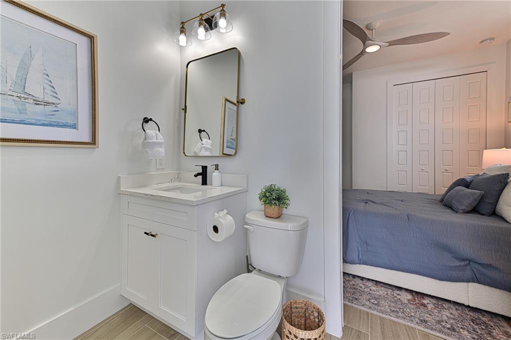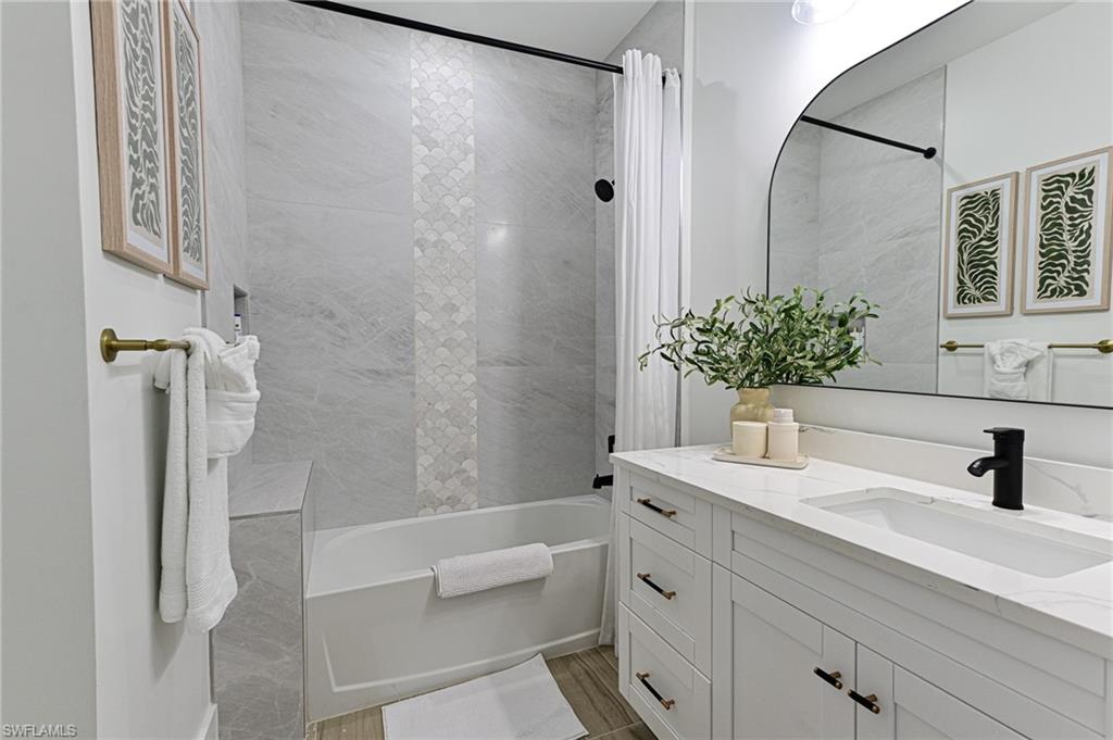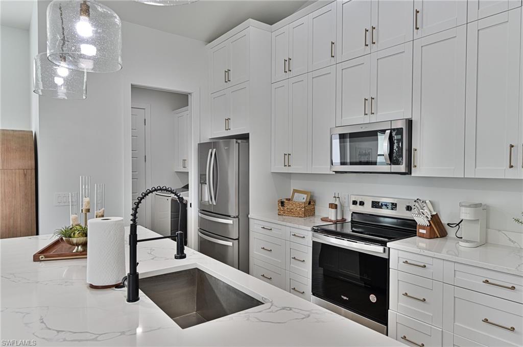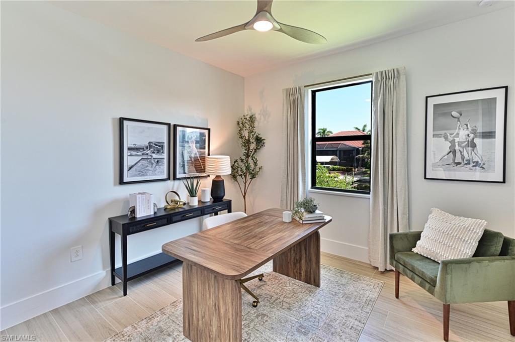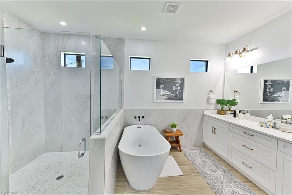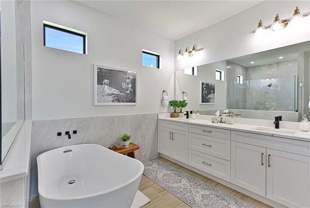 This 2025 new construction 4 bedroom waterfront home offers it all including: perfect Collier County location in Little Hickory Shores on a wide canal, walk or bike to beautiful Barefoot Beach, premier boating out your back door via a new dock and lift with no bridges and quick gulf access, light coastal design inside and out, open floor plan and designer selections throughout, but best of all is PEACE OF MIND with a Tesla roof and battery pack so no generator or propane tanks and lines to worry about and no electric outages, concrete construction to the latest hurricane codes including impact windows and doors and the whole house including the garage and pool were constructed at an elevation above FEMA requirements so flooding is not an issue all while constructed on one level for ease of living. Features include great room, kitchen and dining all open to covered lanai leading to the swimming pool and deck area all overlooking the water and boat dock, volume & vaulted ceilings, large kitchen with island, pantry, quartz countertops custom double stacked Kitchen cabinetry, porcelain wood plank flooring, 8’ doors, smooth drywall finish and designer bath selections. The elevated pool with sundeck includes an oversized covered patio with access to a convenient pool bath. The spacious master suite offers 2 walk in closets with built-ins, oversized frameless shower and floating tub with dual vanities and the 3 guest rooms include an additional en-suite bath. The oversized garage also above flood is finished with epoxy flooring. Little Hickory Shores is centrally located to dining, entertainment, golfing, arenas in Naples and Bonita Springs and is close RSW Airport, the Promenade, Coconut Point, Mercato & Waterside Shops and Old Naples. There is also an option to join the Club at Barefoot Beach which offers casual and fine dining restaurants, pool & beachside food, drinks and chair service, indoor & outdoor bars, tennis courts with pro & a full events calendar. (waitlist with usage during wait period). Note: This property is a perfect full time homestead residence or winter home residence with no worries while away during the summer, a come and go property that earns enough to carry itself when you are not in residence or a full time rental property since no rental restrictions and no HOA fees. Designer turnkey furniture and furnishings package can be purchased for $99,900.