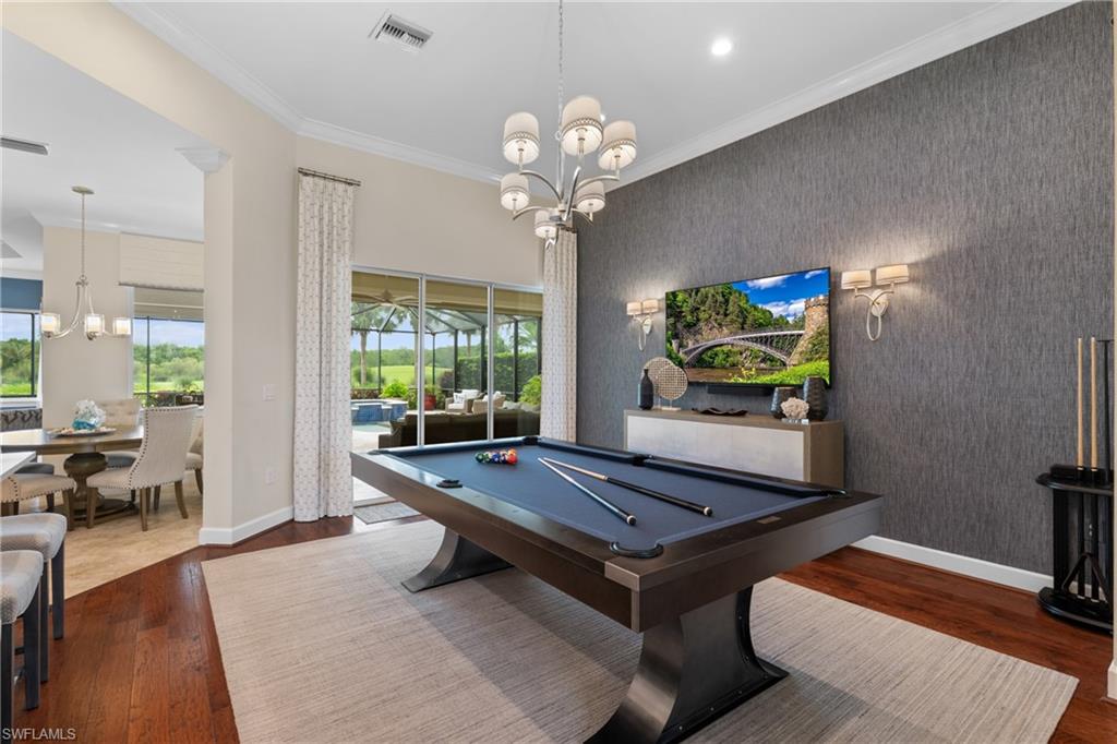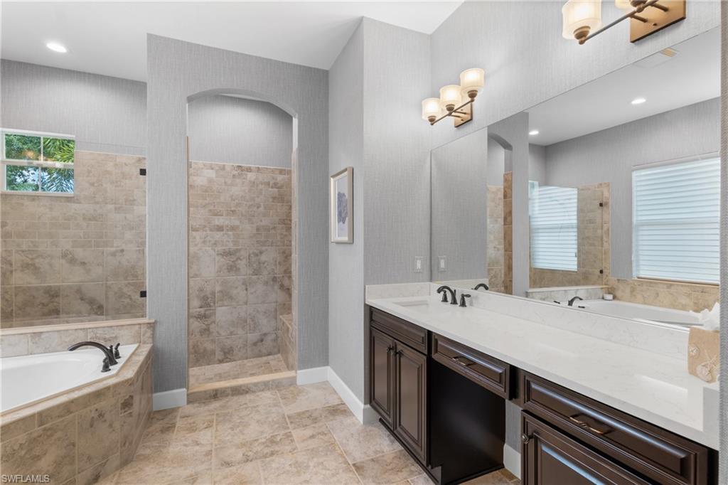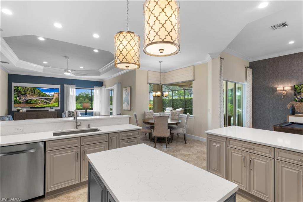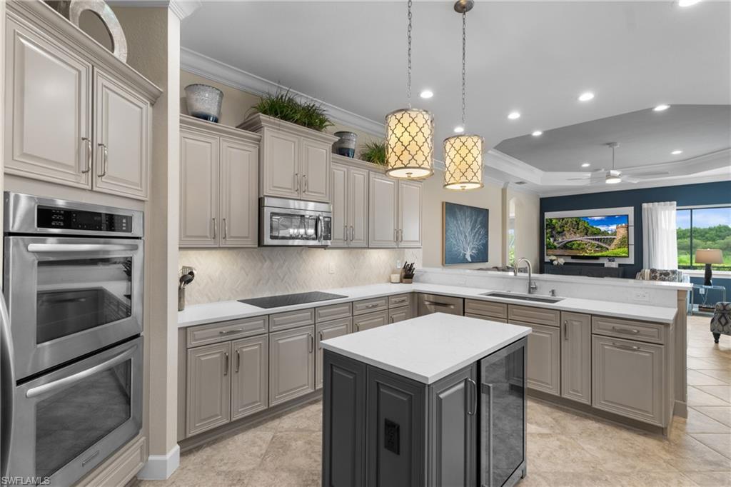 Live the Ultimate Vacation Lifestyle in The Quarry! This beautifully remodeled 4 Bedroom plus Den, 4 full bath, 3 car garage home is perfectly situated overlooking the 14th fairway with picturesque golf course, lake, and preserve views with no roof tops in sight! Custom features and professional design gives this home a model like feel and is a true one of a kind. From the moment you walk in the door, you are greeted with a wide open Great Room style floorplan with two sliding glass doors to the lanai and spacious pool area. The spacious kitchen is the heart of the home with center island, two breakfast bars with seating for 8, updated quartz countertops, custom tile backsplash, double wall ovens, wine cooler, and two additional beverage coolers, making this the perfect kitchen for entertaining. The luxurious Primary Suite features a sliding glass door to the lanai, spacious closets with cabinetry, and bath boasting dual sinks, walk in shower, soaking tub, and custom wall paper detail. Enjoy days around the heated pool/spa and al fresco dining on the lanai complete with travertine marble deck, raised sun deck, spa, and wet deck. Other fine appointments of this home include: wood floors throughout living room, dining room, den, and primary bedroom; custom window treatments throughout; custom wallpaper accents; special order chandeliers, lights, and fans; crown molding throughout; motorized roll down hurricane shutters on the lanai and front foyer; freshly painted interior; two brand new HVACs; air conditioned three car garage; and more! Furniture & decor package available! The Quarry is an exceptional lakefront community offering unparalleled amenities and a lifestyle like no other. Enjoy boating, golf, tennis, pickleball, bocce ball, a Tiki Bar, poolside food and drink service, a fully equipped gym, and a variety of social activities. The recently renovated and expanded “Lake Lodge & Beach Club” provides the perfect setting for relaxation, while over 500 acres of navigable lakes (with boat slips available for lease) offer endless opportunities for water enthusiasts. The private 18-hole golf club features optional golf and social memberships, providing an elite experience for golf lovers (full golf memberships available/no waitlist). Schedule your private showing today!