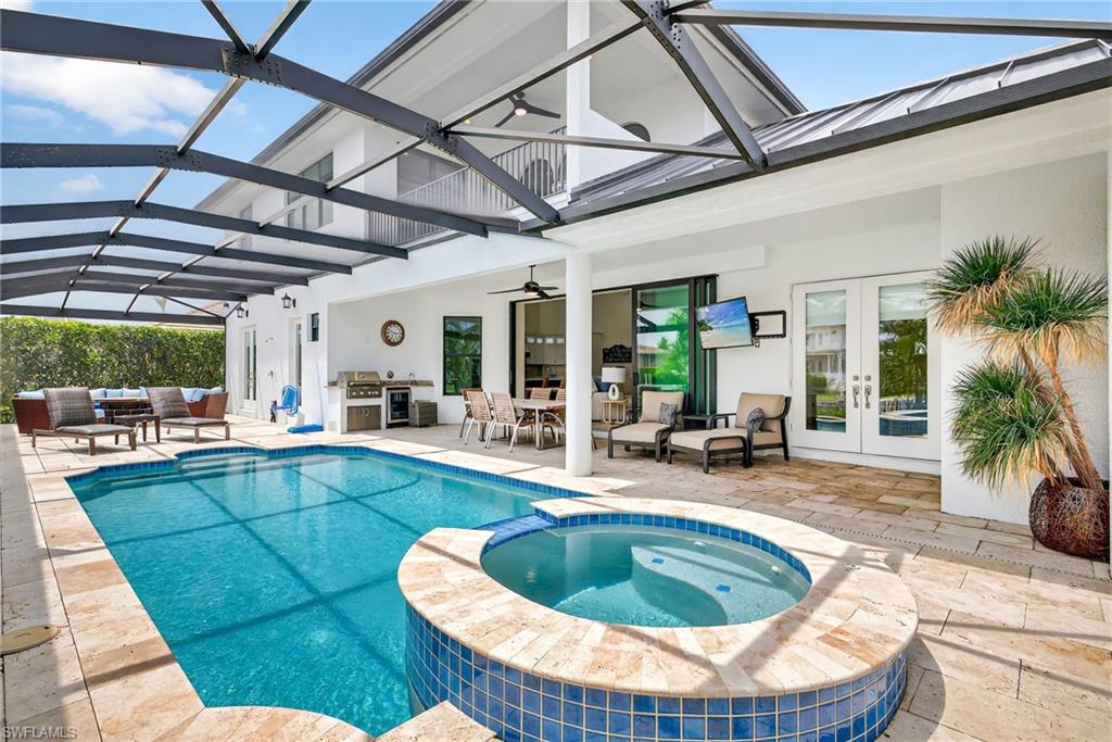 Welcome to 1649 San Marco Road, an extraordinary two-story home offering 3,550 square feet of luxurious living space, 4 bedrooms plus a den, 3 full bathrooms, and a private Gulf-access dock with coveted southern exposure. Built in 2015 and renovated in 2024, this timeless residence effortlessly blends timeless coastal design with modern luxury. This home stands out not only for its incredible design but also for its great rental potential, due to its open, wide-water views and prime location. This is the best-priced home available in the area, it offers a rare opportunity for both personal enjoyment and investment potential. Enter through elegant French doors into a light-filled great room with soaring ceilings, impact-rated windows and doors, and an open-concept layout that enhances the flow of the space. The gourmet kitchen is a chef's dream, featuring custom cabinetry, a wine cooler, built-in appliances, and a generous walk-in pantry. The expansive primary suite, located on the main floor, offers a private retreat with custom-built closet cabinetry and a spa-inspired bathroom featuring dual vanities, a soaking tub, and a large walk-in shower with multiple shower heads. Upstairs, a flex room opens to a balcony, ideal for a home office, media room, or quiet lounge space. This level also includes a well-appointed guest bedroom and spacious guest bathroom, offering privacy and comfort for family or visitors. The 4th bedroom features a Murphy Bed, creating a multi-purpose room for flexibility. Step outside to your personal slice of paradise, where a screened-in pool and spa with a heater/chiller are surrounded by lush tropical landscaping. The outdoor kitchen, with built-in grill and pool bath, is perfect for dining and entertaining. The private dock, equipped with two boat lifts and twin jet ski lifts, offers direct access to the Gulf through the scenic Marco Island waterways. Additional features include a standing seam metal roof, stucco exterior, a two-car epoxy floor garage, Lutron lighting system, dual-zone HVAC, and impact glass throughout. This home is a true gem. Located just minutes from Marco Island’s pristine beaches, world-class dining, and boutique shopping, this property offers unmatched access to the best of island living. Enjoy boating, breathtaking sunsets, and a vibrant community—whether you're sipping morning coffee on the lanai, cruising through the Ten Thousand Islands, or dining by the water, life at 1649 San Marco Road delivers the perfect blend of relaxation and sophistication.