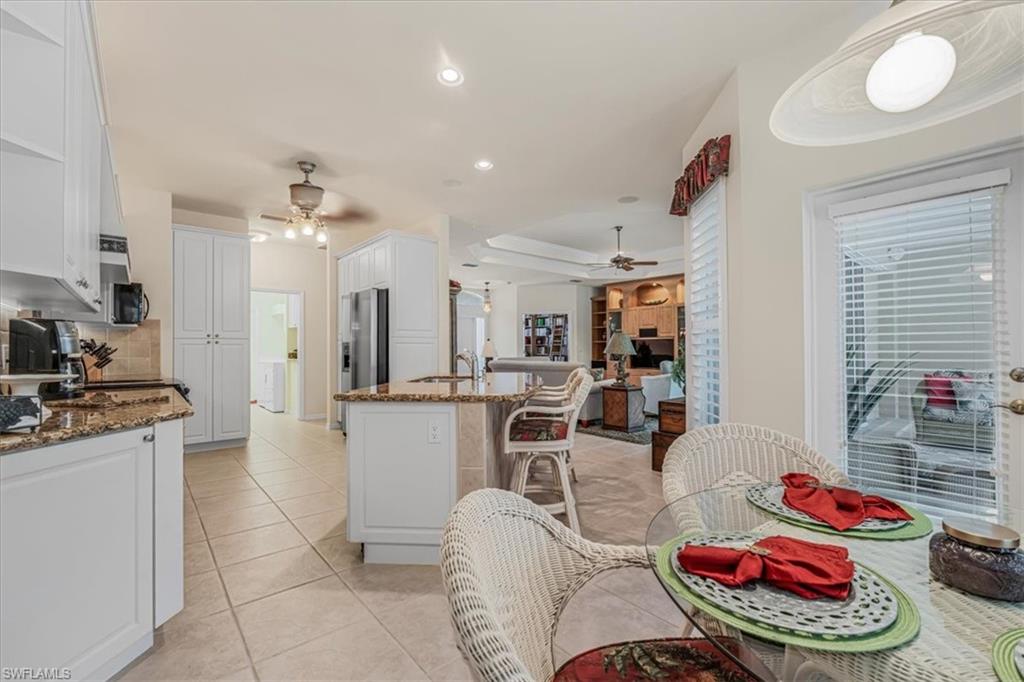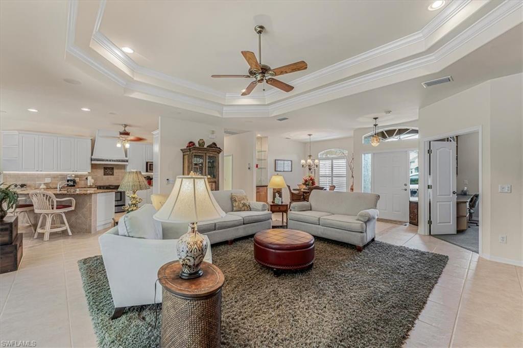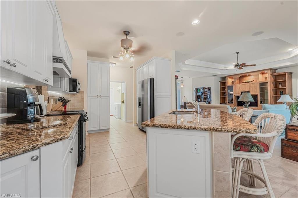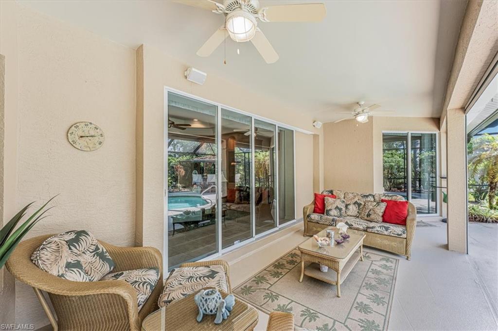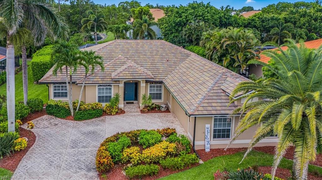 !!!Huge price Reduction!!! Welcome to 9792 Alhambra Lanes, located in the exclusive gated community of Spanish Wells in Bonita Springs. This stunning home offers 3 bedrooms plus a den, 3.5 bathrooms, and approximately 2,500 sq. ft. of living space. Built in 2003, it combines elegant design with resort-style amenities and tropical privacy, and a custom-built tiki bar by the pool area. The home features a built-in surround sound system in the main living area, master bathroom, office, and outdoor dine-in space perfect for both relaxation and entertaining. Enjoy spacious living with an open floor plan, abundant natural light, and custom finishes throughout. The gourmet kitchen features granite countertops, a center island, breakfast bar, stainless steel appliances, and pull-out drawers and shelves. The living room includes a built-in entertainment wall and double tray ceilings. Step outside to a screened lanai with a prestige pool, and lush botanical garden – a true backyard paradise. The home offers hurricane-impact windows, and doors with electric shutters on lanai sliders. The master suite includes his and her walk-in closets, a garden tub, separate shower, and dual sinks. One guest room has a private in-suite bath. Additional highlights include custom window treatments, a library with built-in bookshelves, and an oversized side-load garage. This turnkey property with optional Country Club membership includes access to a 27-hole golf course, tennis, fitness, dining, and more. Spanish Wells is just 10 minutes from Bonita Beach, close to downtown, Coconut Point Mall, shopping, library, and the SW Florida Regional Chamber of Commerce. This is a rare opportunity to own a private, luxurious home in one of Bonita Springs' most desirable communities.