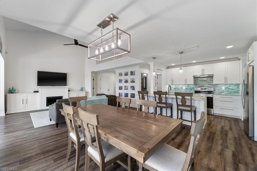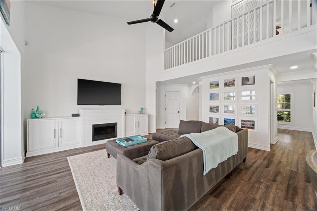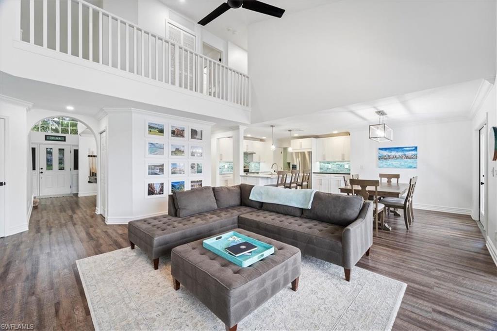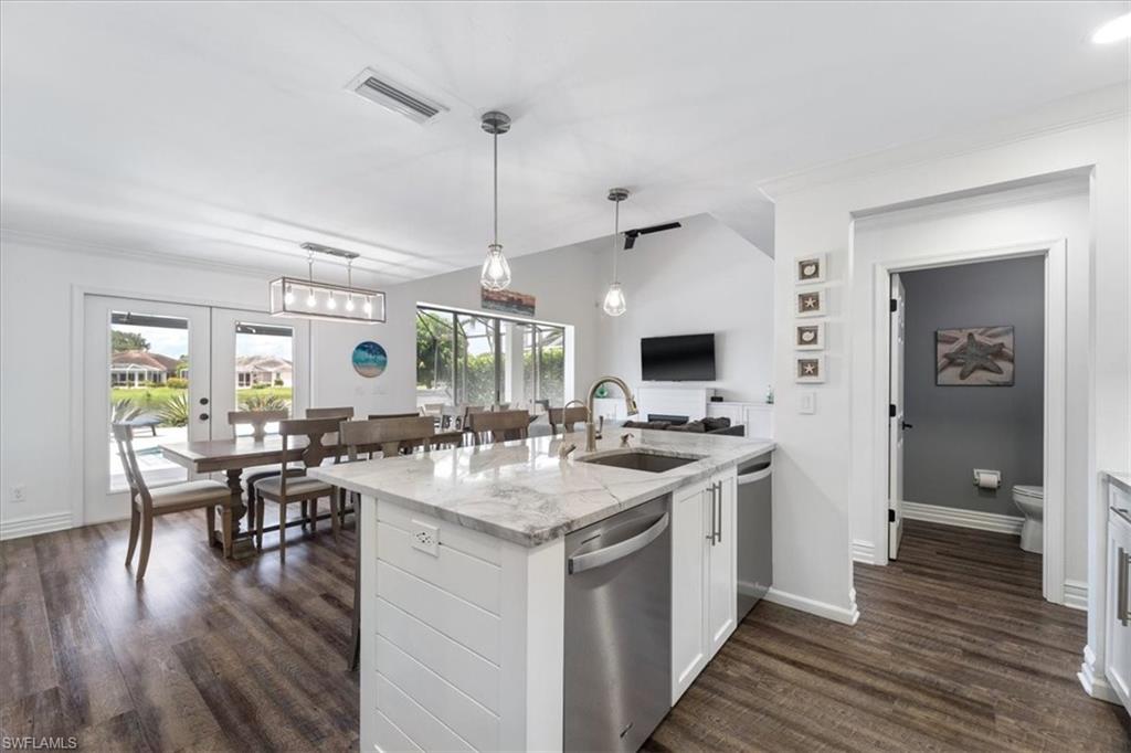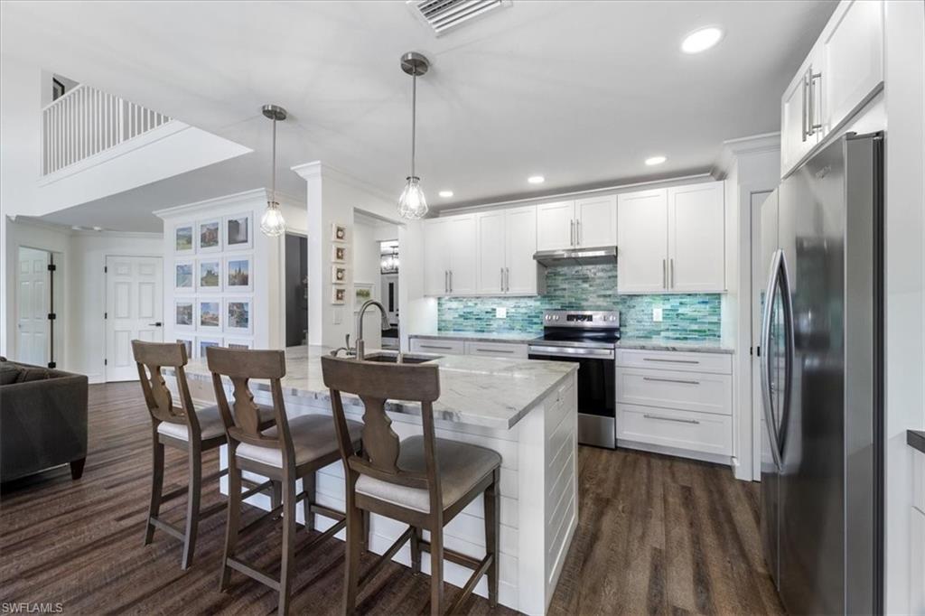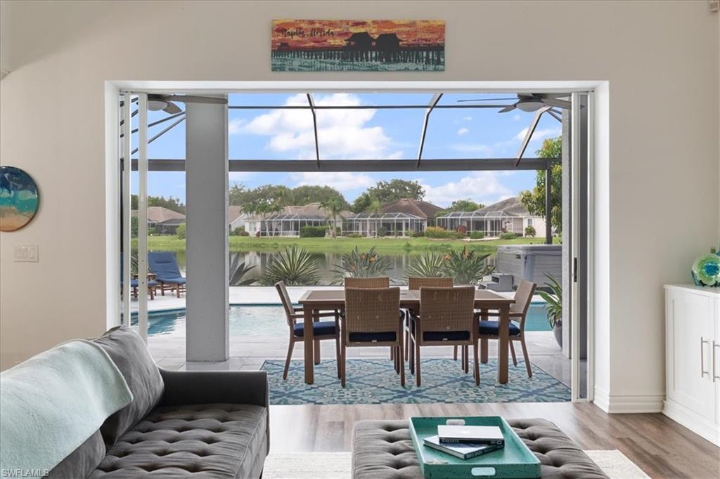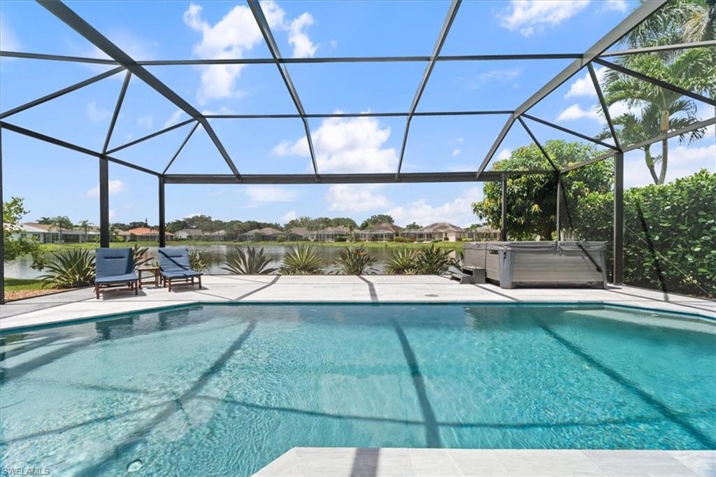 Welcome to an exquisite residence at 7550 Citrus Hill Lane in Naples, FL, where elegance meets comfort in this charming home. Spanning 2,412 square feet, this beautifully appointed four-bedroom, two-and-a-half-bathroom haven is nestled on a generous lakefront lot, offering an inviting sanctuary for discerning homeowners. Step inside to discover a welcoming ambiance with wood-like flooring gracing the main living area, setting a sophisticated tone throughout. The heart of the home, the stunning kitchen, is a chef's delight, featuring pristine white cabinets, luxurious quartz countertops, and a striking coastal blue/green backsplash that adds a touch of vibrancy and charm. You'll appreciate the sink reserve osmosis system for pure drinking and cooking water, complementing the whole-house water softener for enhanced comfort. Retreat to the serene master suite, where the master bathroom offers a spa-like experience with dual vanities, a spacious shower, and a relaxing soaking tub. The California closet provides ample space for a well-organized wardrobe. Designed for both work and play, this home includes a dedicated office space, catering to those who appreciate convenience and functionality. An AC duct air purifier ensures a healthy and fresh indoor environment. Step outside to the screened-in pool area, an ideal setting for relaxation or entertaining guests. Enjoy the tranquil views of the lake from the outdoor seating area, complete with a TV for ultimate leisure and enjoyment. The backyard is a true oasis, featuring an organic garden and several fruit trees, perfect for those who love fresh produce. The Orchards is a serene, gated enclave that promises an extraordinary lifestyle. Residents can enjoy a network of walking and biking trails, two heated swimming pools, a state-of-the-art fitness center, and courts for tennis and pickleball. Located in North Naples, close to shopping, dining, and SWFL's beautiful beaches, this home combines luxury and convenience with exceptional value, all while maintaining low HOA fees
