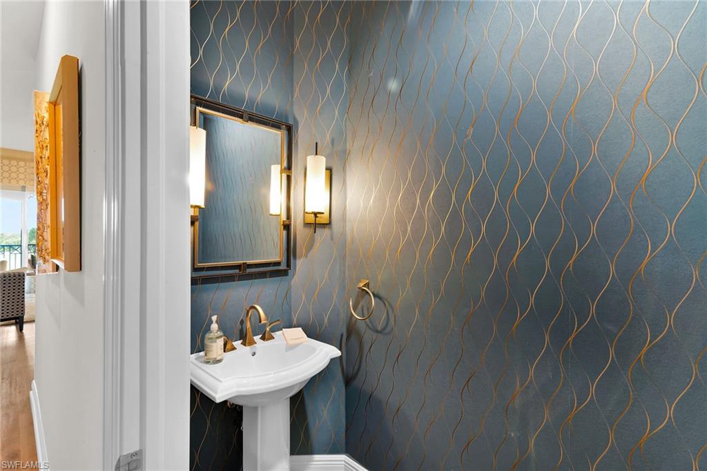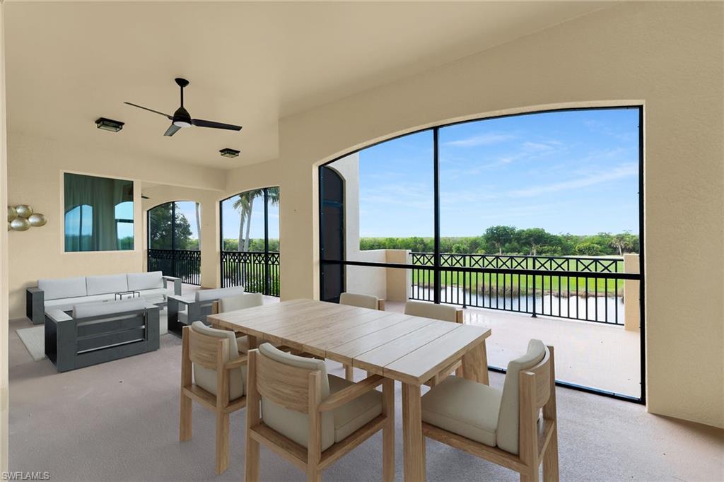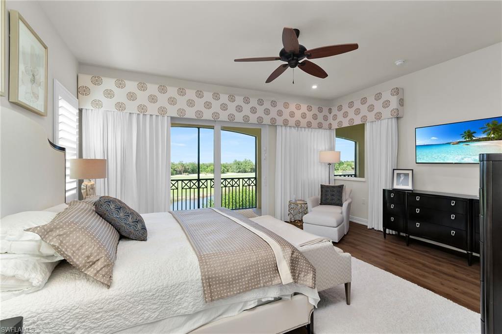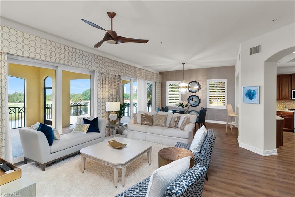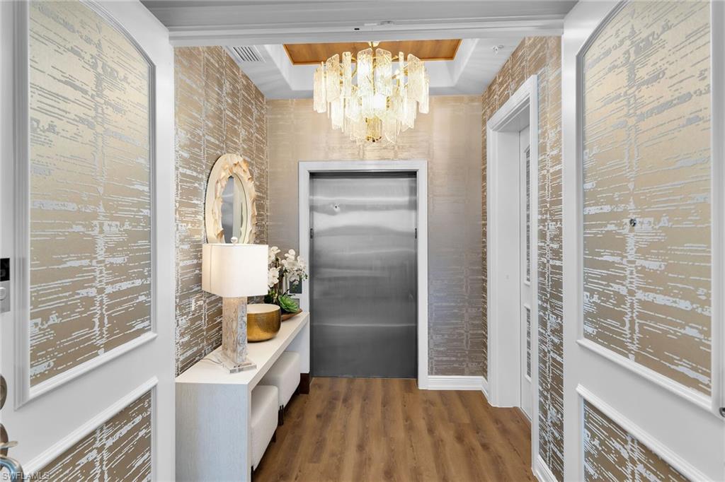 Step into elevated luxury in this exquisitely furnished second-floor condo in Hammock Bay, where every detail reflects timeless design and refined living. A private elevator opens to a sophisticated interior featuring curated pieces from Robb & Stucky and other premier furniture designers, complemented by custom wallpaper, designer lighting, elegant draperies, and architectural cornices. The gourmet kitchen is outfitted with KitchenAid stainless steel appliances, a center island, breakfast bar, and bespoke cabinetry—ideal for both entertaining and everyday enjoyment. The expansive owner’s suite offers lanai access, dual vanities, a jetted soaking tub, a large walk-in shower, and built-in closets, while two guest bedrooms provide comfort and versatility for family or visitors. A stylish powder room adds additional convenience. Premium Luxury Vinyl flooring with SPC for extreme durability are throughout the home. Enjoy peaceful mornings and sweeping views of the lake and golf course from the oversized screened lanai and, most uniquely, the private sundeck—a rare feature found only in select second-floor residences at Hammock Bay. Recent enhancements include a new roof, impact-resistant windows, an extended driveway, and a two-car garage. This residence includes access to a private Borghese neighborhood pool, along with the broader resort-style amenities of Hammock Bay—featuring an on-site tiki bar and restaurant. Ideally positioned between Naples and Marco Island, this gated, pet-friendly community offers a luxurious lifestyle in one of Southwest Florida’s most sought-after locations.