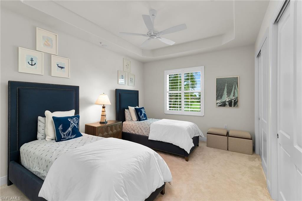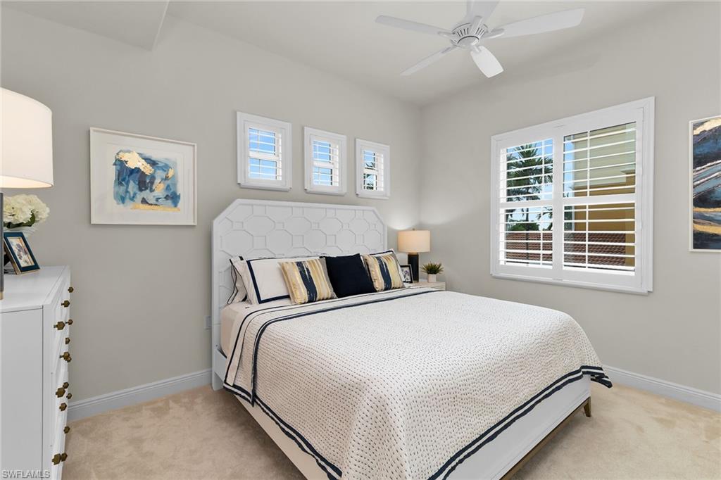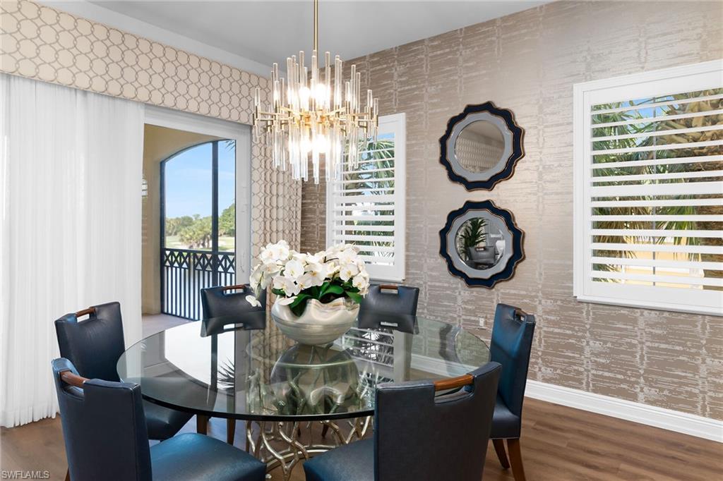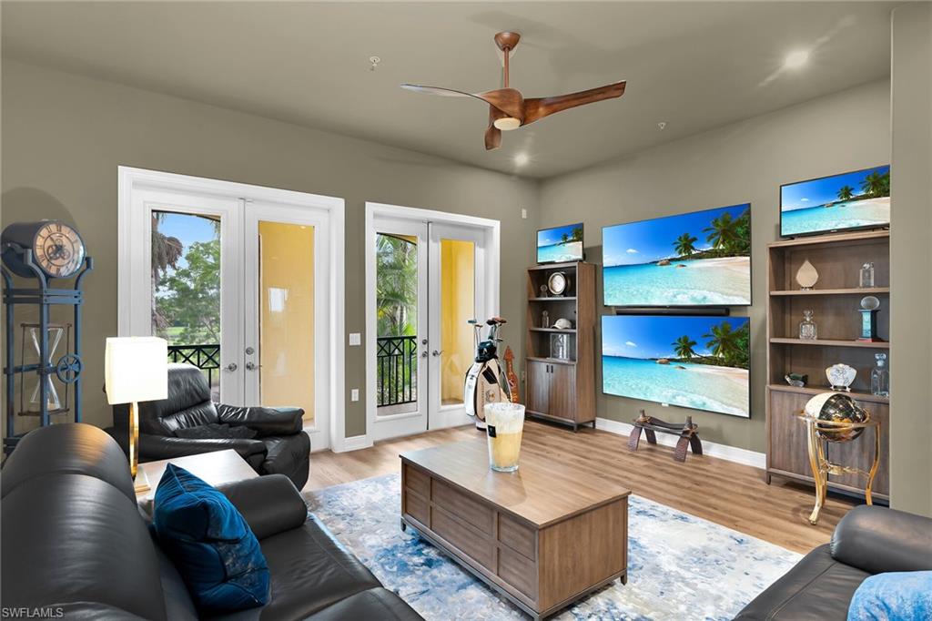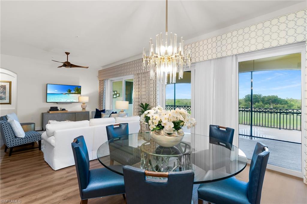 Step into elevated luxury in this exquisitely furnished second-floor condo in Hammock Bay, where every detail reflects timeless design and refined living. A private elevator opens to a sophisticated interior featuring curated pieces from Robb & Stucky and other premier furniture designers, complemented by custom wallpaper, designer lighting, elegant draperies, and architectural cornices. The gourmet kitchen is outfitted with KitchenAid stainless steel appliances, a center island, breakfast bar, and bespoke cabinetry—ideal for both entertaining and everyday enjoyment. The expansive owner’s suite offers lanai access, dual vanities, a jetted soaking tub, a large walk-in shower, and built-in closets, while two guest bedrooms provide comfort and versatility for family or visitors. A stylish powder room adds additional convenience. Premium Luxury Vinyl flooring with SPC for extreme durability are throughout the home. Enjoy peaceful mornings and sweeping views of the lake and golf course from the oversized screened lanai and, most uniquely, the private sundeck—a rare feature found only in select second-floor residences at Hammock Bay. Recent enhancements include a new roof, impact-resistant windows, an extended driveway, and a two-car garage. This residence includes access to a private Borghese neighborhood pool, along with the broader resort-style amenities of Hammock Bay—featuring an on-site tiki bar and restaurant. Ideally positioned between Naples and Marco Island, this gated, pet-friendly community offers a luxurious lifestyle in one of Southwest Florida’s most sought-after locations.